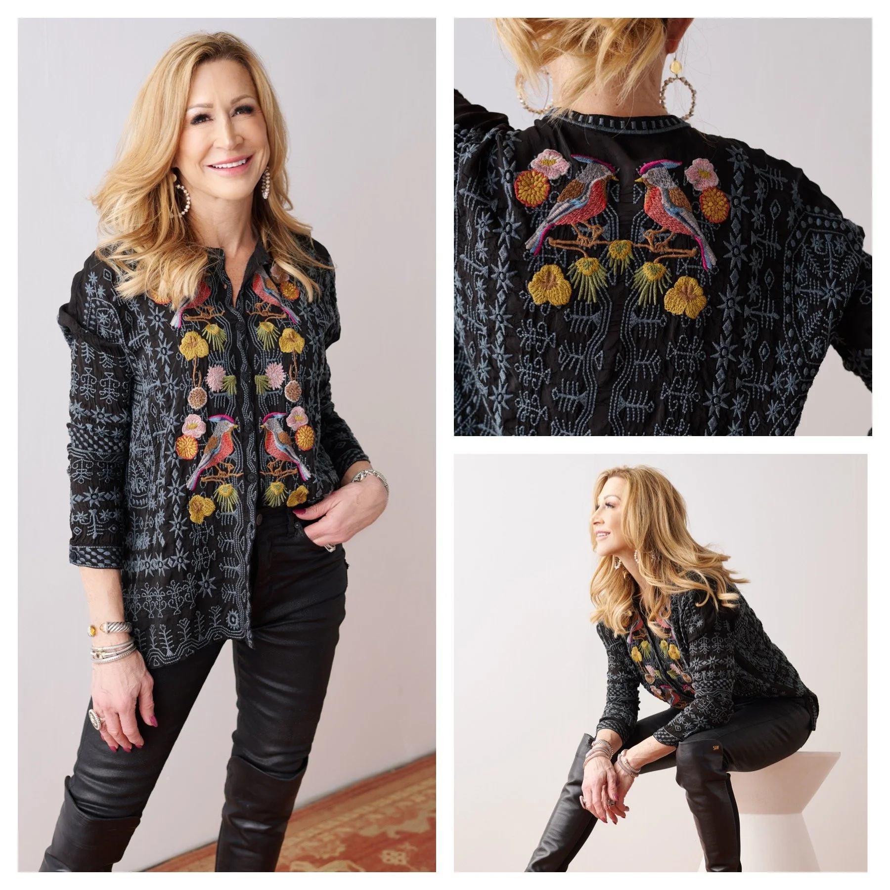 The detail on the blouse above (also from Johnny was) is exquisite! I’ve paired it with the same black pants and over-the-knee boots from Stuart Weitzman. Going into spring, I’ll change out the boots for sandals and wear this blouse with jeans! I tucked in only half of the blouse in the front for a more fashion forward look…