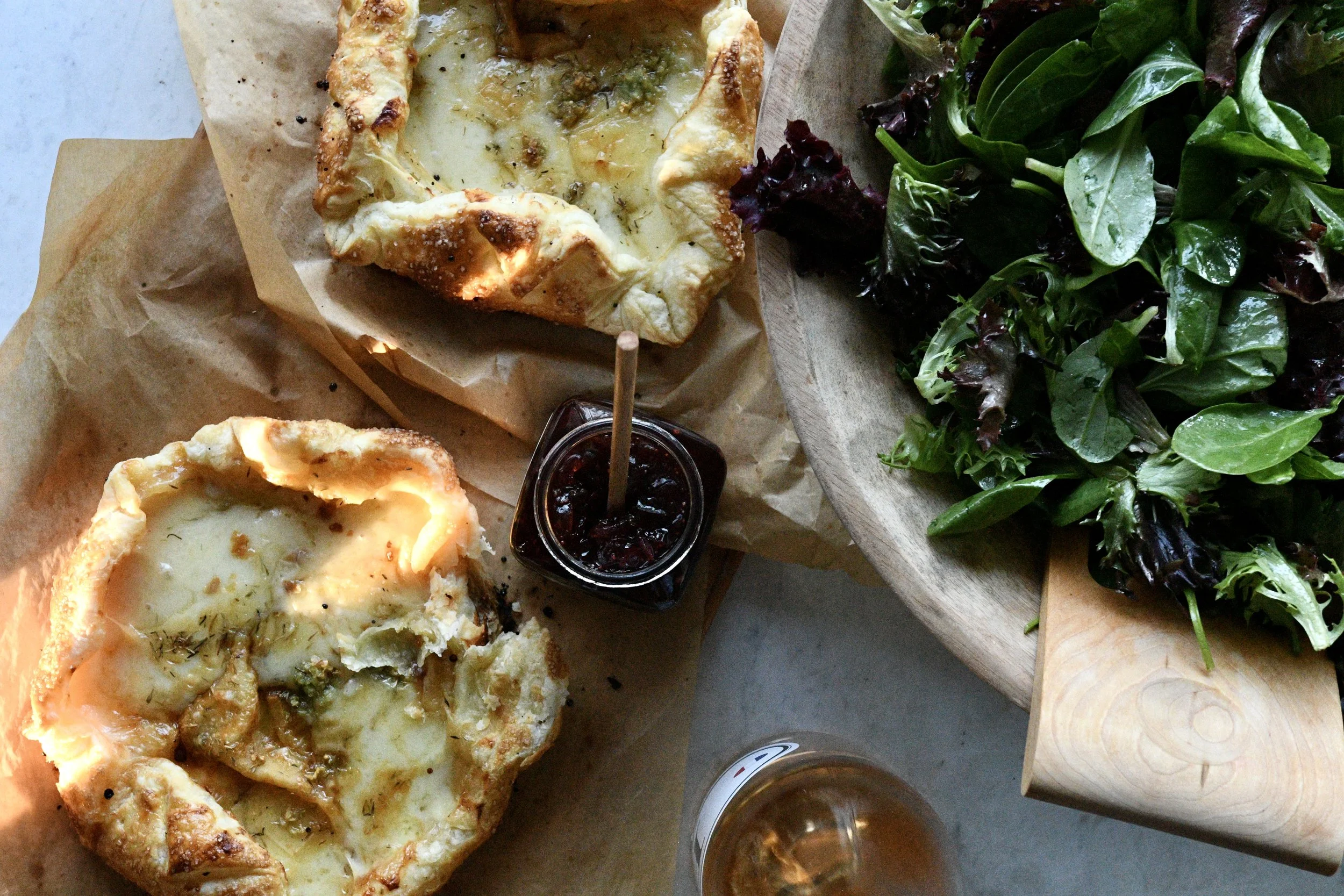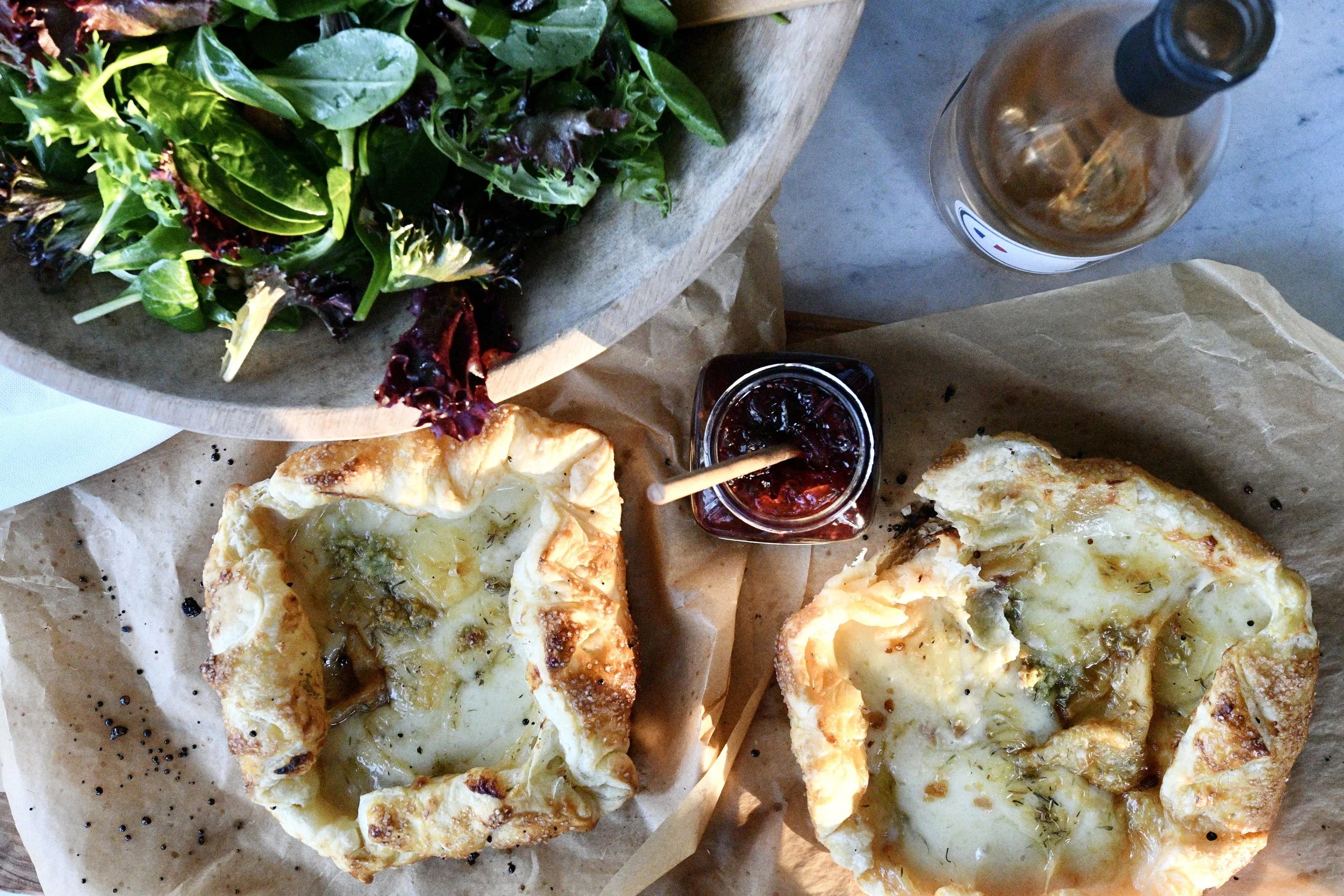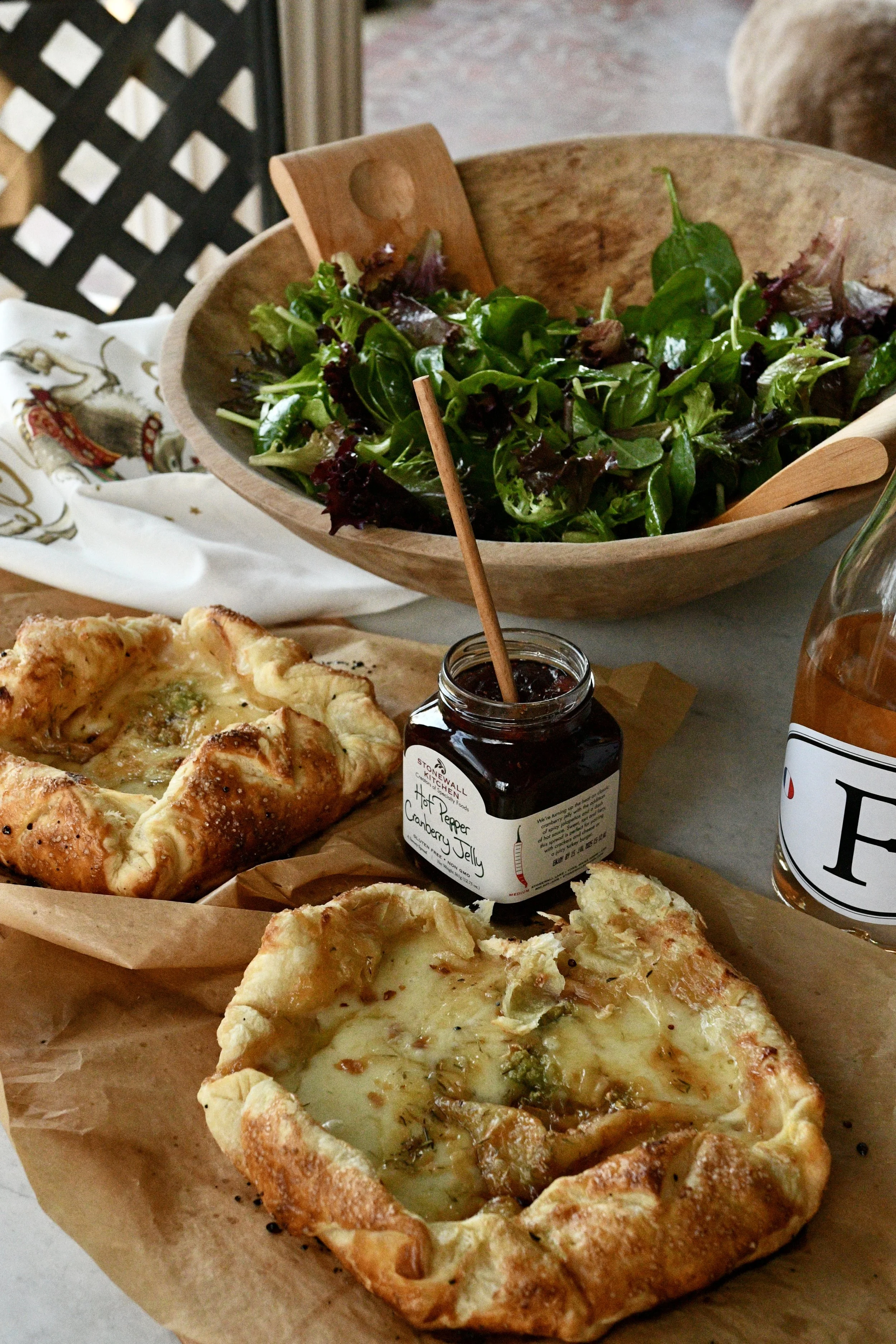 Cubes of Gruyère Cheese are sprinkled with thyme and drizzled with hot honey (I used Mike’s) and baked in a nest of puff pastry! It comes out of the oven looking like the best ooey gooey bread ever and it might just be! I served this pan of deliciousness hot out of the oven with Hot Pepper Cranberry Jelly. A simple green salad with pears, dried cranberries, walnuts and a little sautèed pancetta seemed a perfect accompaniment! A little slice of Gruyère puff pastry alongside a serving of salad is such a delicious lunch, with, of course, a glass of Rosé! This is a recipe to serve all year long!
