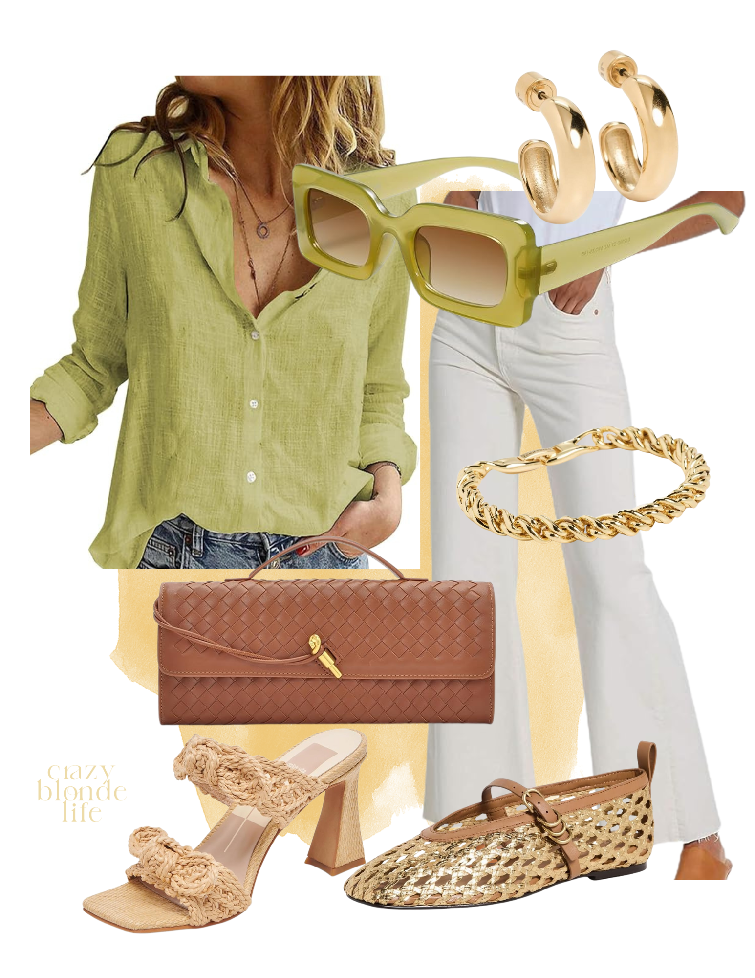 //Green Blouse//Green Sunglasses (I own and love these)//Jenny Bird Gold Earrings//White Jeans//Gold Bracelet//Gold Mary Janes (in my cart)//Dolce Vita Sandals//Tan Bag//