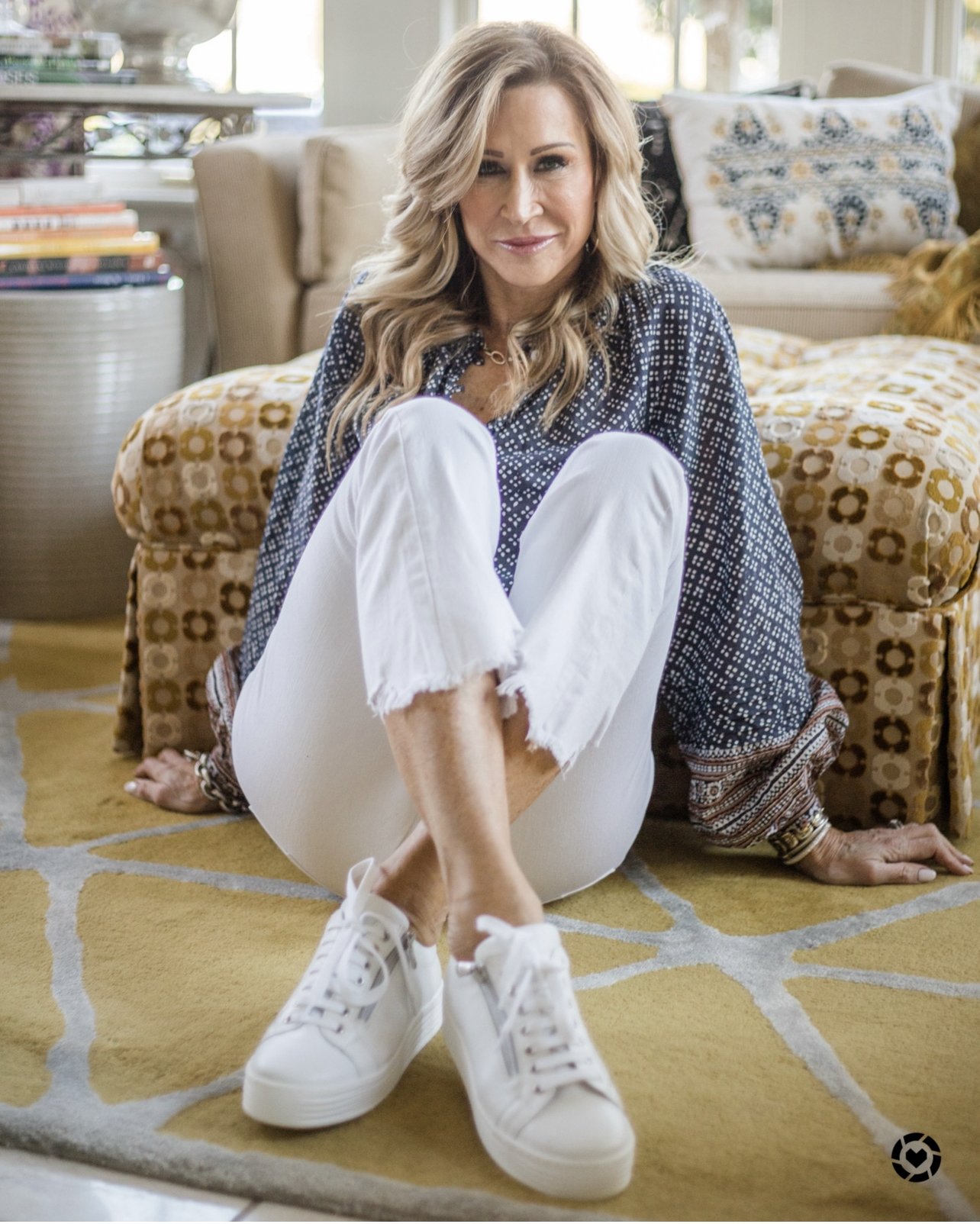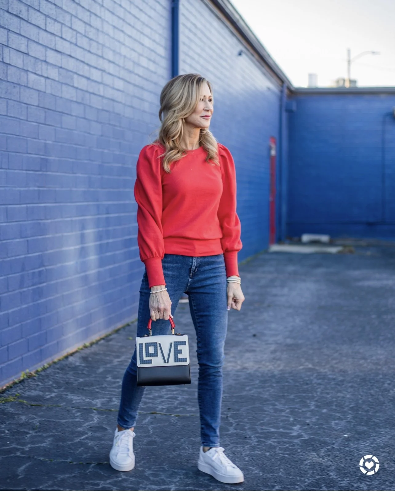 If you’re already feeling ready for spring, pull out your white jeans! This style from AG is my favorite and has been for years! A patterned Cleobella top with sneakers completes the look! On a warmer day, an oversized denim jacket would be great with this outfit!