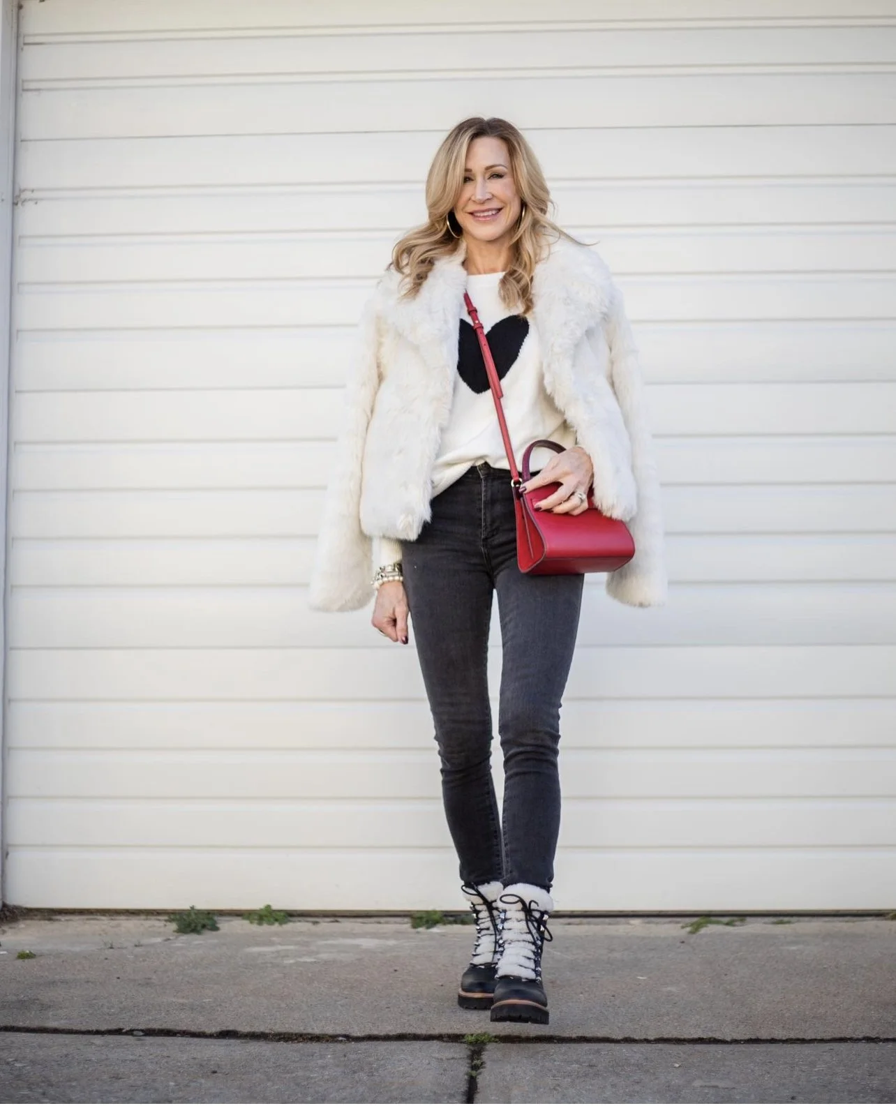 Very Valentine’s Day don’t you think? My heart sweater is from Loft, I’m wearing a faux fur coat by Abercrombie with dark grey jeans and Marc Fisher booties. My bag is Tory Burch!