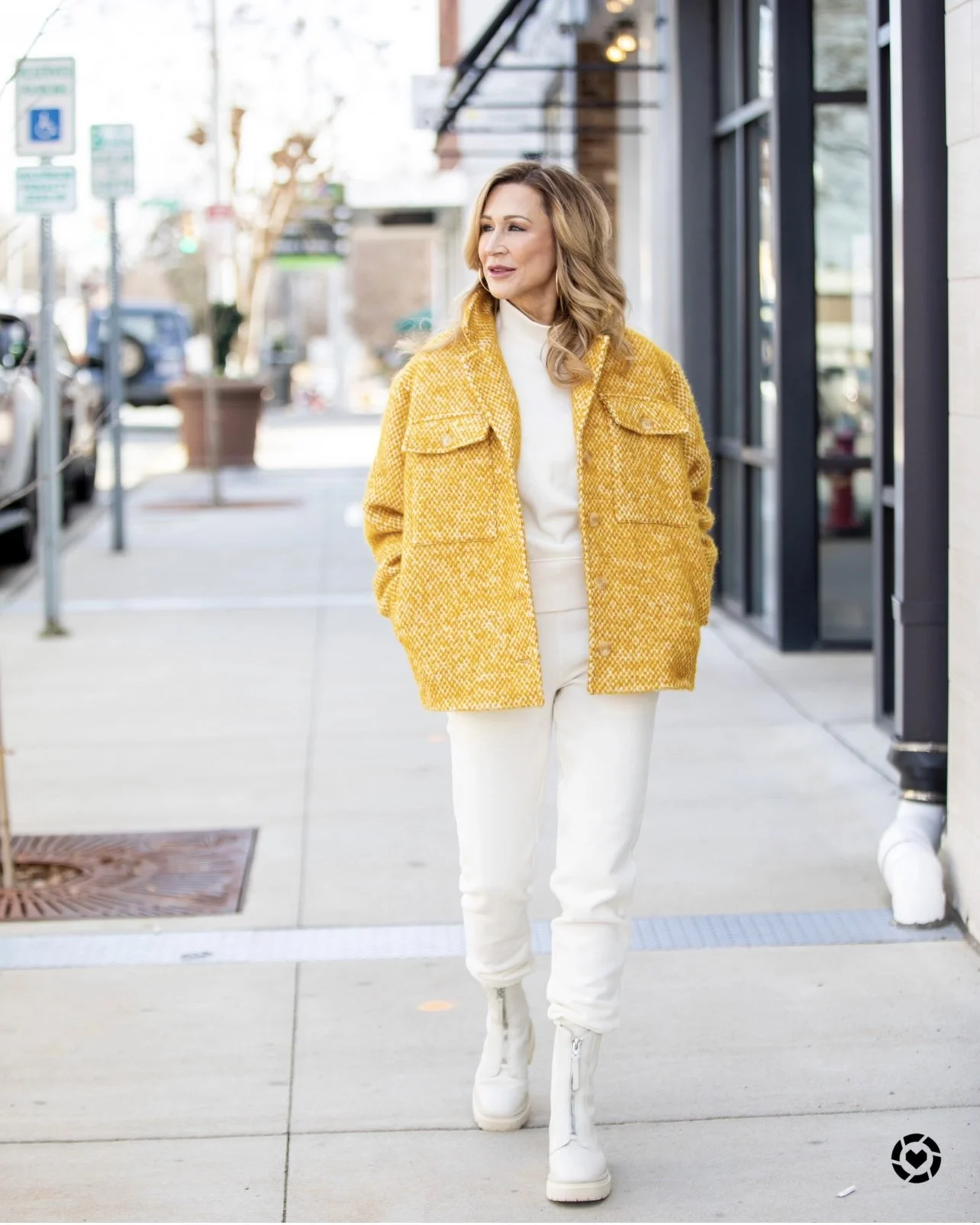 This golden yellow jacket from Anine Bing was one of my favorite and most worn pieces from last season! Sadly, it’s no longer available, but I’ve linked the exact style in a black and white herringbone that is fabulous! The trend of wearing a matching set with combat boots and a coat (long or short) is still going strong and is so stylish and comfortable at the same time! This look is perfect for a cold day!