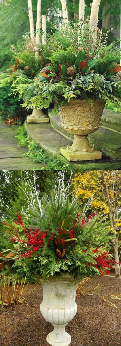 Iβve been scouring Pinterest over the past several days, gathering ideas for decorating the outside of our home for the holidays. I want to give my guests (and family) a little holiday cheer from the minute they ring the doorbell. I bought some birch branches at Target (believe it or not) and was inspired to use them in the planters by the front door. I also want to include boxwood cuttings, lots of evergreen branches, holly berries, pinecones, maybe a pomegranate or two and definitely some twinkling lights! . We always decorate our outdoor fireplace for Christmas and leave it up longer than the other decoration so I included a couple of ideas for fireplace decor! Enjoy!