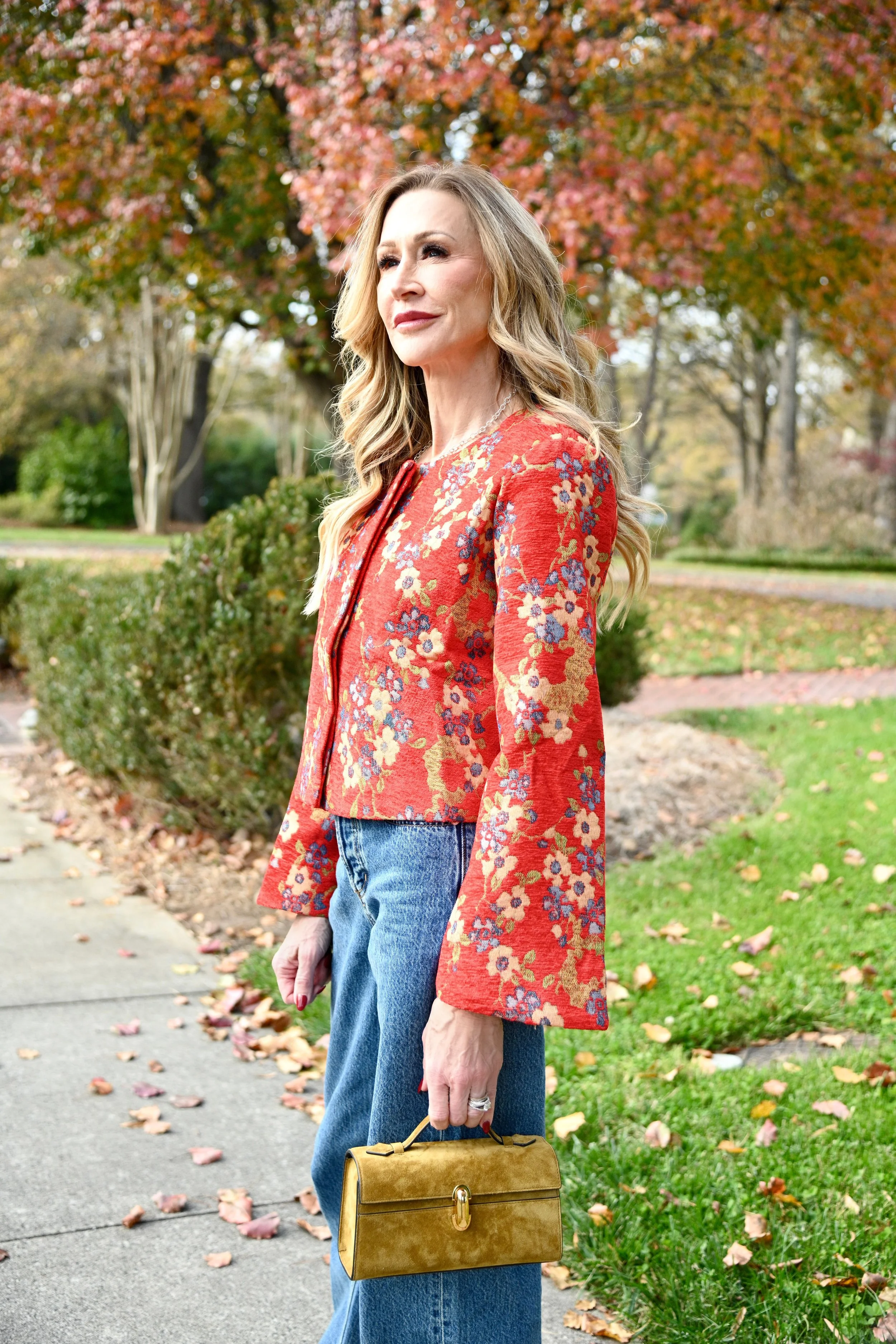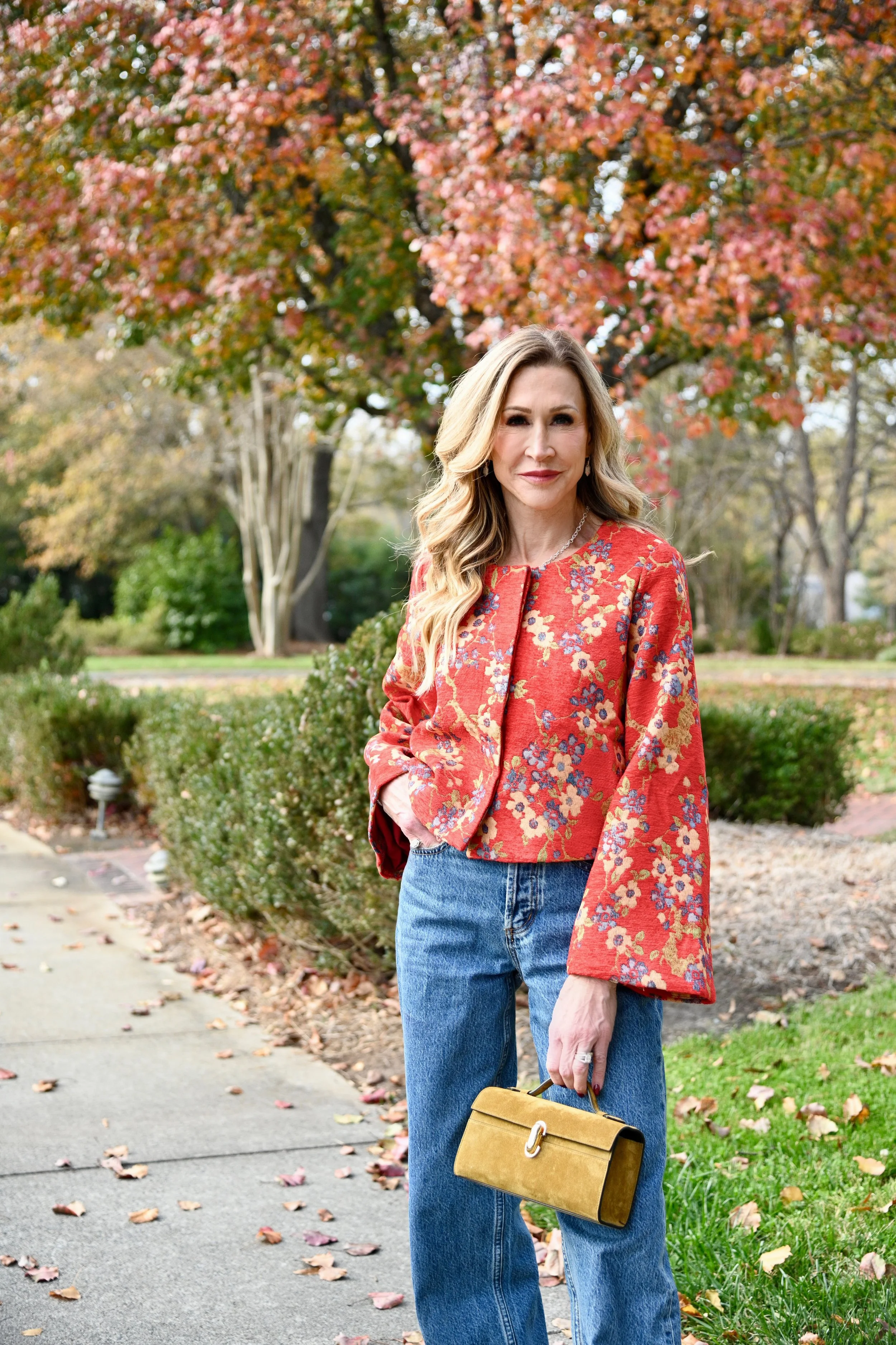 Thatβs exactly why this red floral jacket from Tuckernuck feels so specialβitβs the perfect way to add a little life to my fall and winter looks and couldnβt be more perfect for the holidays! I loved it the minute I saw it and I know itβll be in my wardrobe for years to come! The vintage-inspired pattern is perfect with my wide leg jeans, adding color in a way that feels effortless and pulled together. So whether I throw it on with jeans and gold Mary Jane flats from Amazon or layer it over black leather pants and booties, it gives me that extra little mood boost that we could all use this time of year! Keep scrolling to the end for a boutique filled with some of my favorite items from Tuckernuck!