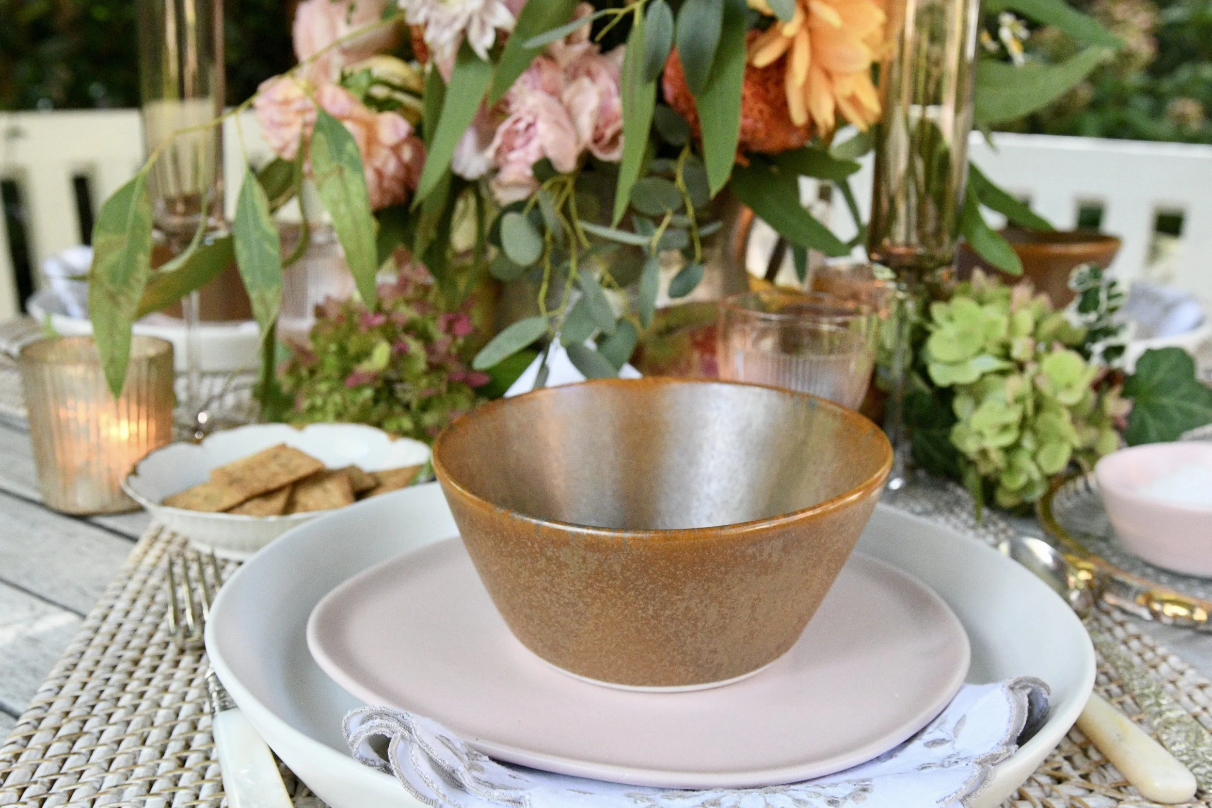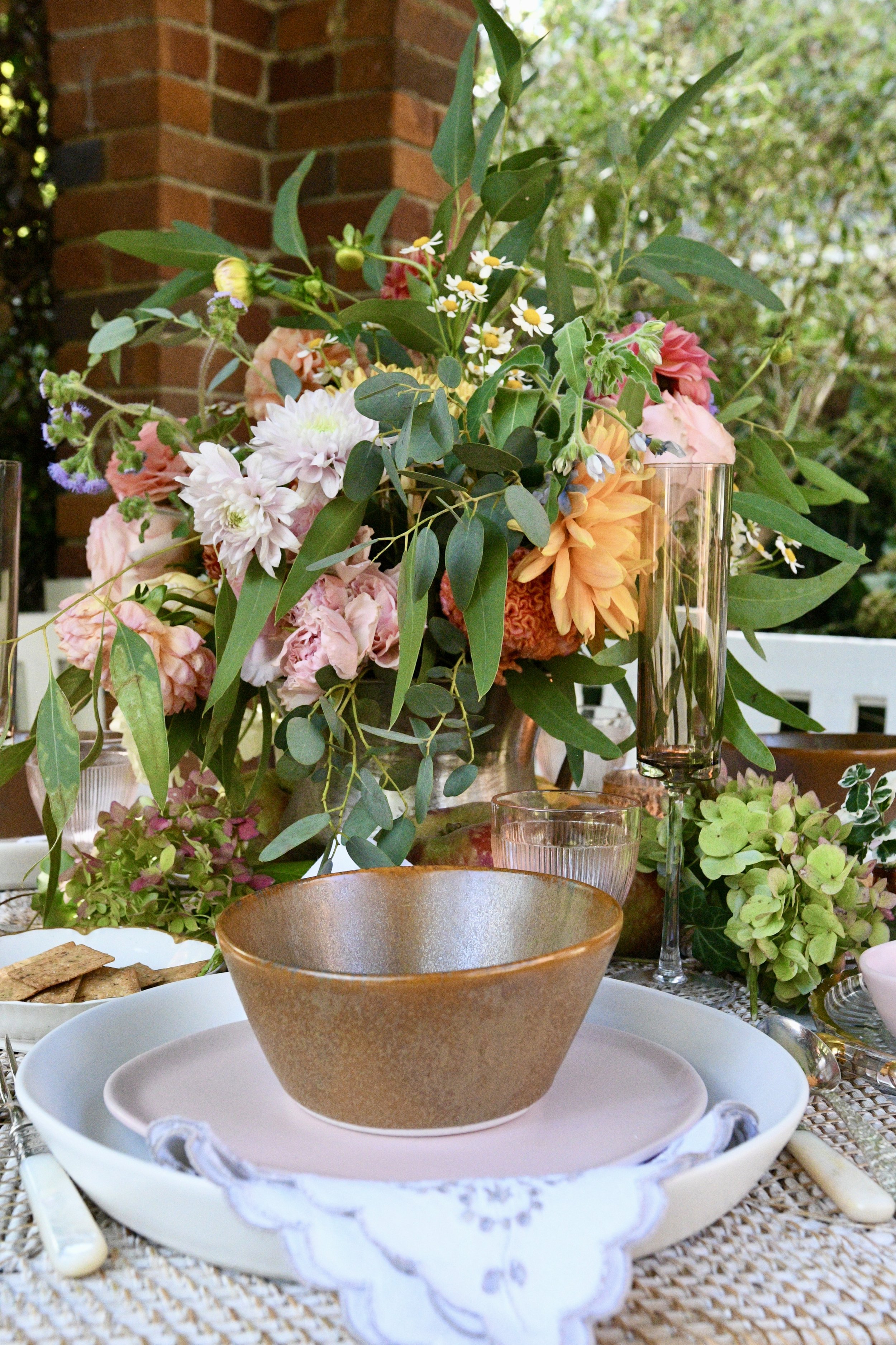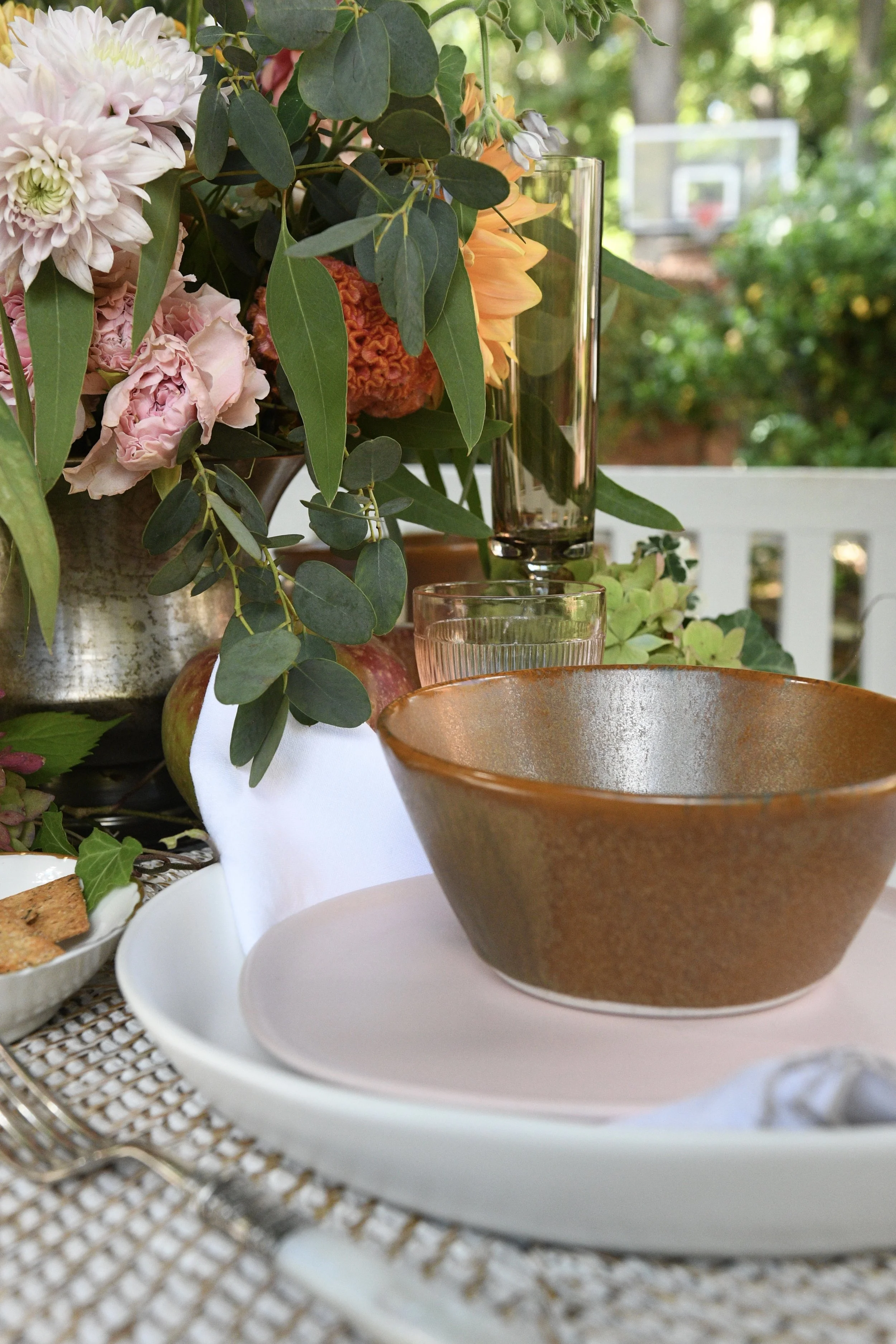 The combination of the white plates along with the pink and brown made for the perfect outdoor table setting and matched the flowers perfectly! As I said above, I love mixing contemporary with vintage and these little pink bowls looked amazing on the vintage, gold rimmed glass tray! If you’re unsure of what will look good together, just get it all out and play around until it makes you happy! It’s very satisfying to start with an idea and create something beautiful!