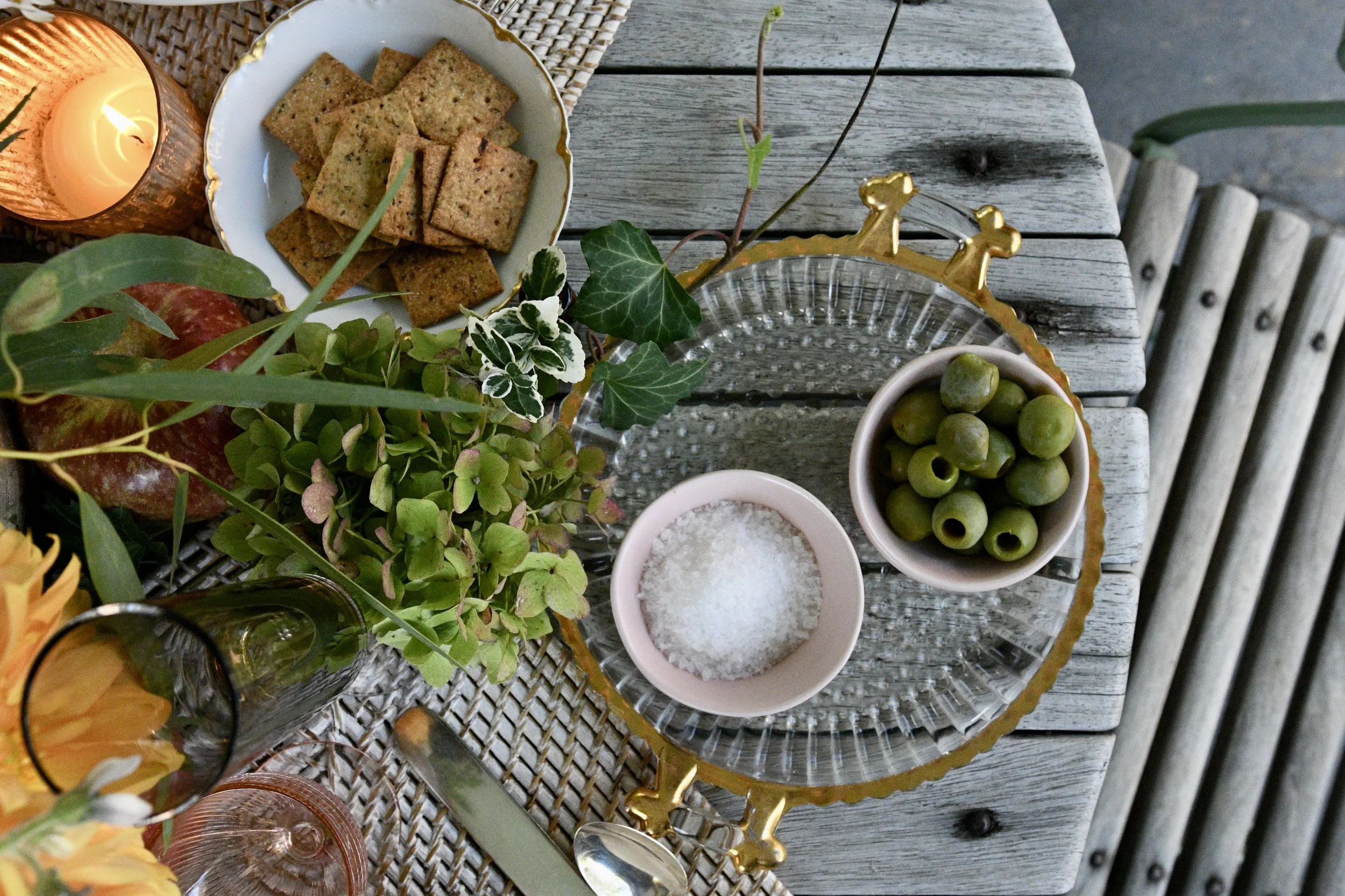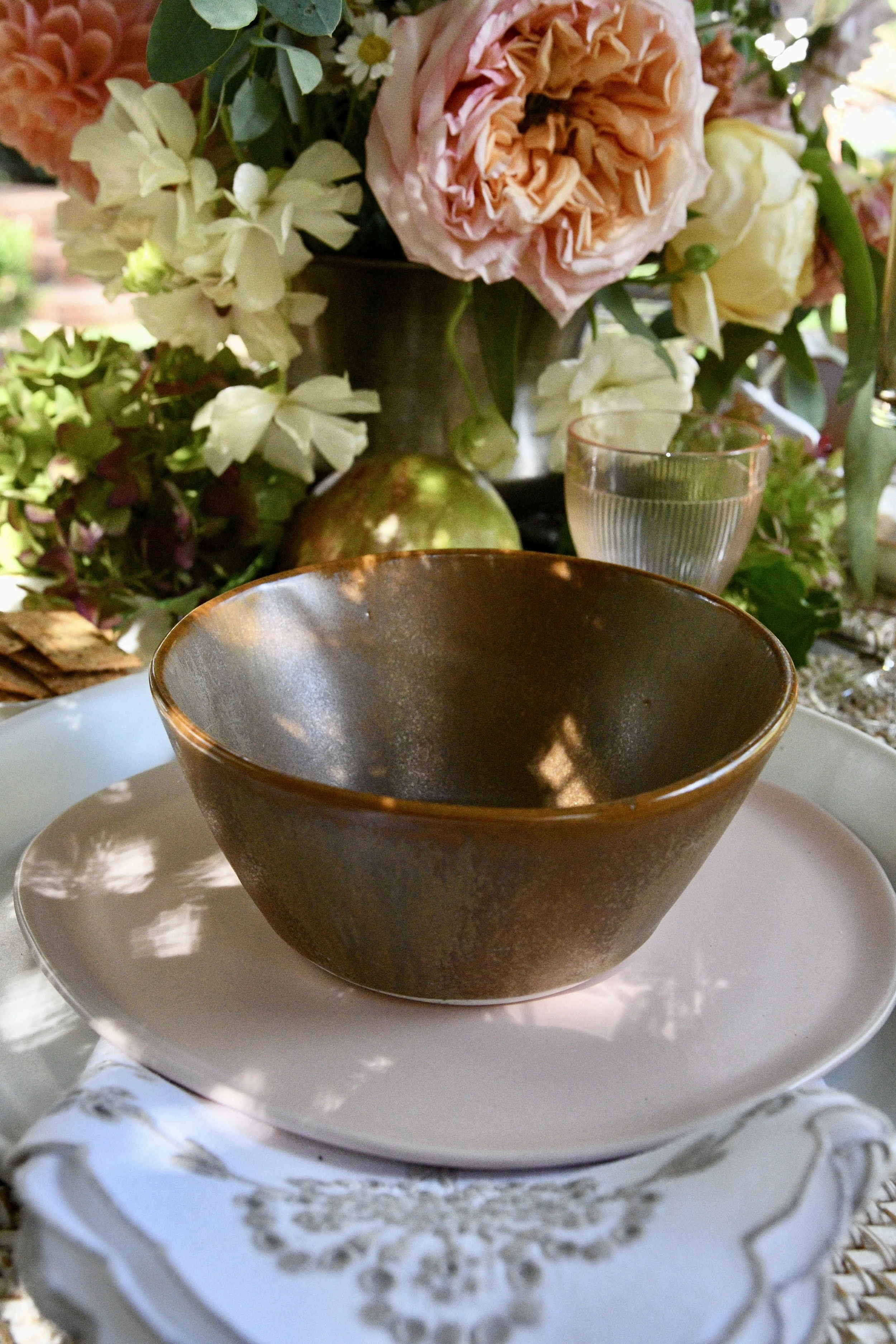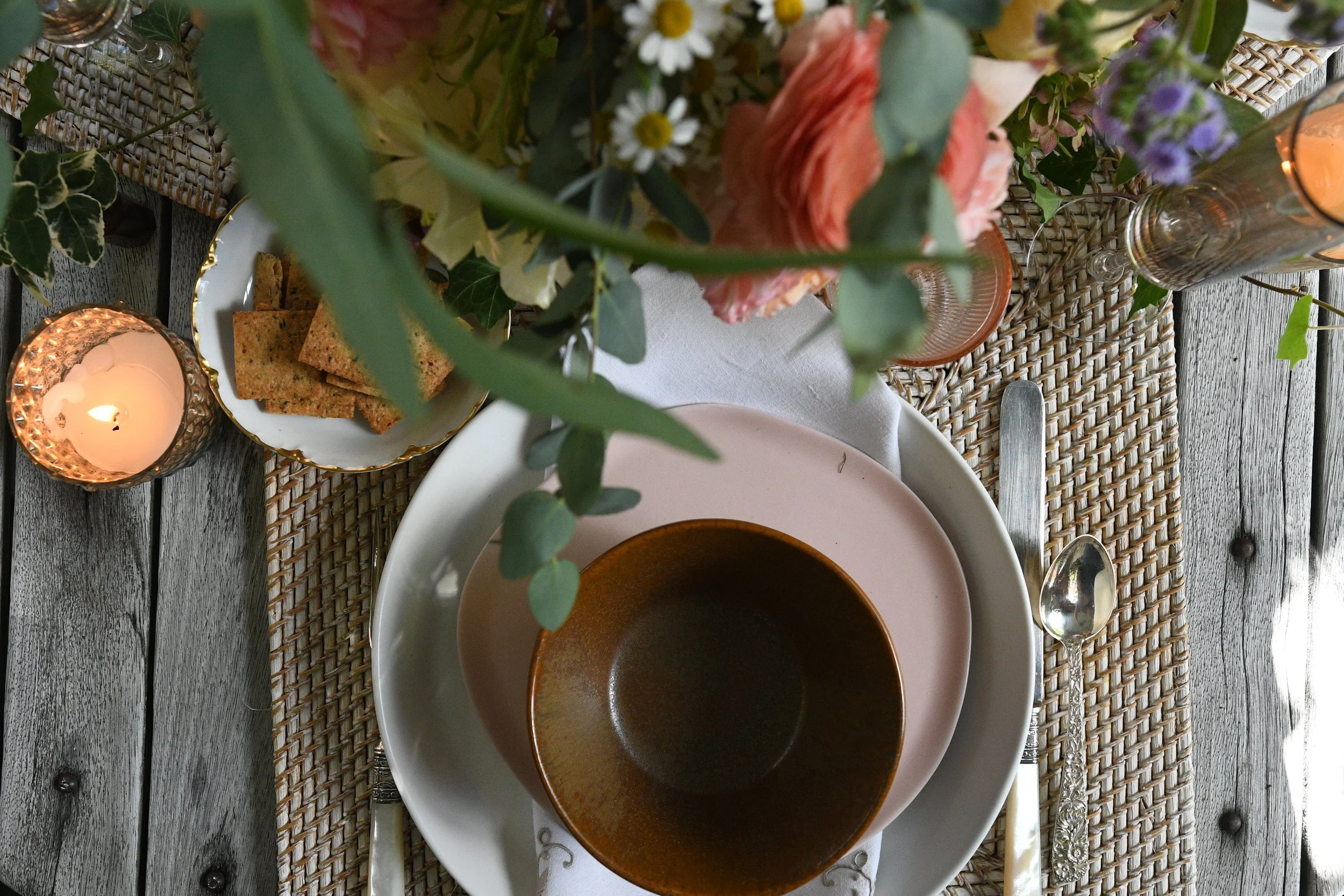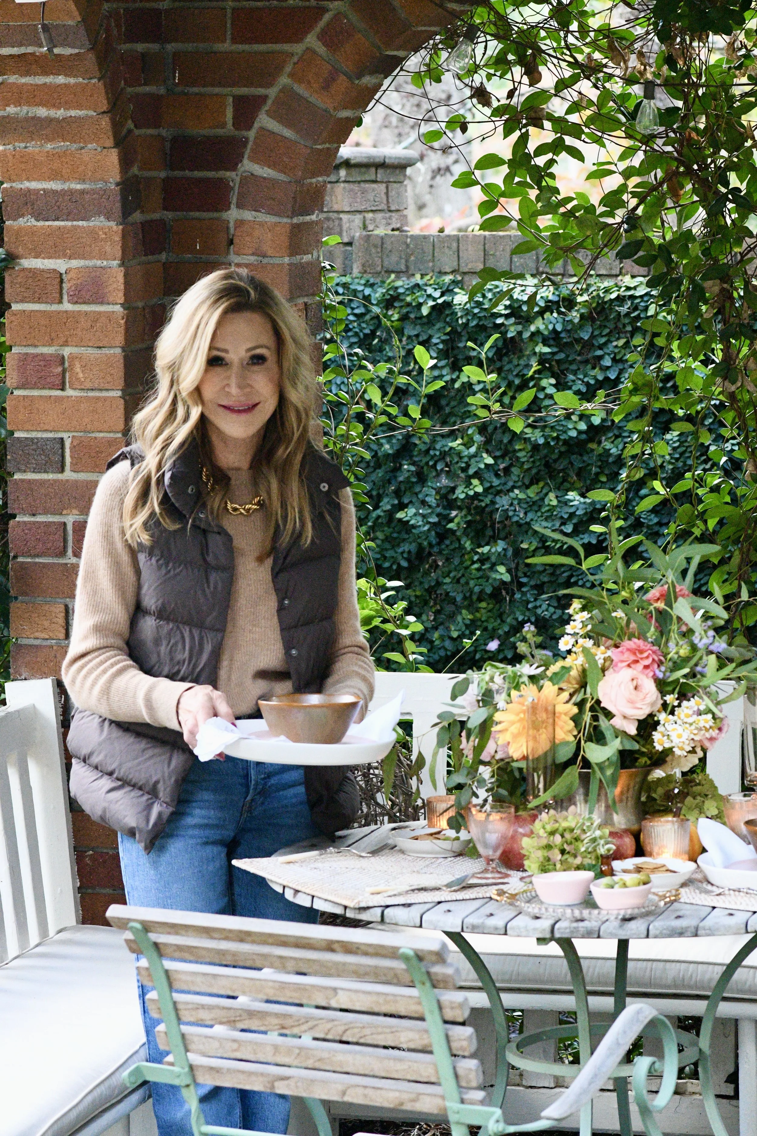 The combination of the white plates along with the pink and brown made for the perfect outdoor table setting and matched the flowers perfectly! As I said above, I love mixing contemporary with vintage and these little pink bowls looked amazing on the vintage, gold rimmed glass tray! If you’re unsure of what will look good together, just get it all out and play around until it makes you happy! It’s very satisfying to start with an idea and create something beautiful!