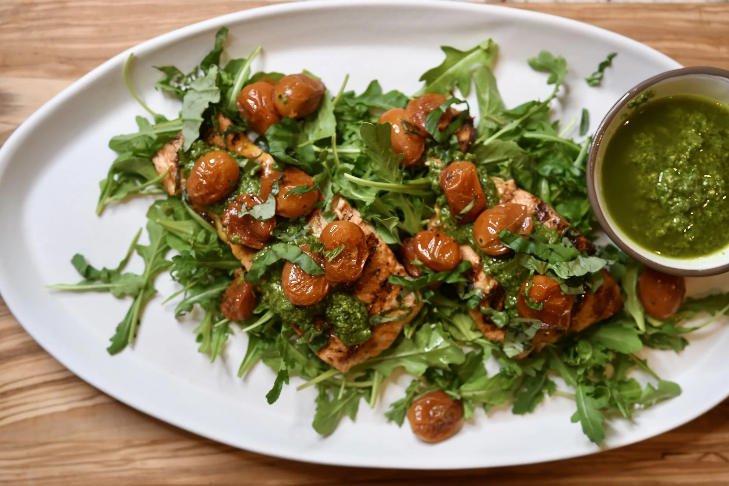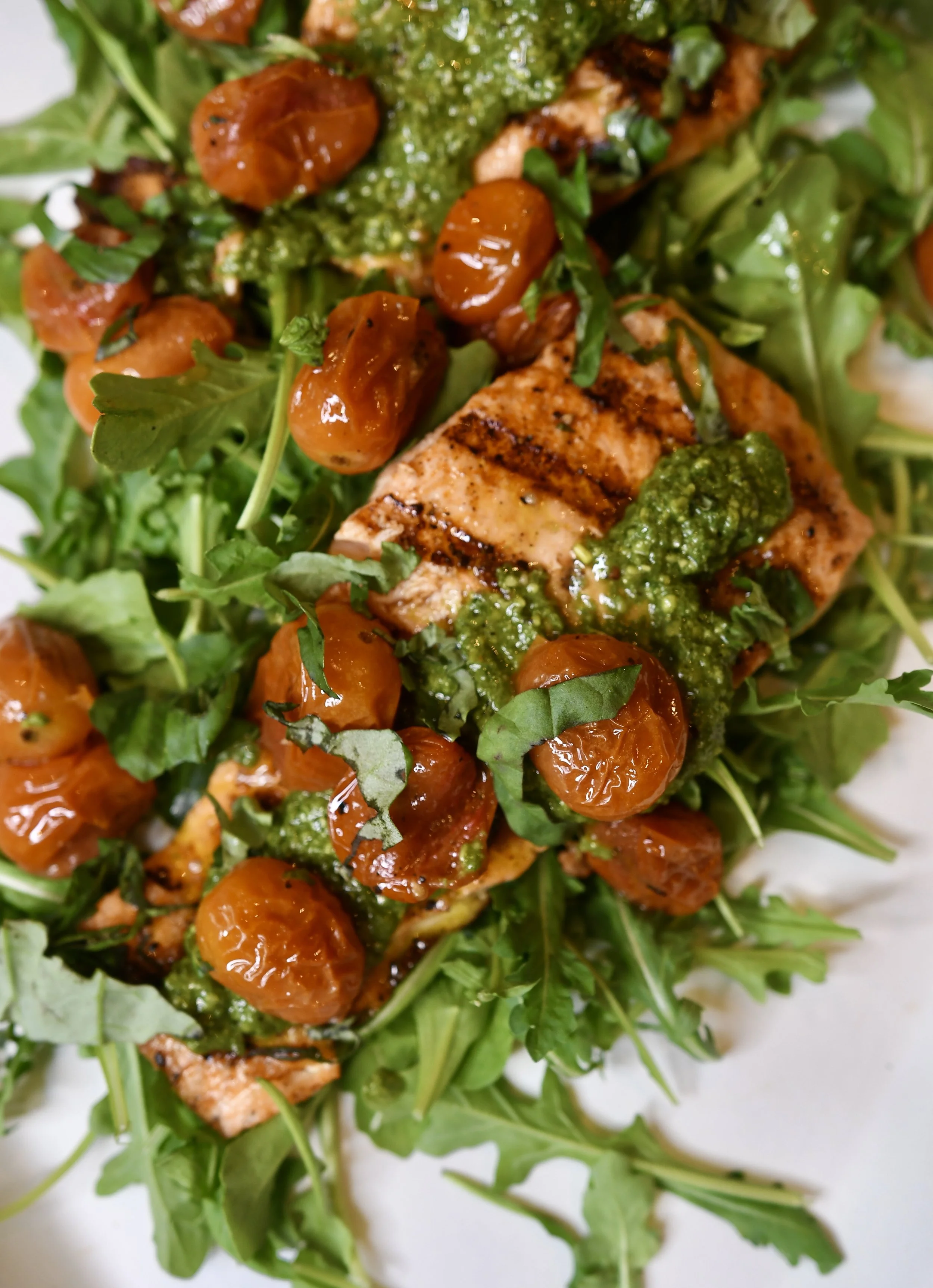 5 Ingredient Dinner - Salmon with Pesto and Roasted Cherry Tomatoes