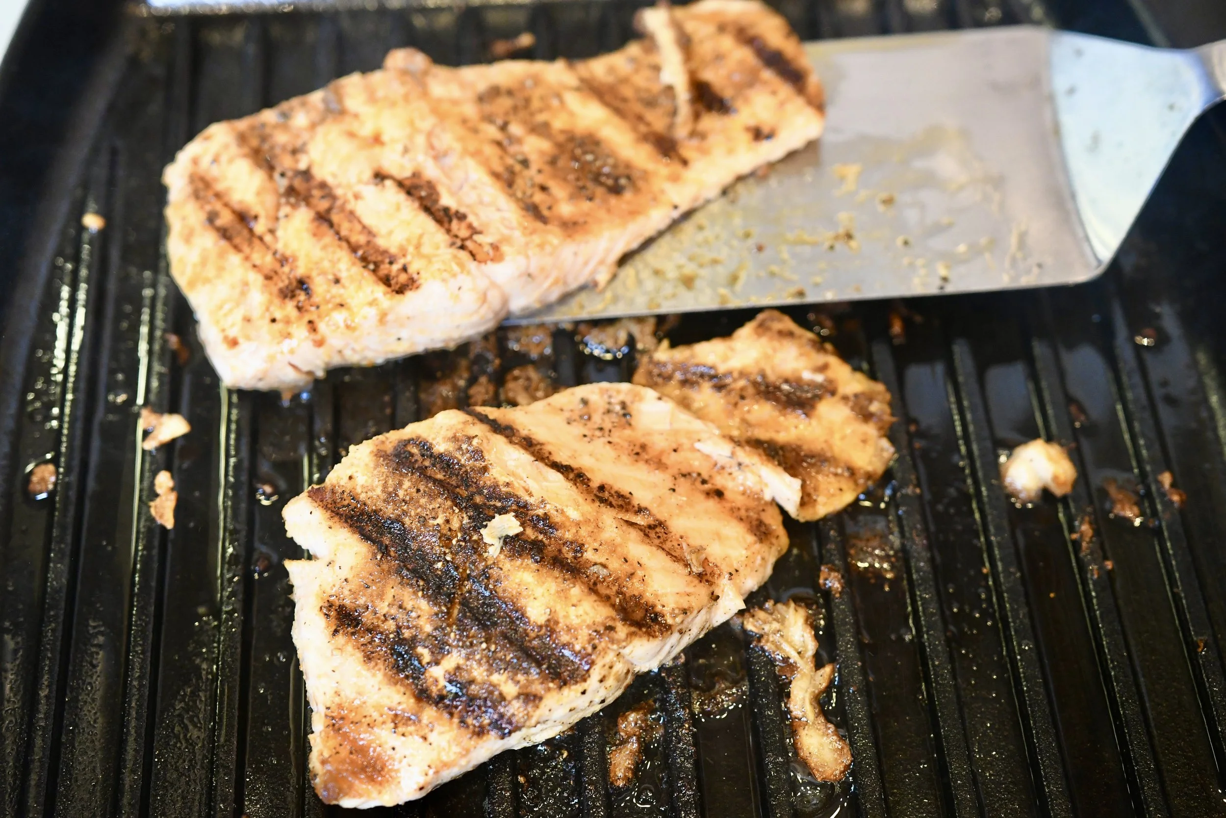 I really do not like to be served salmon with the skin on, so I always sear it in a hot pan and lift the piece of salmon right off of the skin. That way, I can remove the skin from the pan, flip the salmon over…sear it on the other side and flip it one more time just to brown the skin side. This method works perfectly every time and you don’t have to deal with a piece of skin on your plate. You can also do this on the grill.
