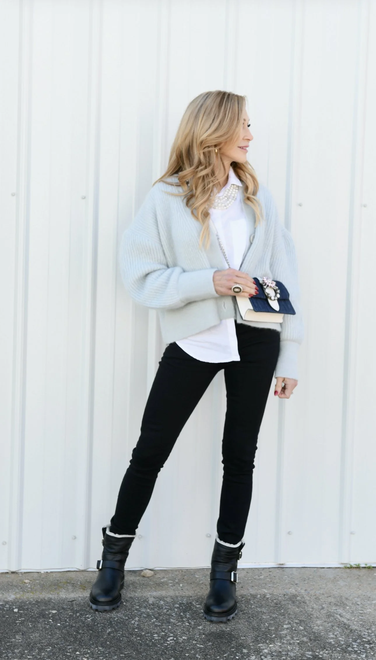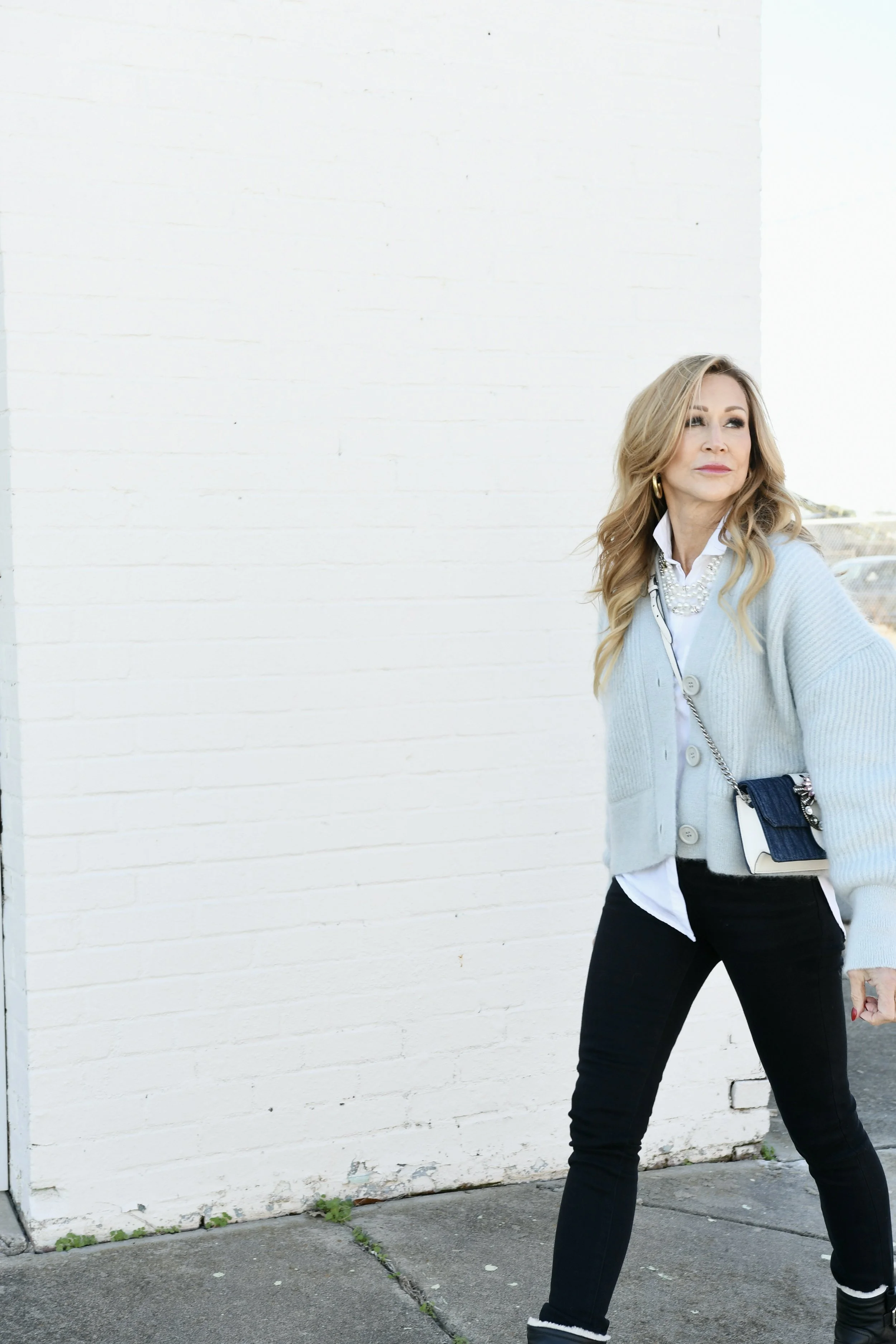 This camel vest can be worn over a light layerβ¦just a sweater or blouse, or layered even more! I decided to try it with this light blue (very thick) cardigan from Anine Bing and a white blouse! I love the way it looks and it definitely added warmth without adding the bulk of another sleeve. Iβve also been playing around with adding pearls to different necklines and so I used a very long strand of pearls from Julie Miles and wrapped them around 3 times for more of a statement at my neck. Black skinny jeans (yes they are still very much in style) and warm fur lined boots make this the perfect winter outfit for running around and staying warm!