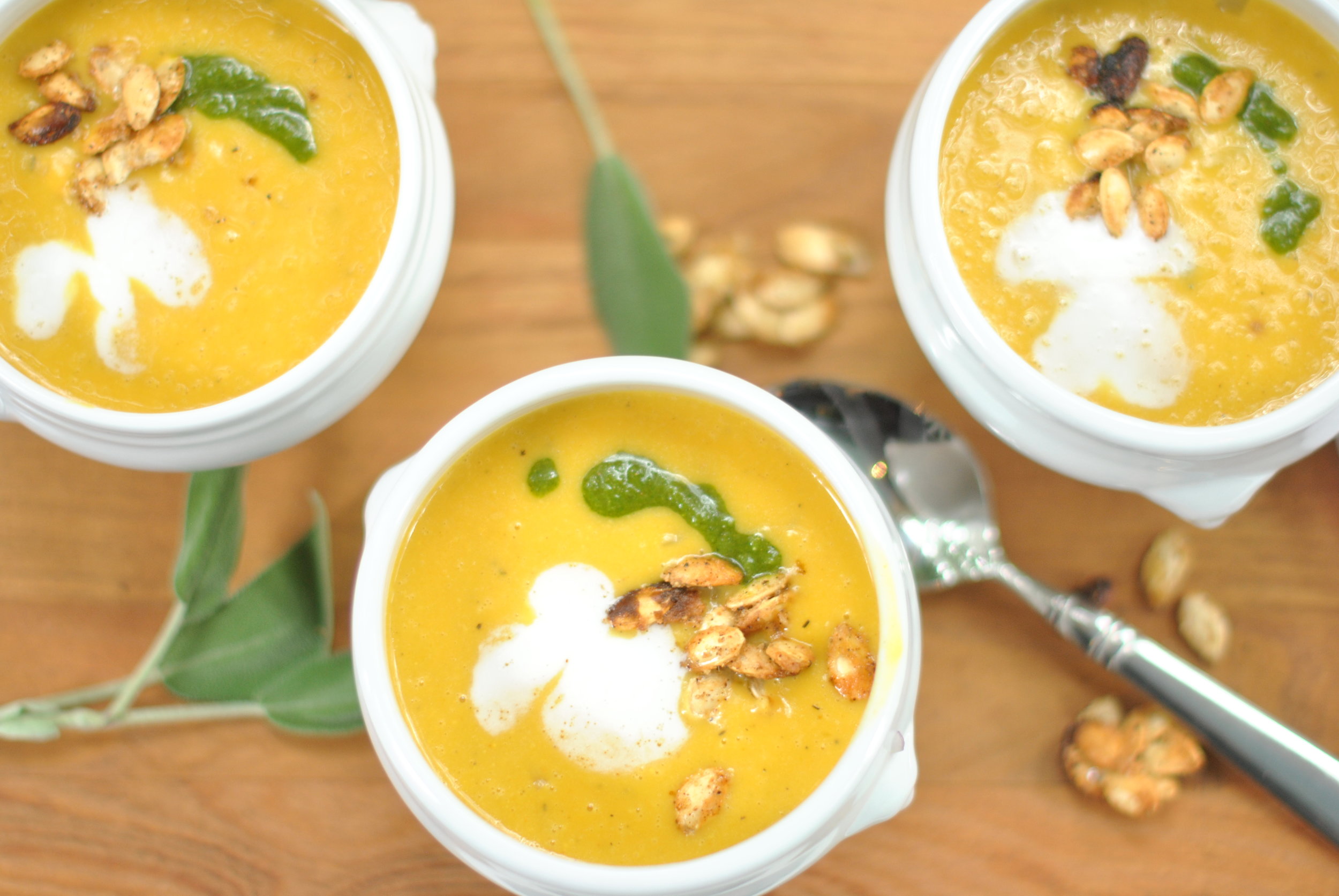 Roasted Pumpkin Soup with Sage Pesto and Candied Pumpkin Seeds