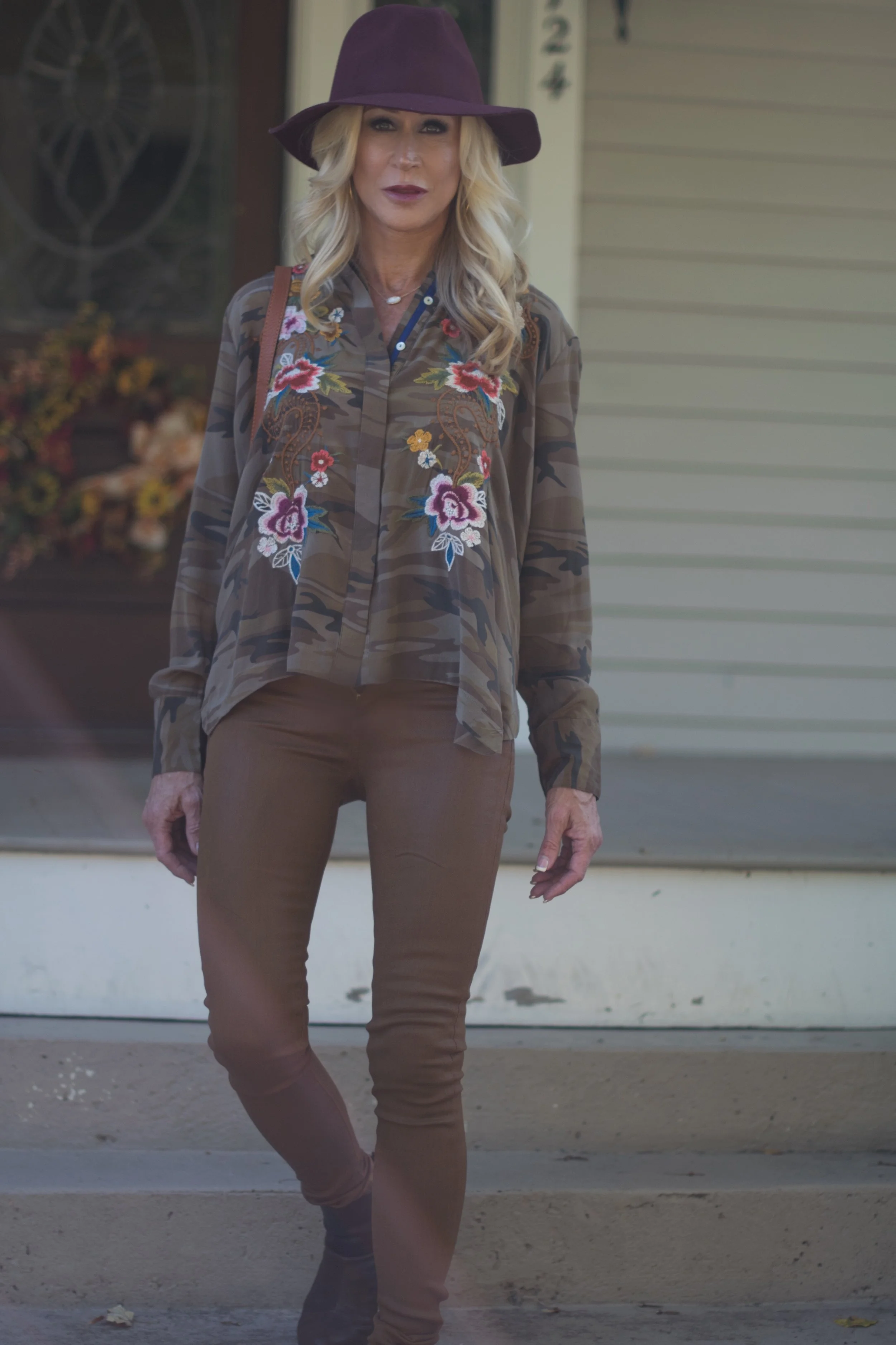 Just a word about what I'm wearing because I'm pretty obsessed with this Johnny Was blouse from Rebecca & Co in Greensboro, NC (similar here and see more here). I'm not the biggest camo fan, but the embroidery on this blouse is so exquisite that it won me over. I paired it with Citizens of Humanity pants that I've had for several years, my Chloe bag, and a hat that I got in Nashville last week! You can't see my booties, but they are classic brown Rag and Bone! I'm including some links for more of my favorite Johnny Was pieces below!