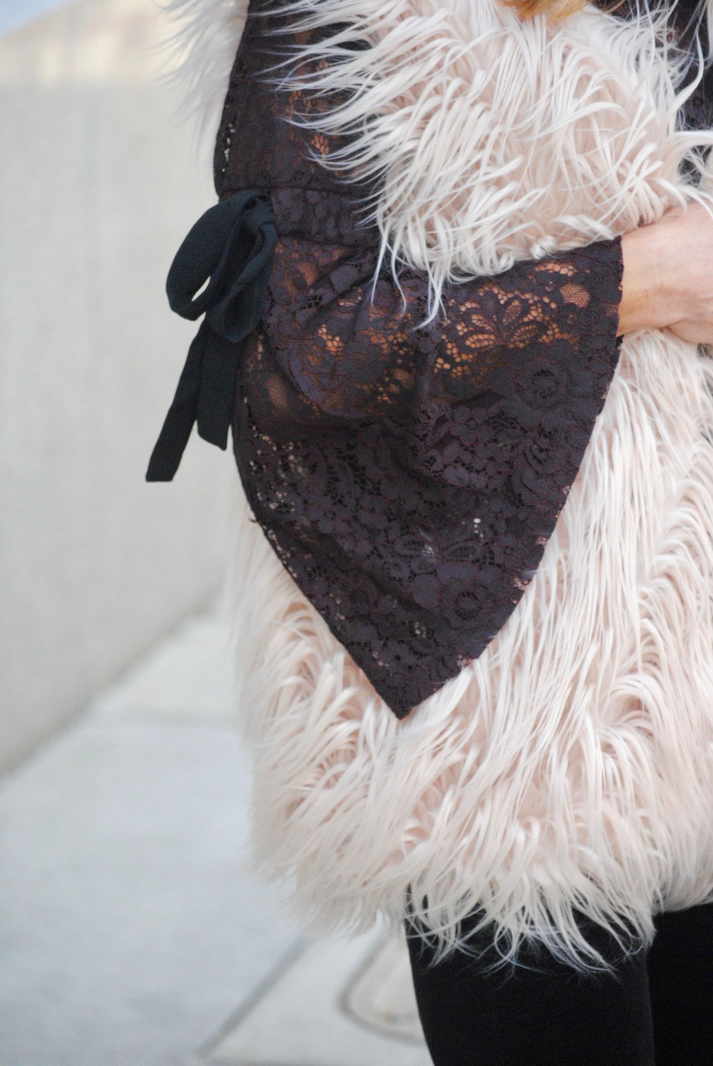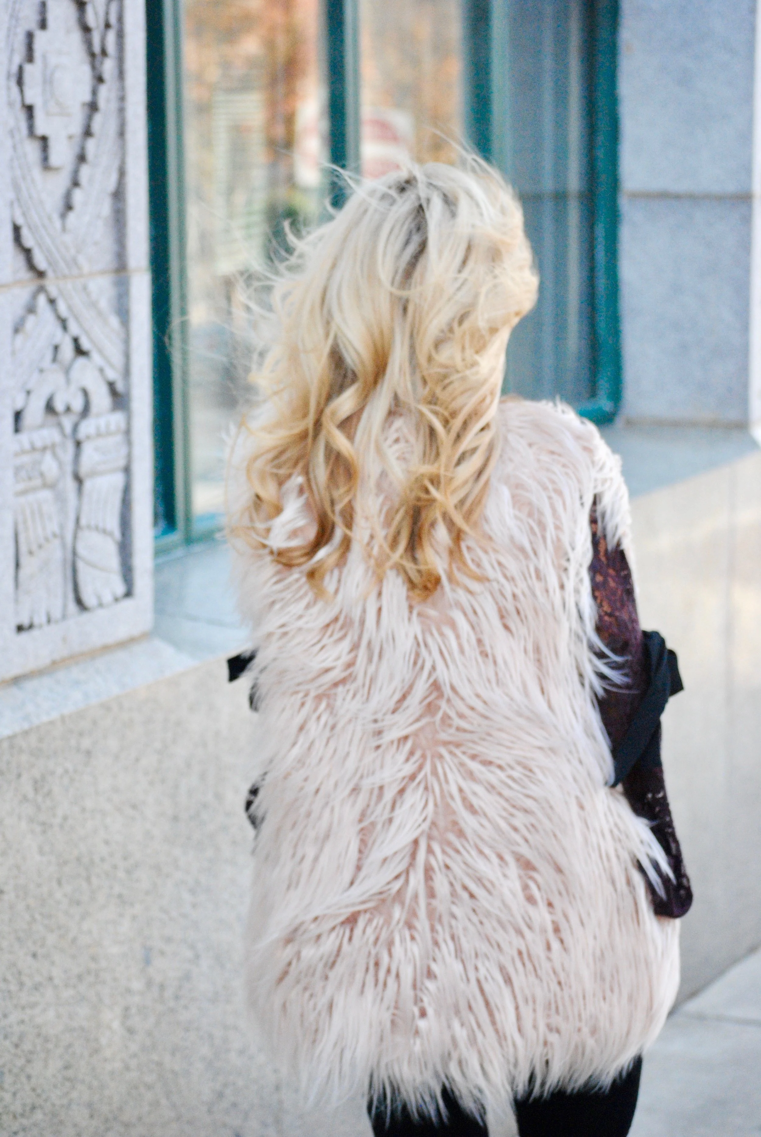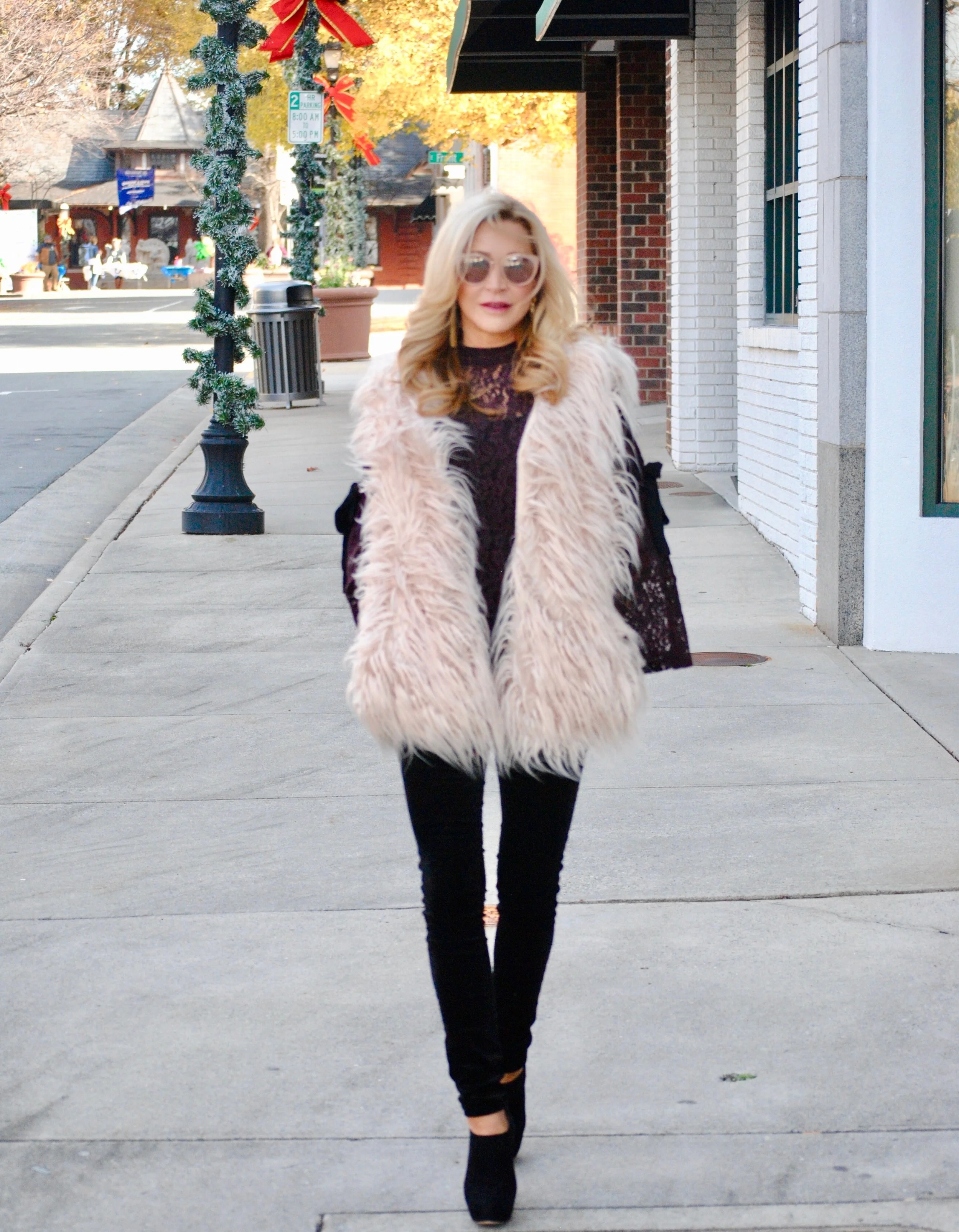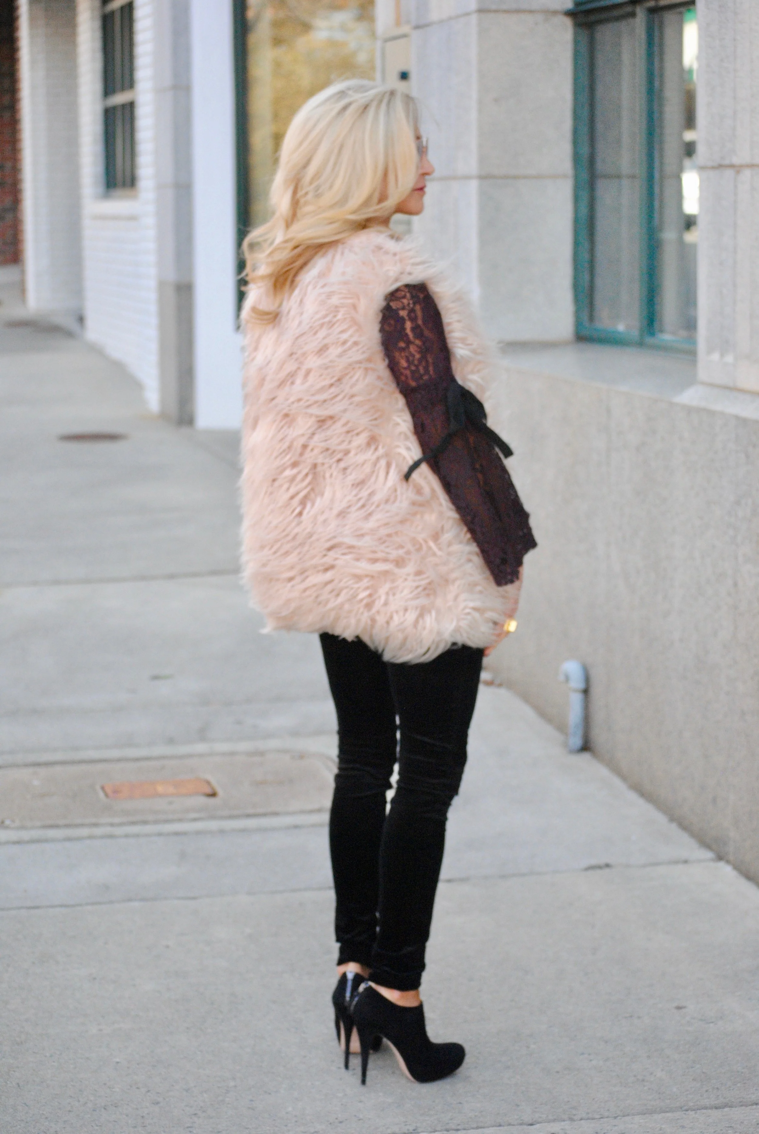This outfit is so much fun with the pink furry vest. I got this vest several seasons ago and it goes with everything from a striped shirt and jeans to this look with velvet pants and a lacy shirt. My shirt came from the LOFT sale and it's going to be so cute for the holidays. I also love it paired with jeans and my black over the knee boots from Target.