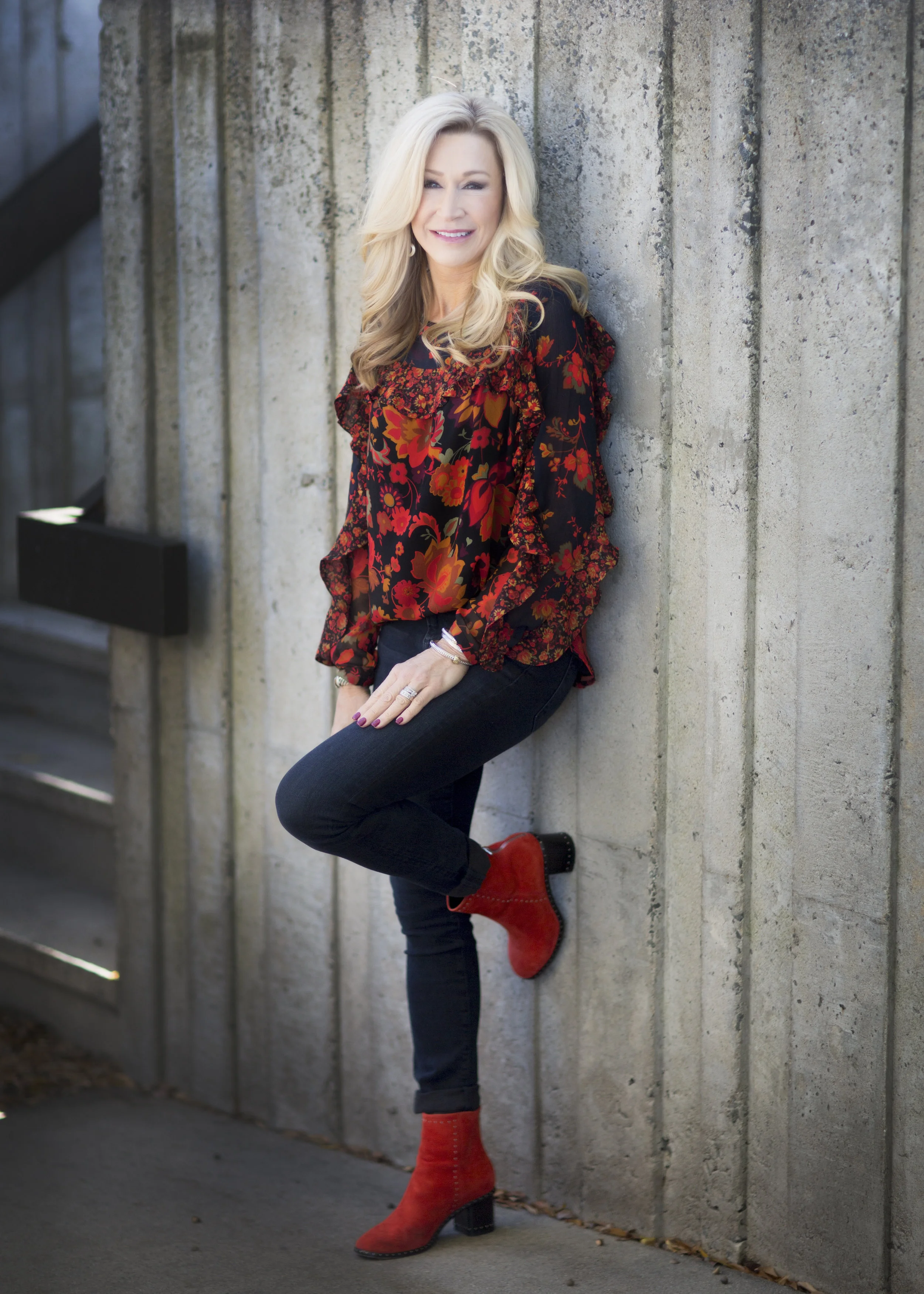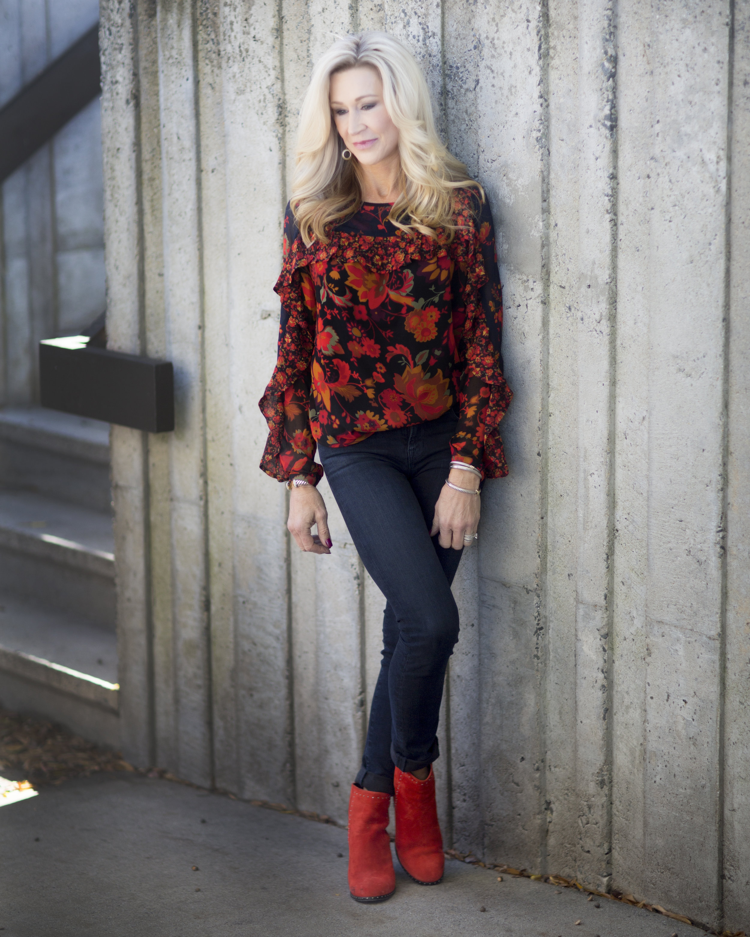I will have to admit that these red boots from Rag and Bone (similar here and in camel here) make me smile! I got them last year and I'm going to be wearing them all winter long. I paired them with a blouse from Loft that is only $59.50 and dark skinny Frame Denim jeans. I've started buying cropped jeans for the most part because I'm short and they look better with booties. These are the perfect length without hemming. I also really love this this velvet tie back top!