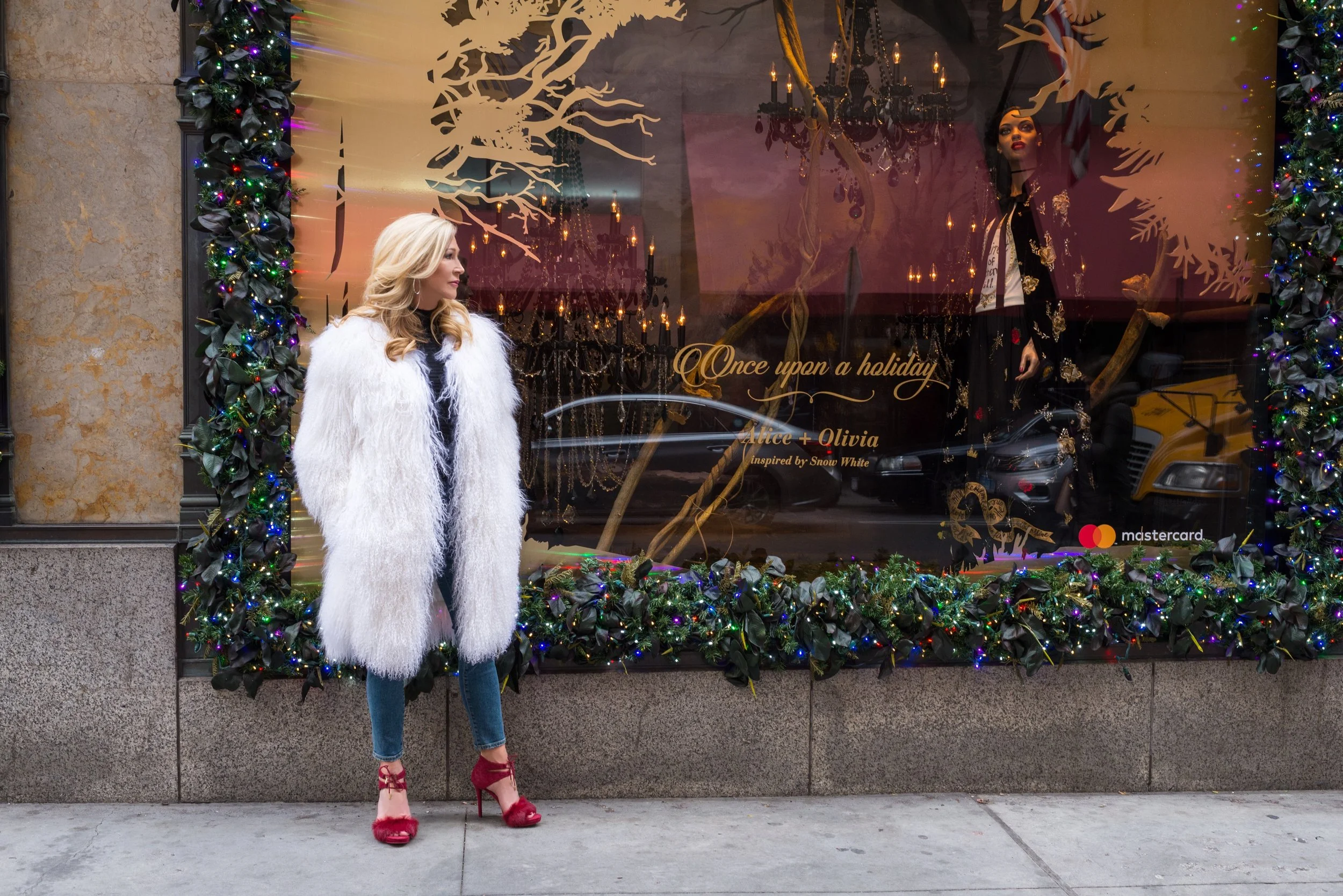 What can I say about the coat I'm wearing! It's a dream and sooo warm! I decided to pair it with distressed jeans and furry Michael Kors heels, because why not! The Mongolian fur is by Adriene Landau.