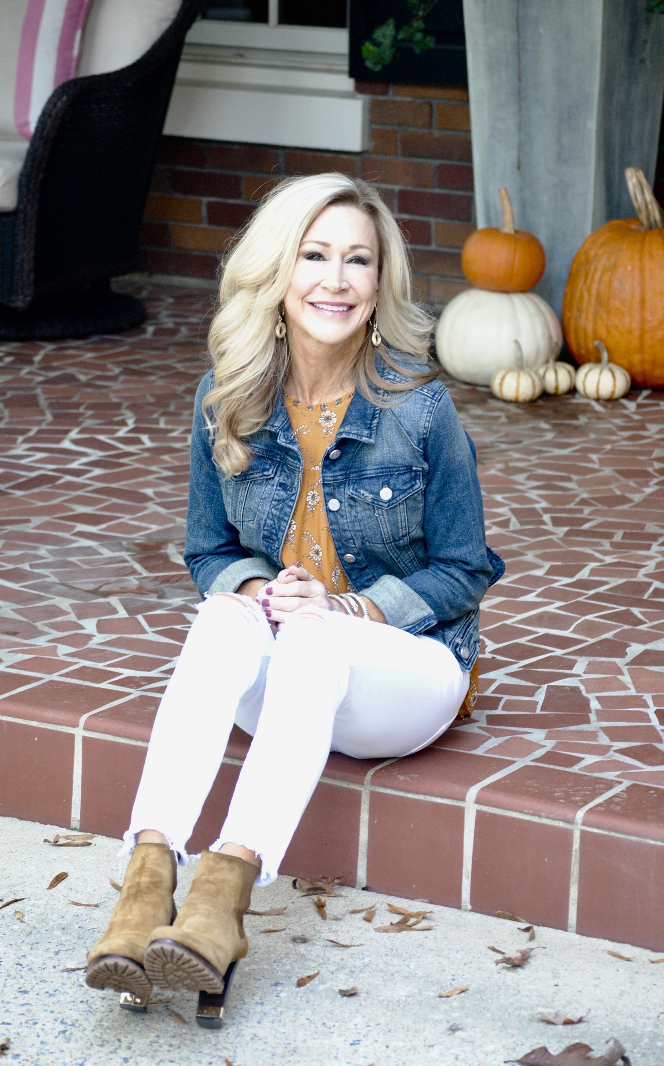 Loft top, Madewell denim jacket, J Brand white jeans, Tory Burch booties (similar)