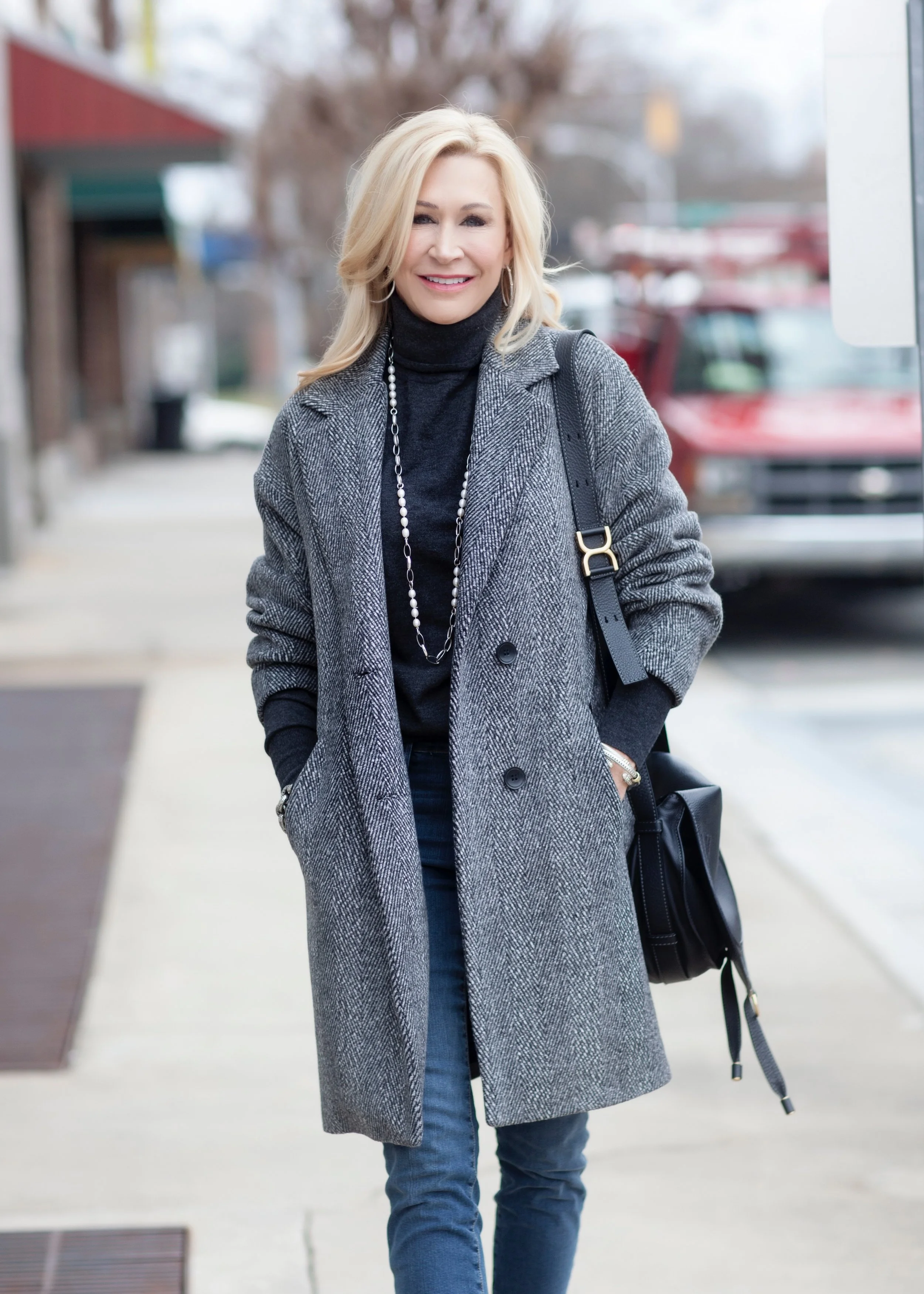 Cabi Coat, Michael Stars tee, Frame Denim jeans