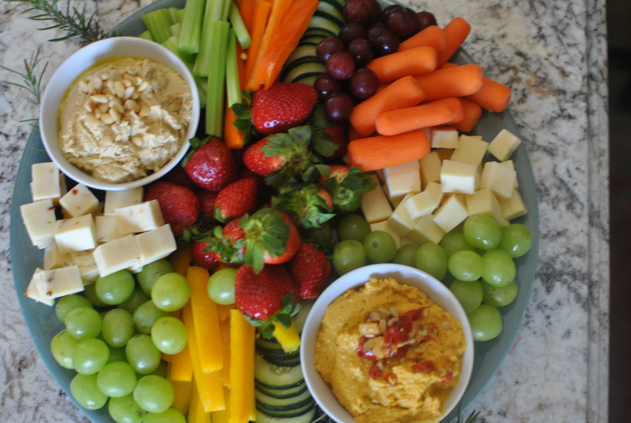 I made this beautiful platter full of healthy snacks...hummus, veggies, yummy cheese ad fruit!