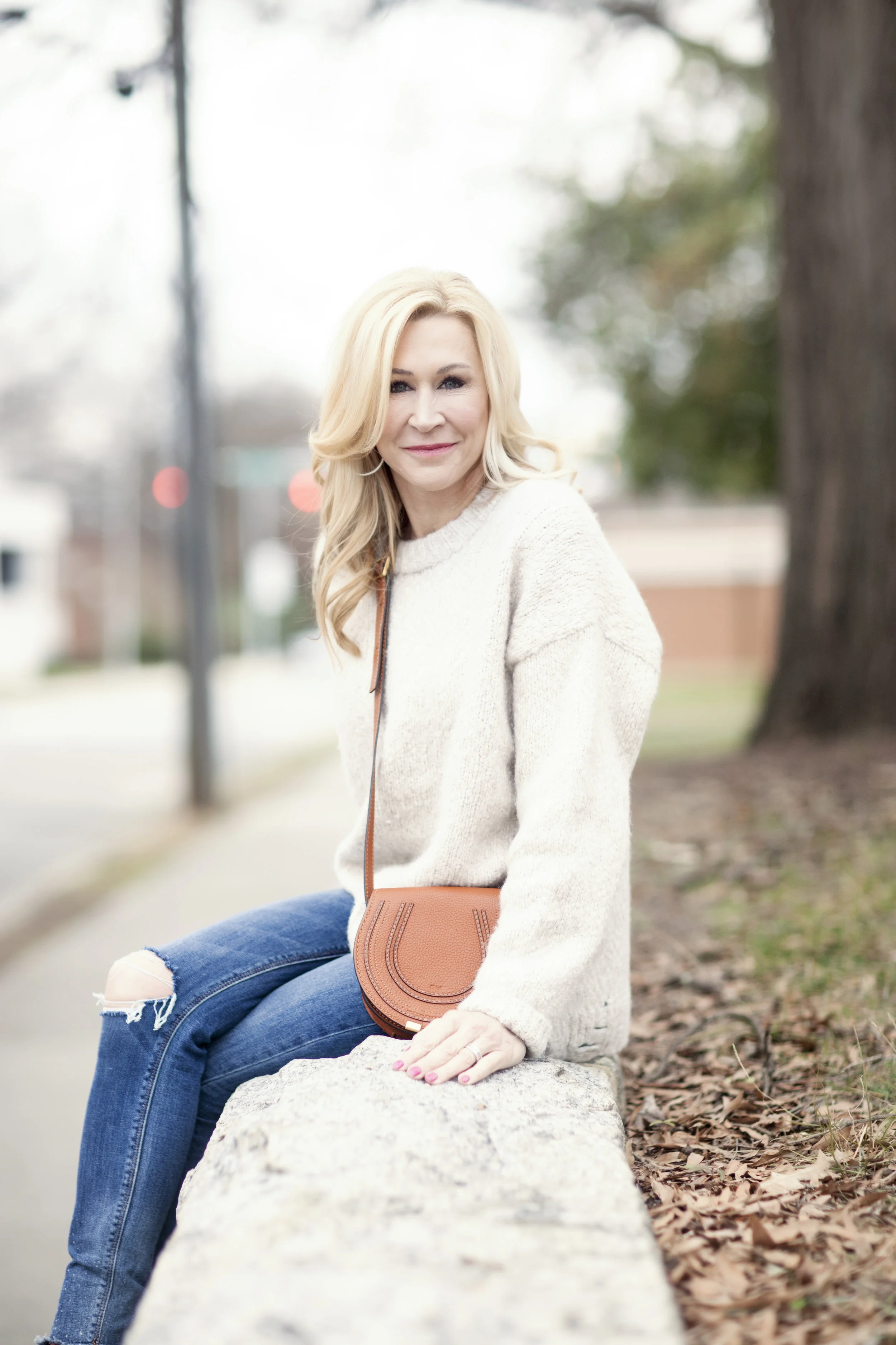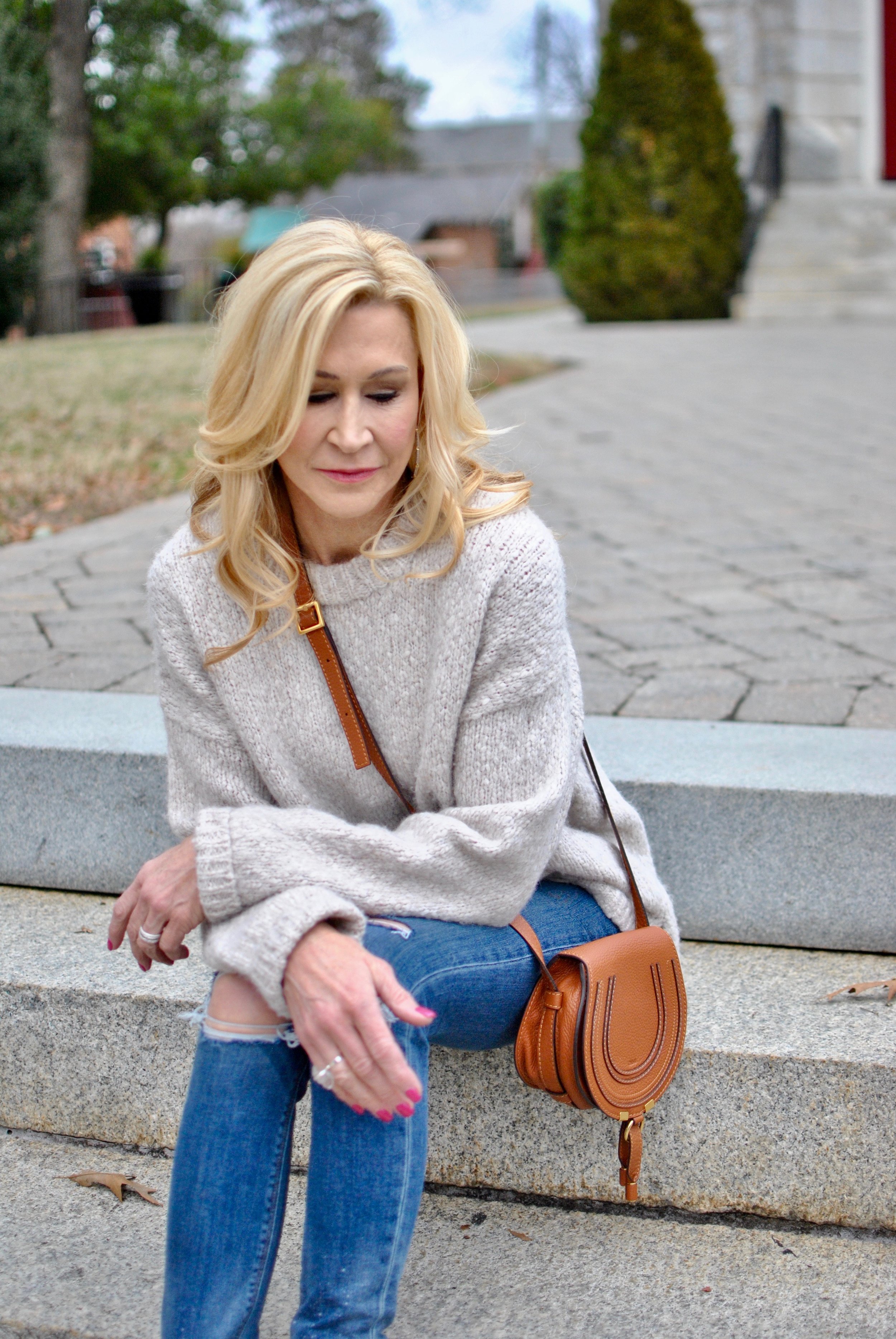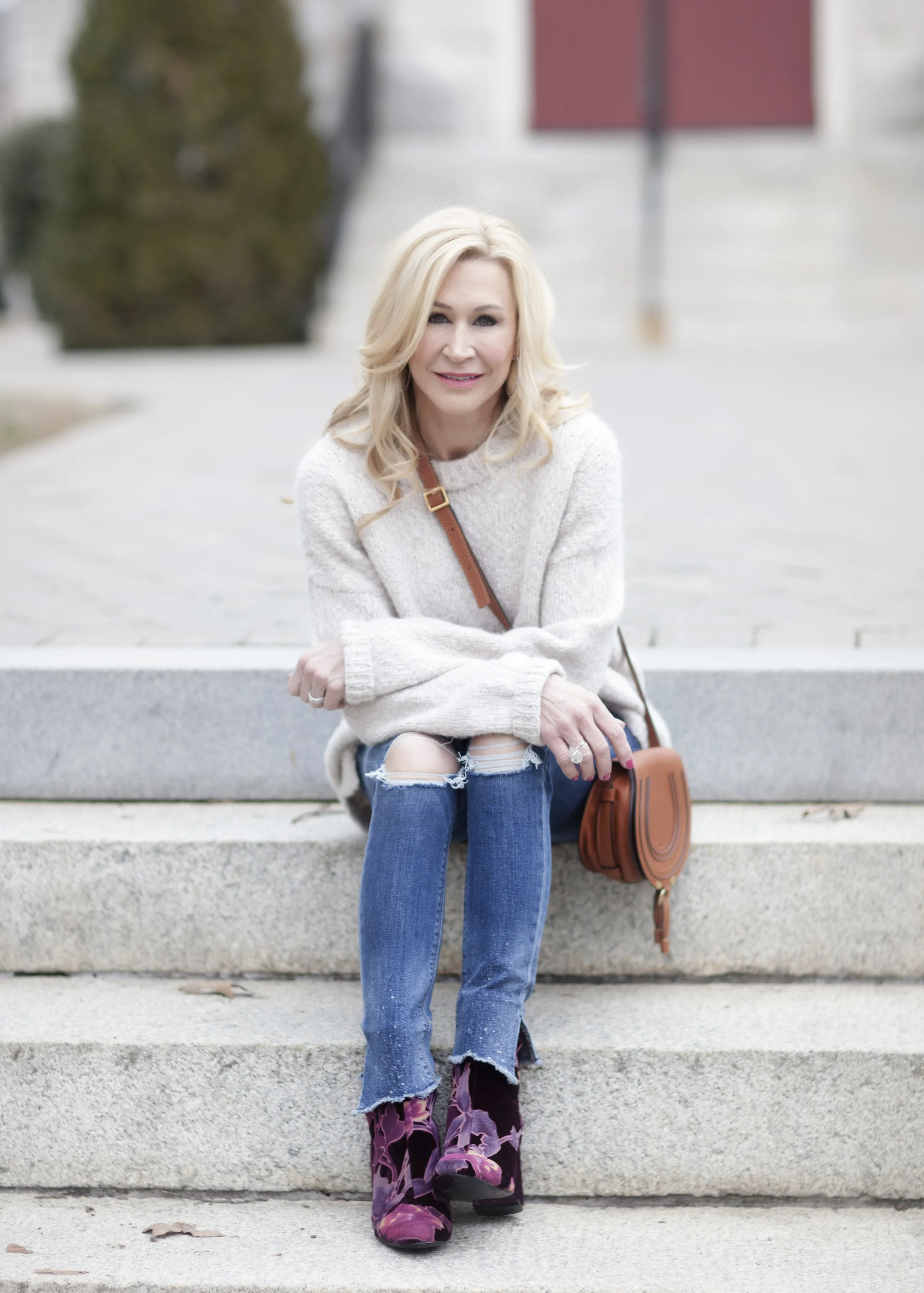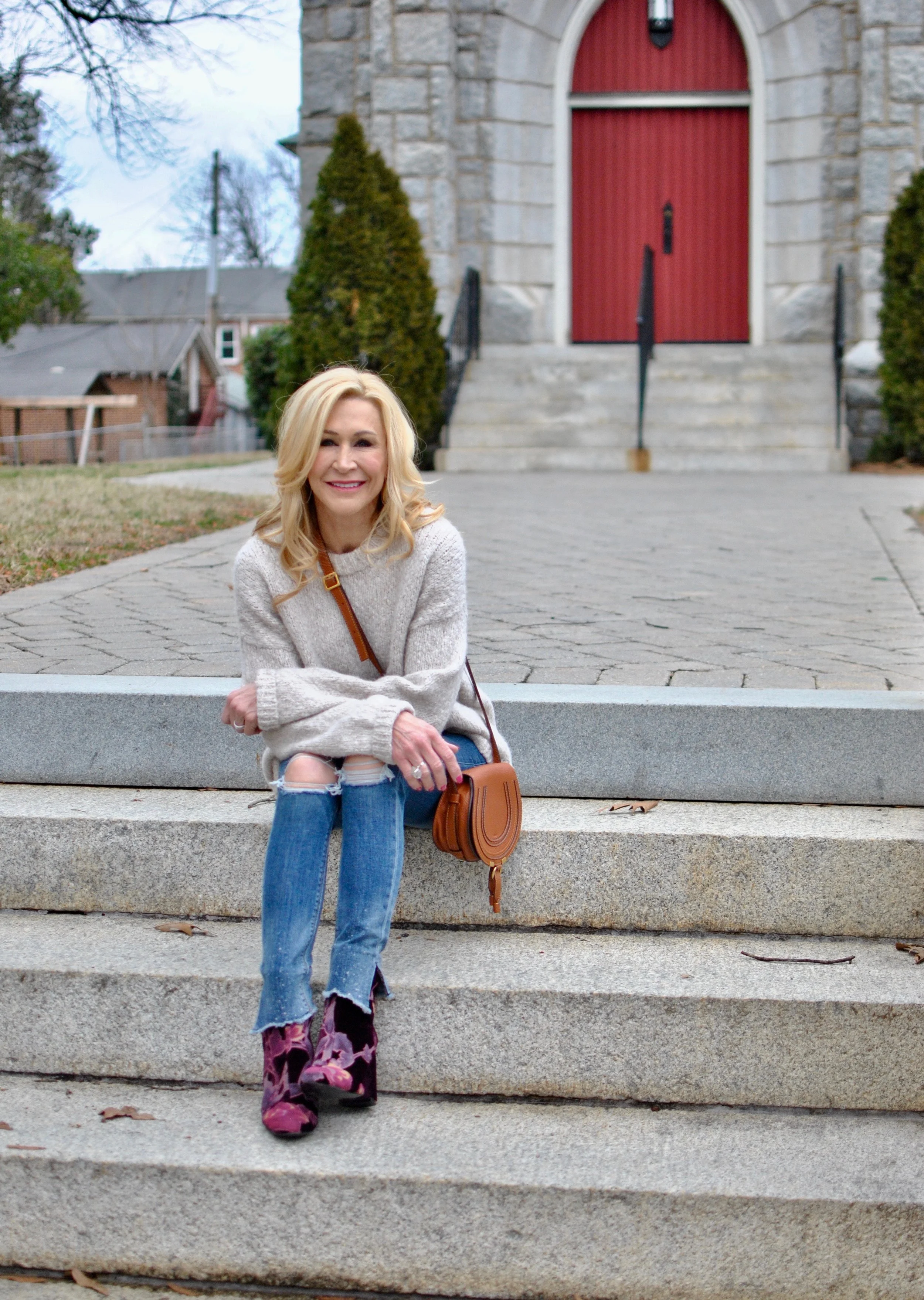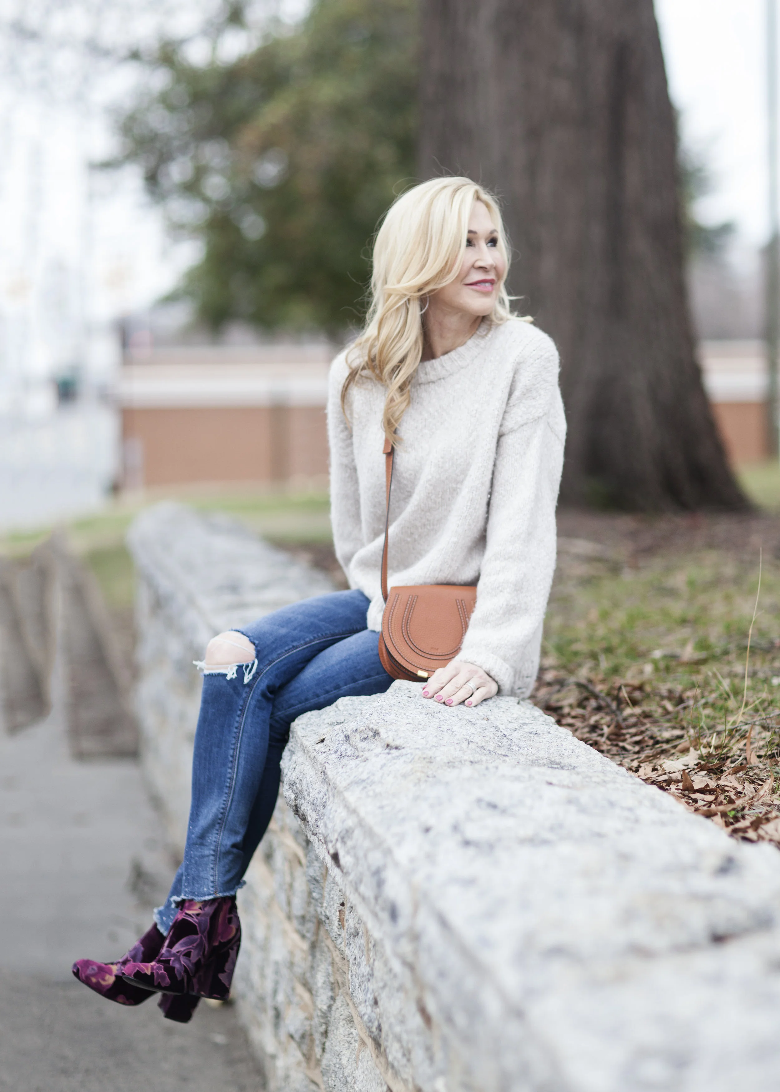We are having the craziest weather all across the country! It is unseasonably warm and is supposed to stay that way! I really love the warm weather, but I'm also a little sad because I haven't been able to wear some of my favorite winter clothes. These pictures were taken on a cold day and I probably won't get to wear this sweater or these booties (well maybe just a couple more times) again. I have loved the velvet trend and especially my floral Steve Madden booties! This fabulous distressed sweater was purchased last year from Eloise Boutique in Charlottesville, Virginia and is one of the most comfortable sweaters that I own, plus it goes with everything! I paired these two pieces with my Express Jeans (also love these from Zara) and my cute little Chloe bag! Oh well, I guess it's time to move on to Spring clothes...we will have winter again next year!