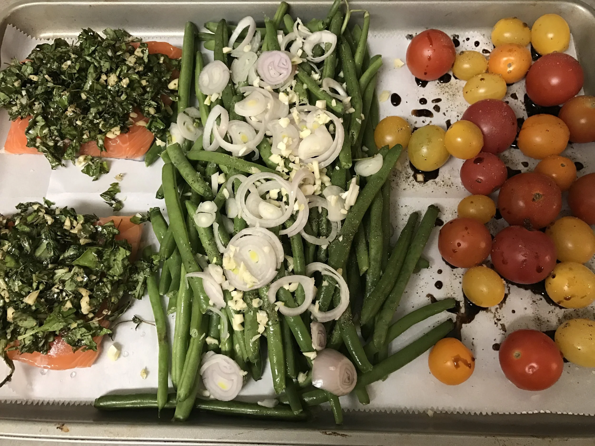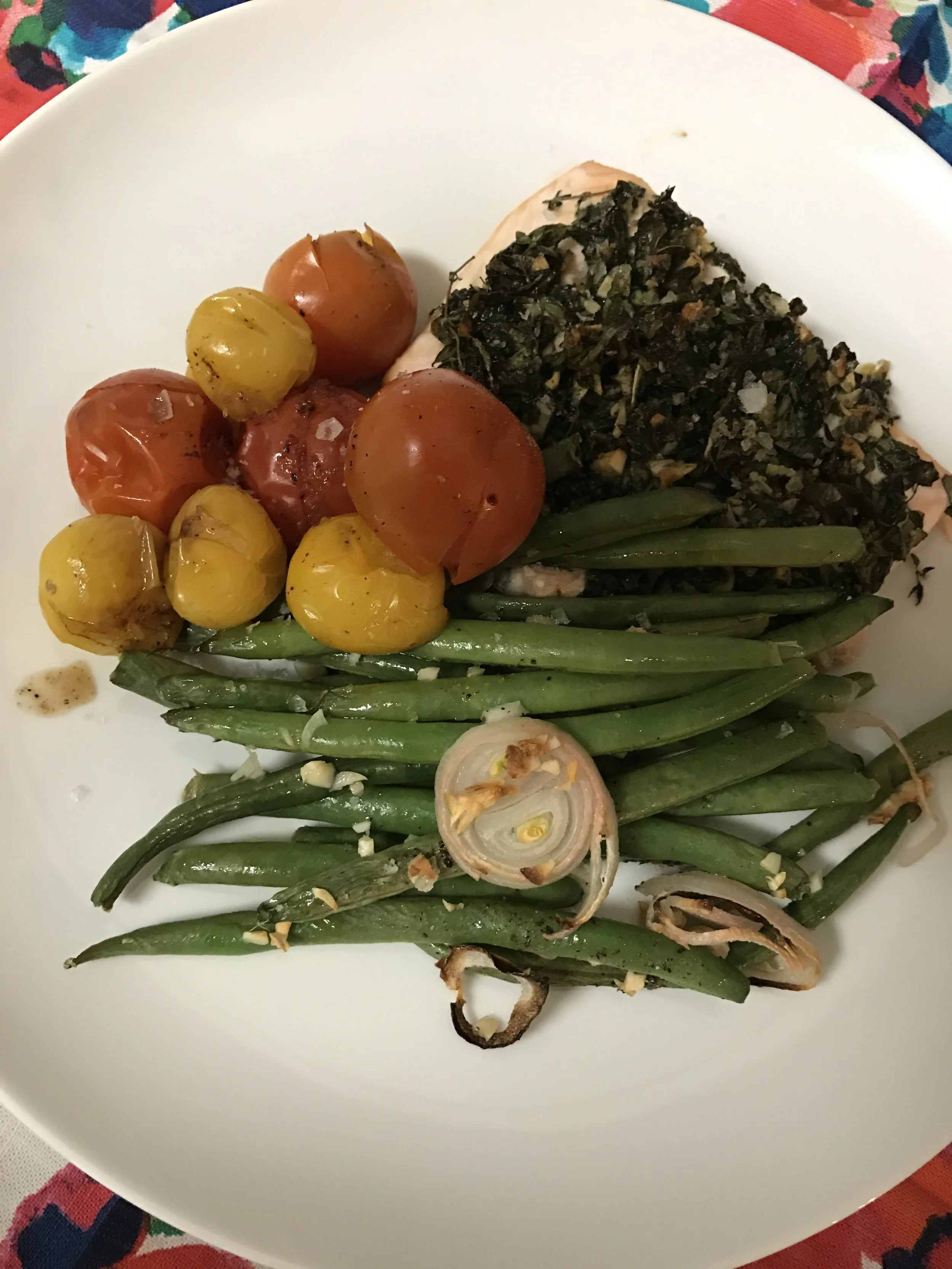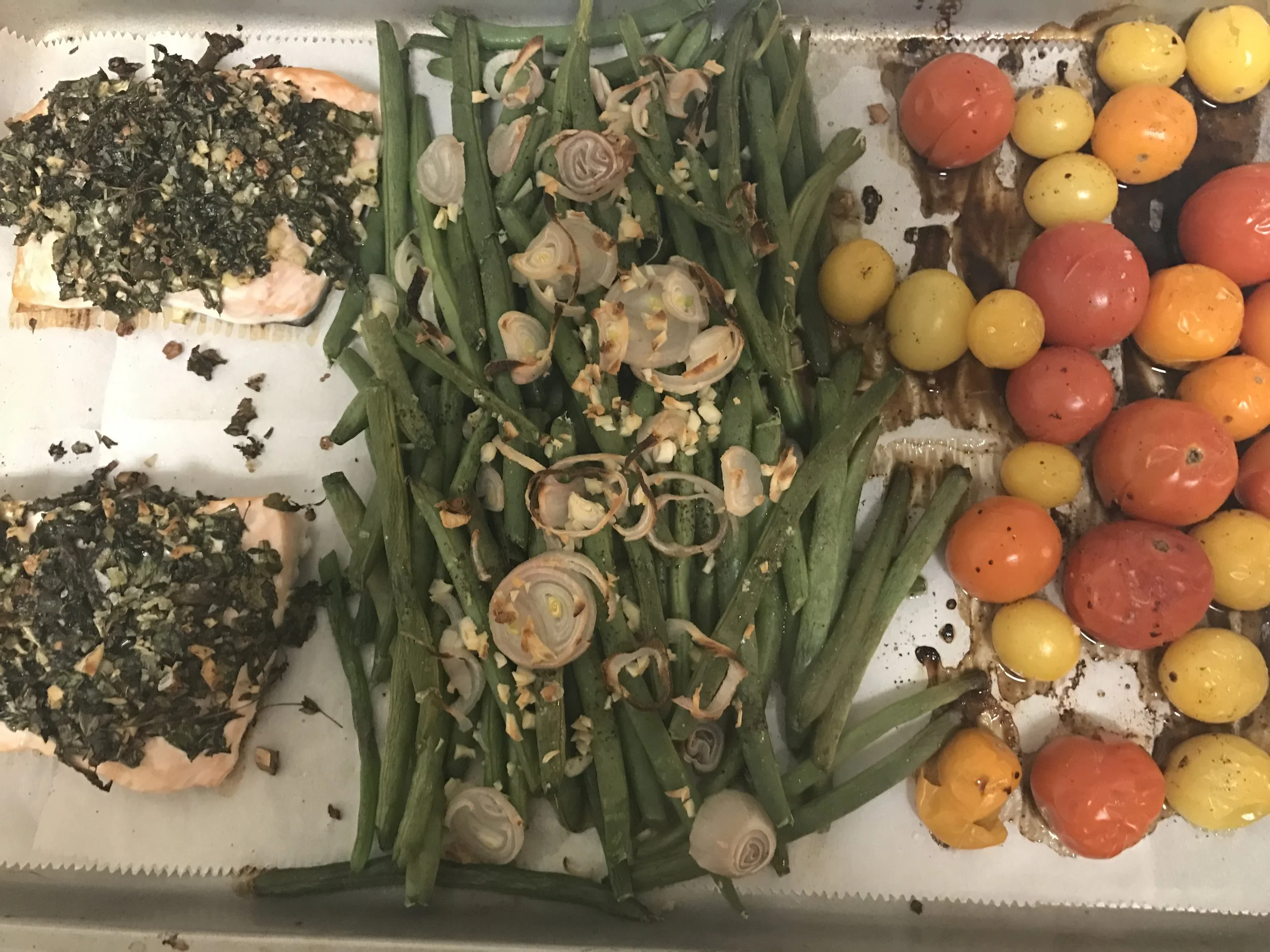As a busy mom of an eighteen month old, I am always looking for easy, simple meals that are also healthy. Hudson does not allow me to spend a lot of time in the kitchen, so when I saw this one sheet pan salmon recipe on the blog, Waiting On Martha, I had to try it! This dish took me less than ten minutes to throw together and it was beautiful and delicious. It also made our whole house smell amazing! I found the most perfect heirloom tomatoes at Trader Joe's and they absolutely made the meal for me. They were sweet and juicy and complimented the more savory salmon and green beans perfectly. I also used Maldon Sea Salt, which is one of our favorite things. It makes everything taste better.