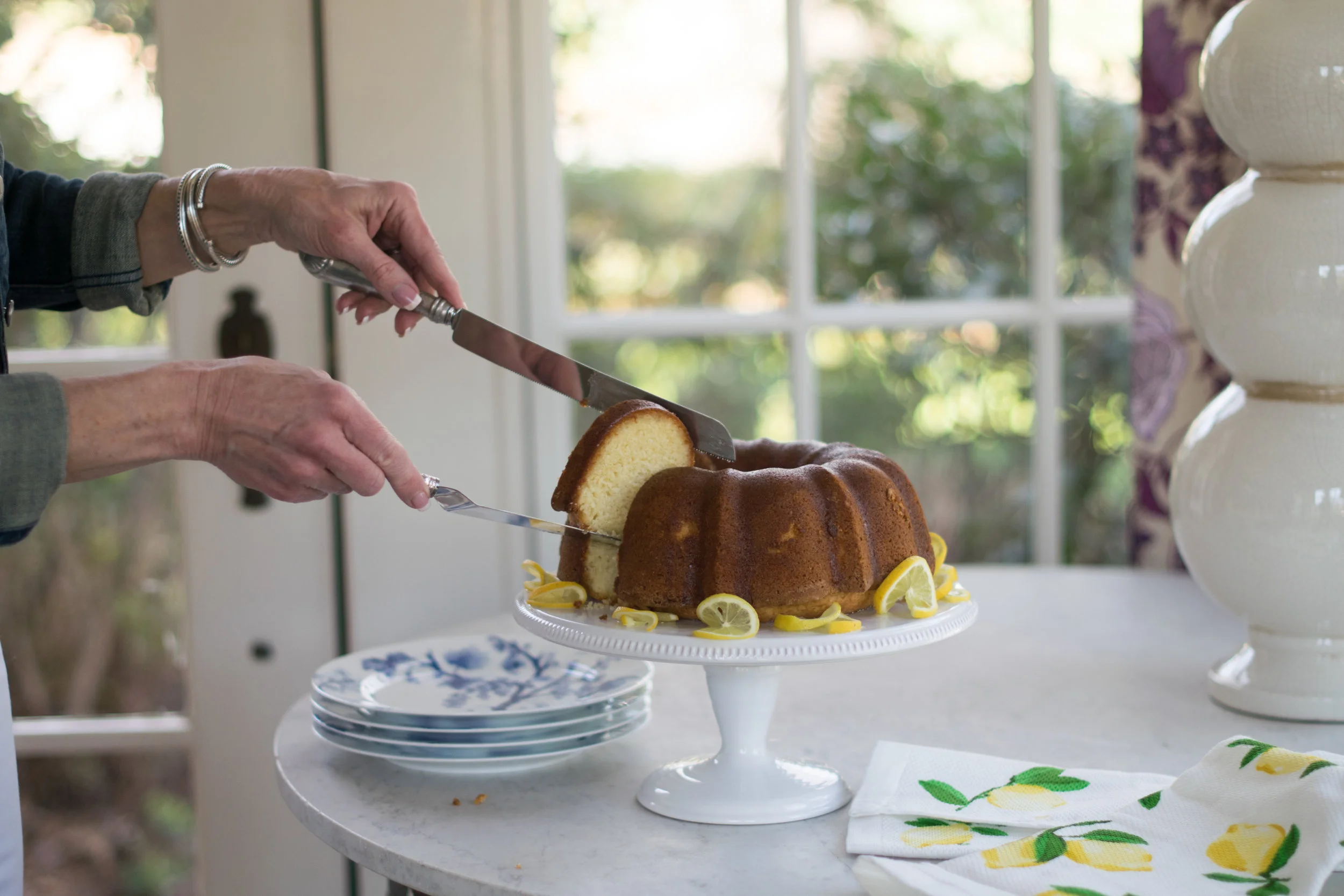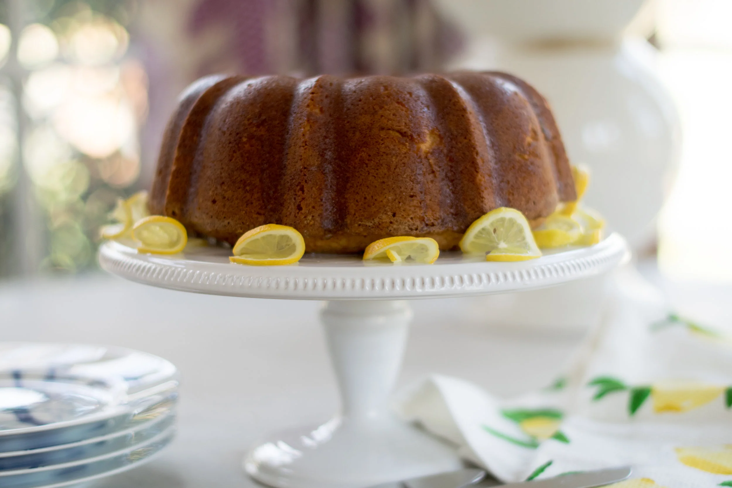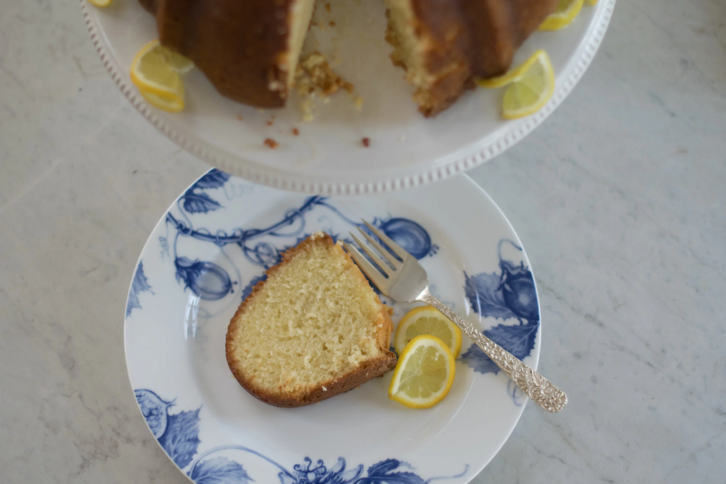 It was so bright and sunny that I decided to serve the lemon pound cake in our sunroom. I love the way it turned out and it was a beautiful presentation on a white pedestal cake stand with lemon slices for garnish. I glazed it with a lemony glaze that made it very moist and even more delicious!