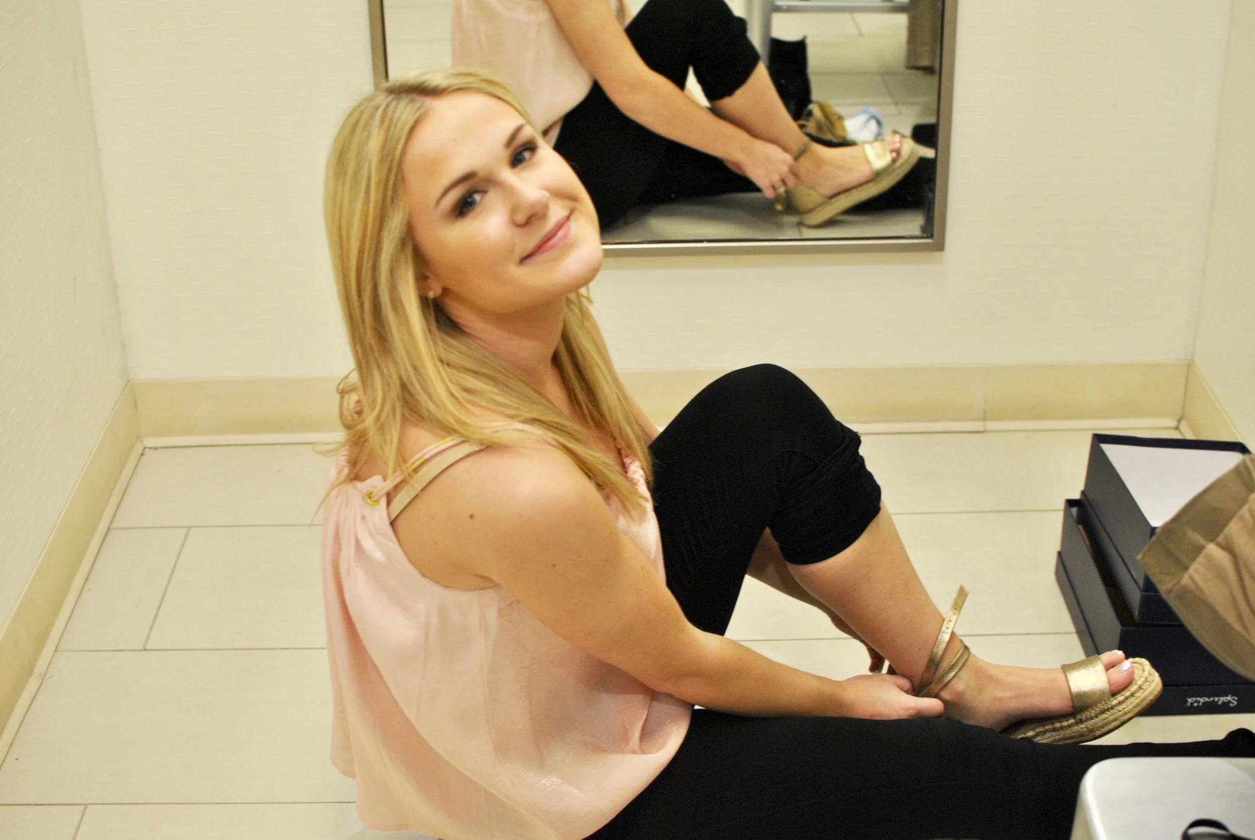 Of course, we recruited someone to take our picture! The pink pouf in the Cabi outlet was just to cute to resist!