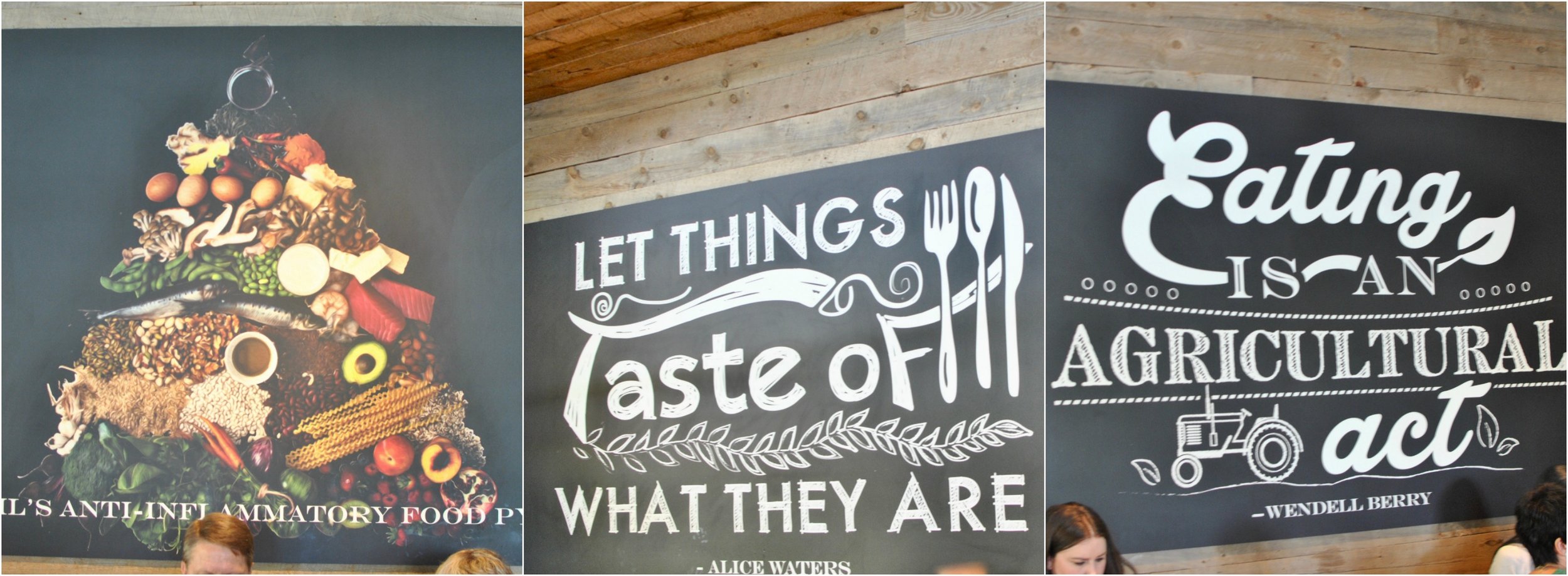 The signs in the picture below are hanging in True Food and are quotes from three of my favorite people! Alice Waters basically started the organic food movement and has been an inspiration to so any people with her cookbooks, school yard gardens, gardens in prisons, and her famous restaurant Chez Panisse in Berkley California..