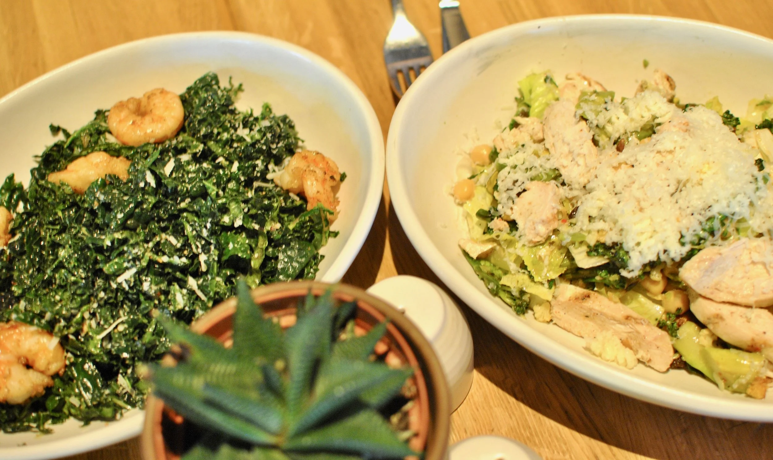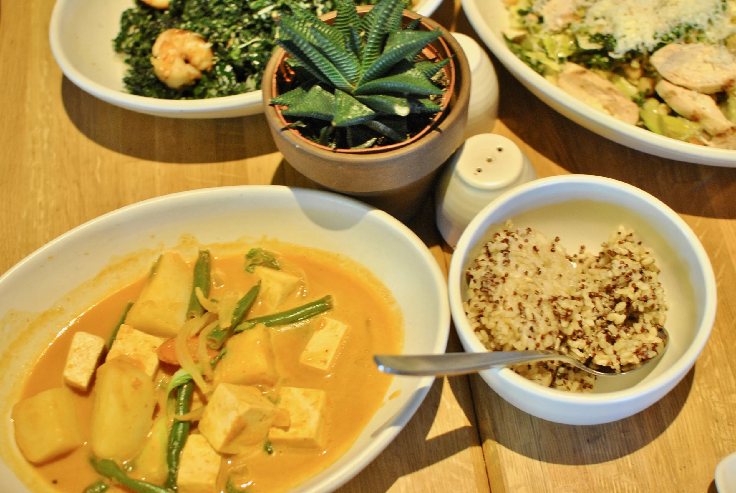 We had Kale Salad with Grilled Shrimp, a Cesear Salad with cauliflower, chickpeas and chicken, and a Spicy Curry with Tofu!