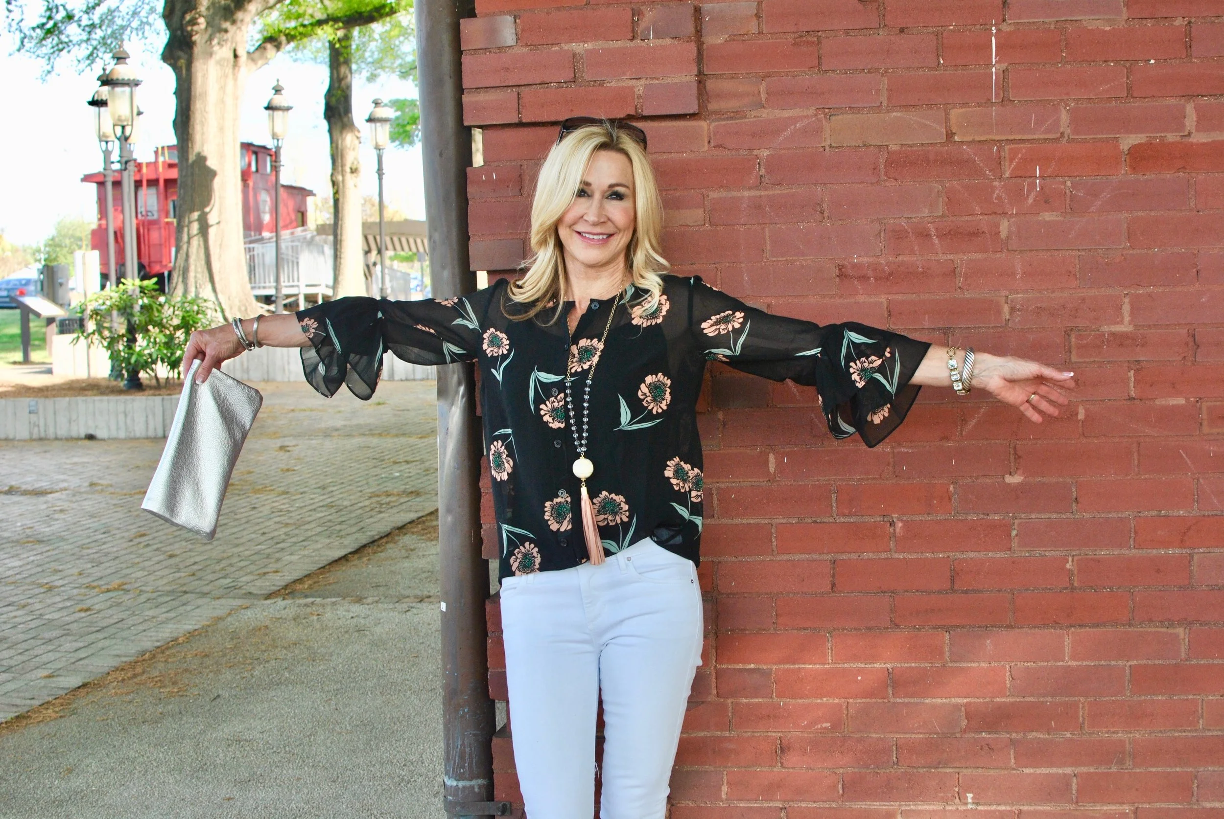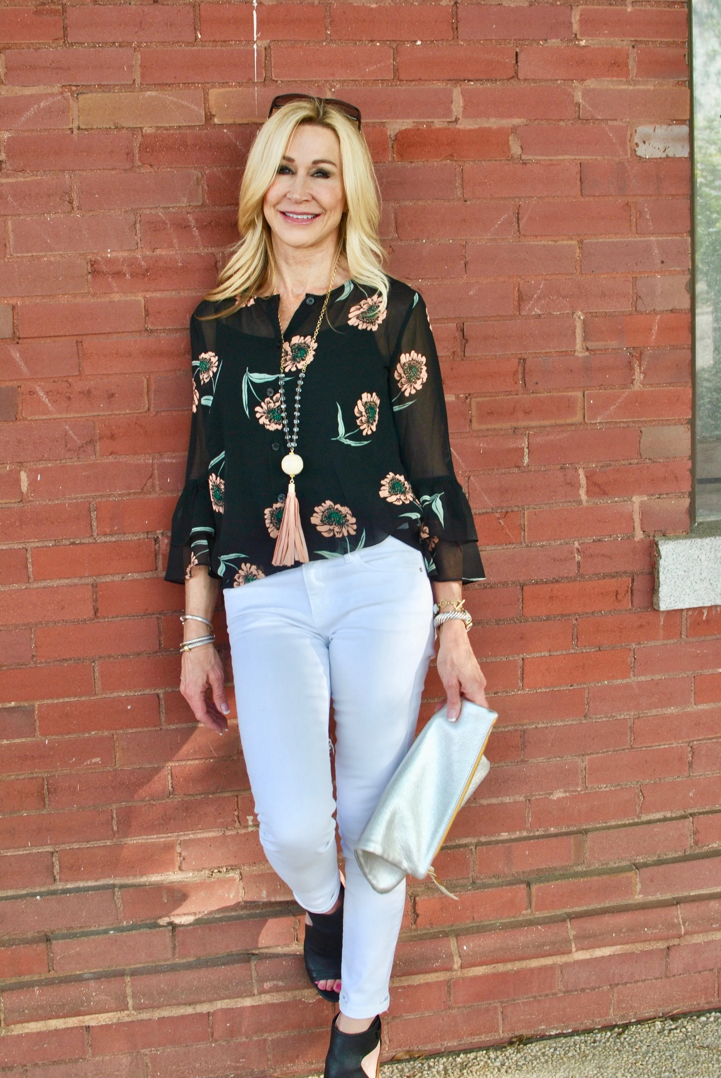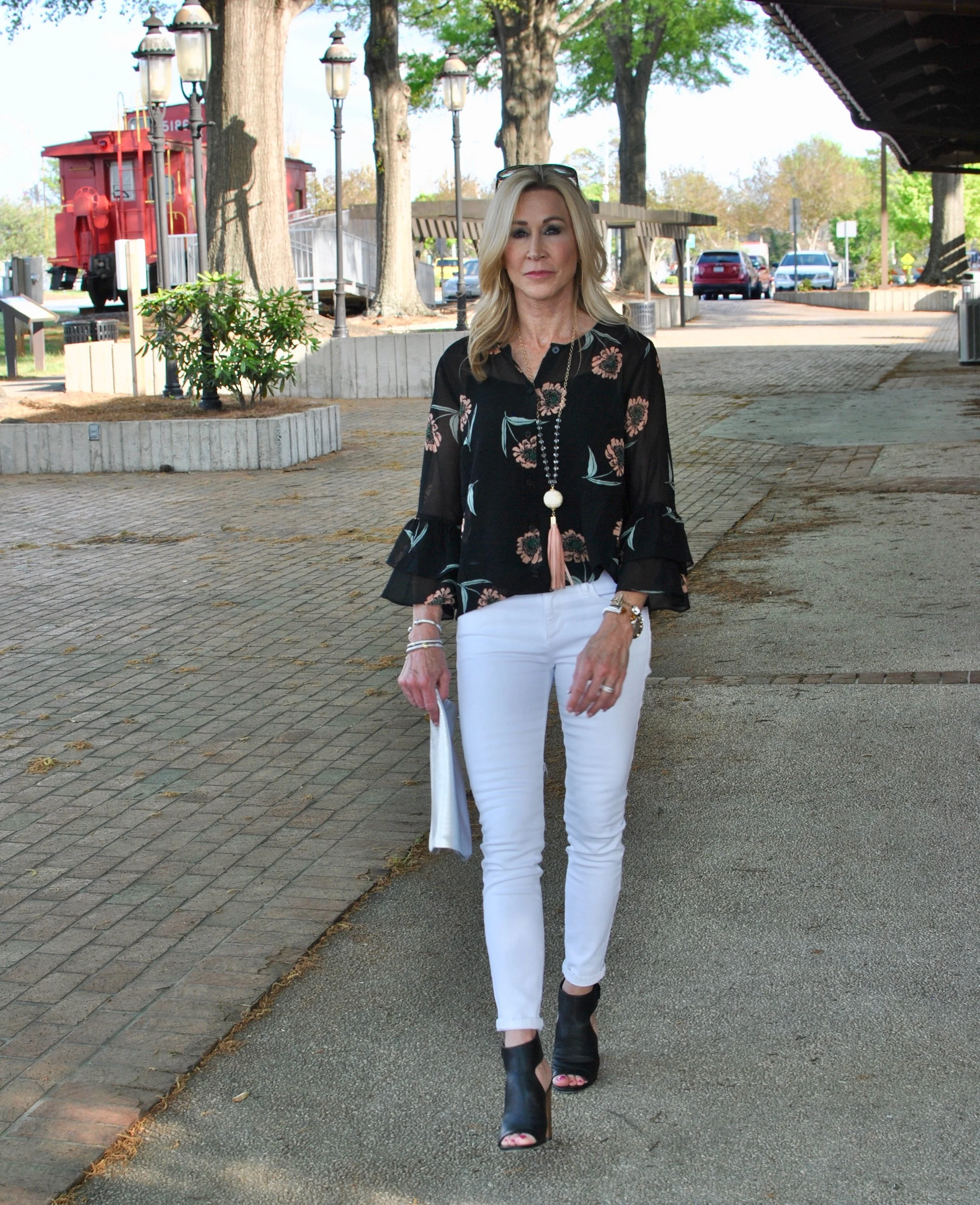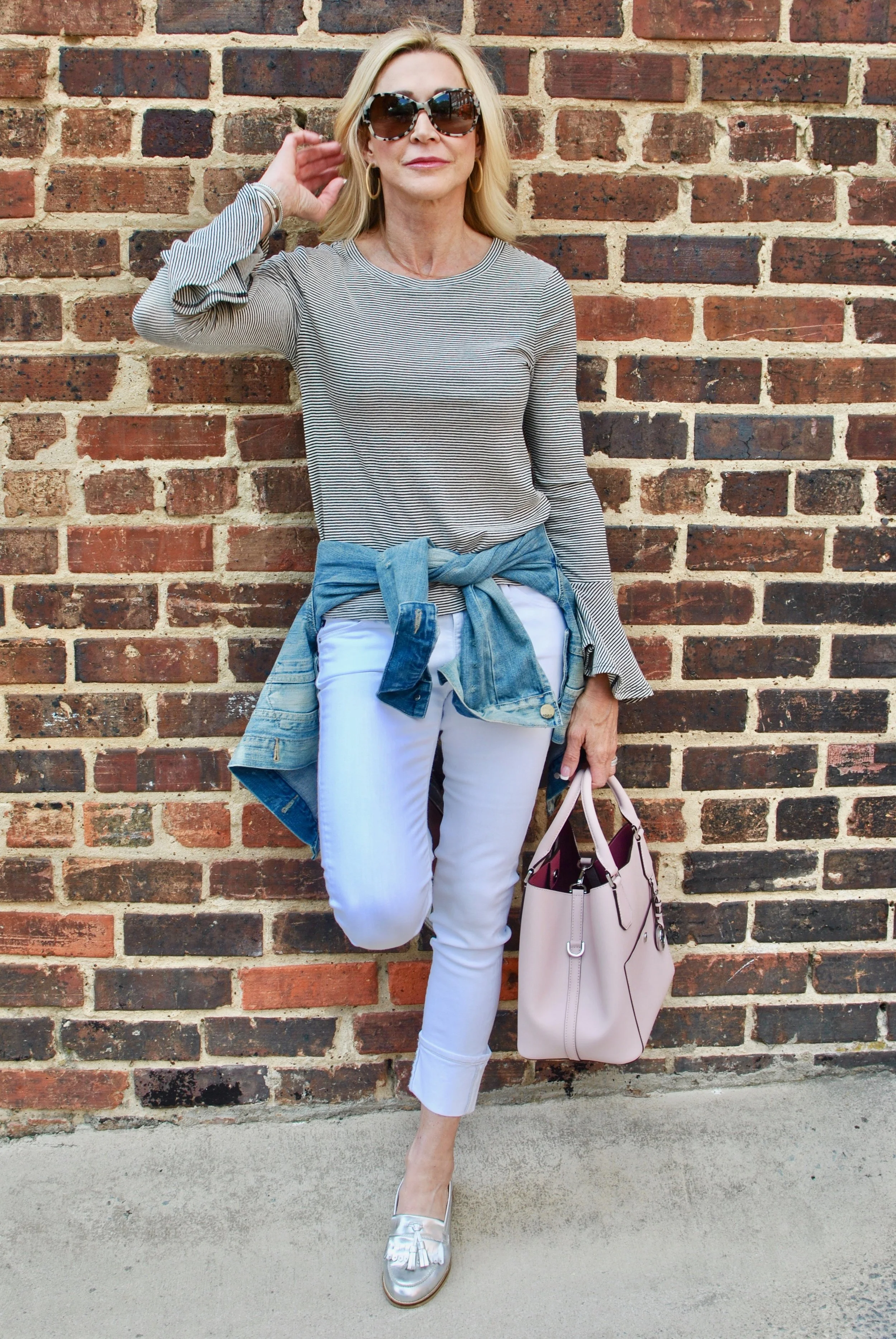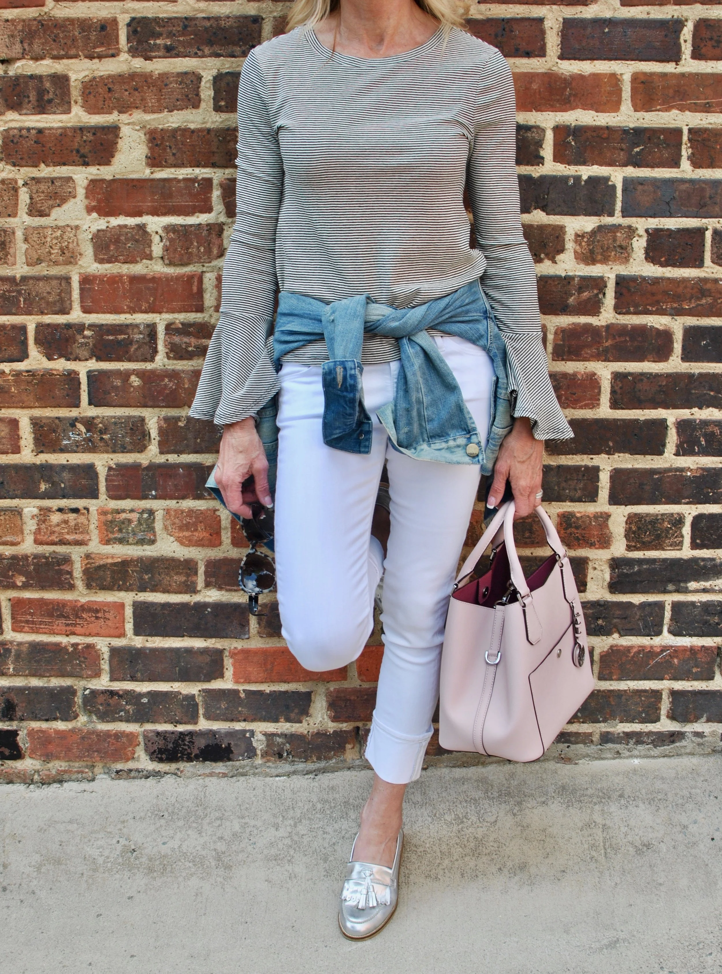 Cropped white jeans are a staple for spring and they are my go to when I'm in a hurry and don't have time to think of anything else. They go with most any shoe from espadrilles to loafers as I'm wearing here. This outfit came together really quickly and I love the way it looks. I'm usually cold in the air conditioning so the jacket is great to throw on if I go inside. The bell sleeves on the shirt look great with the jacket sleeve rolled up just a bit and the pink bag just makes me happy!
