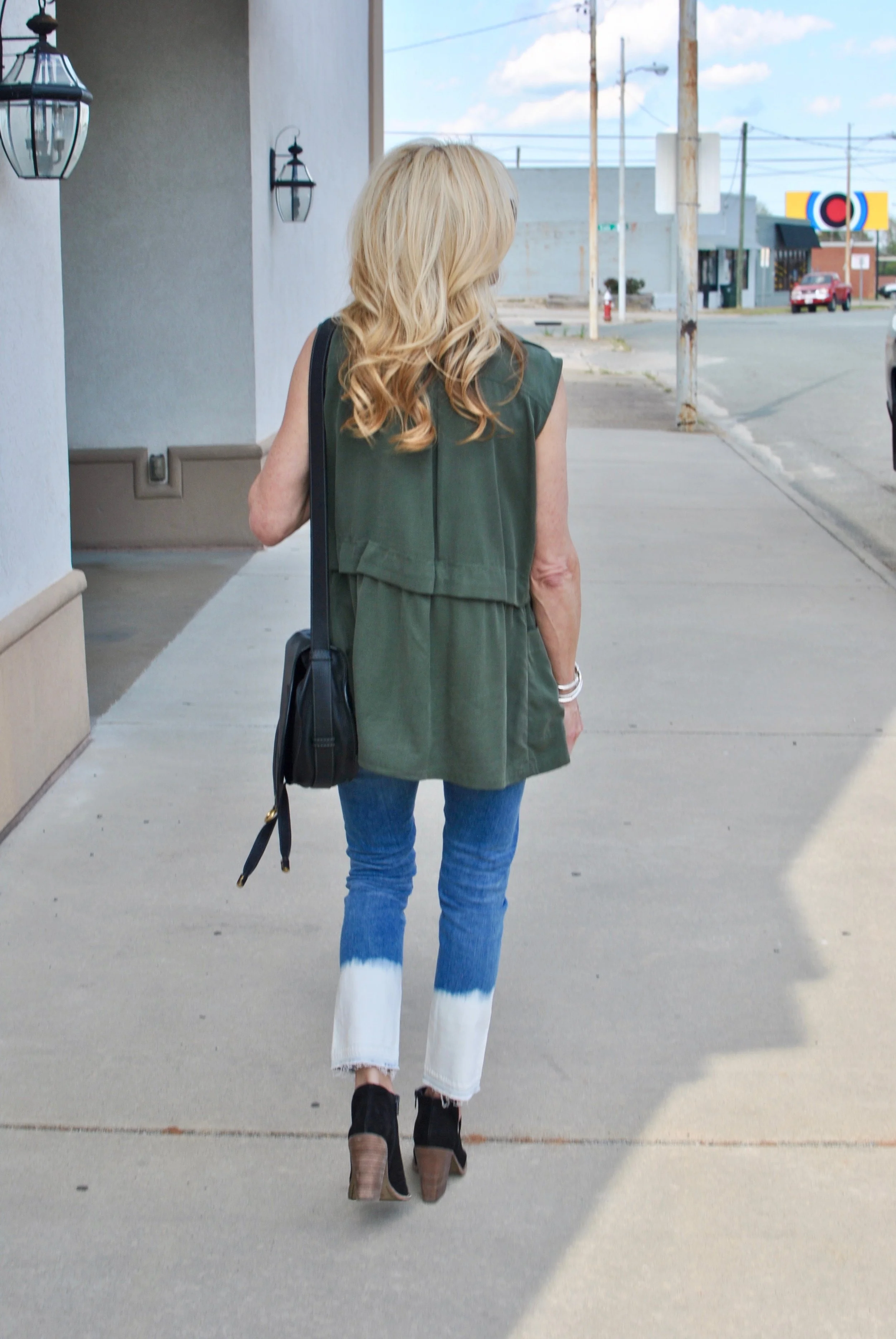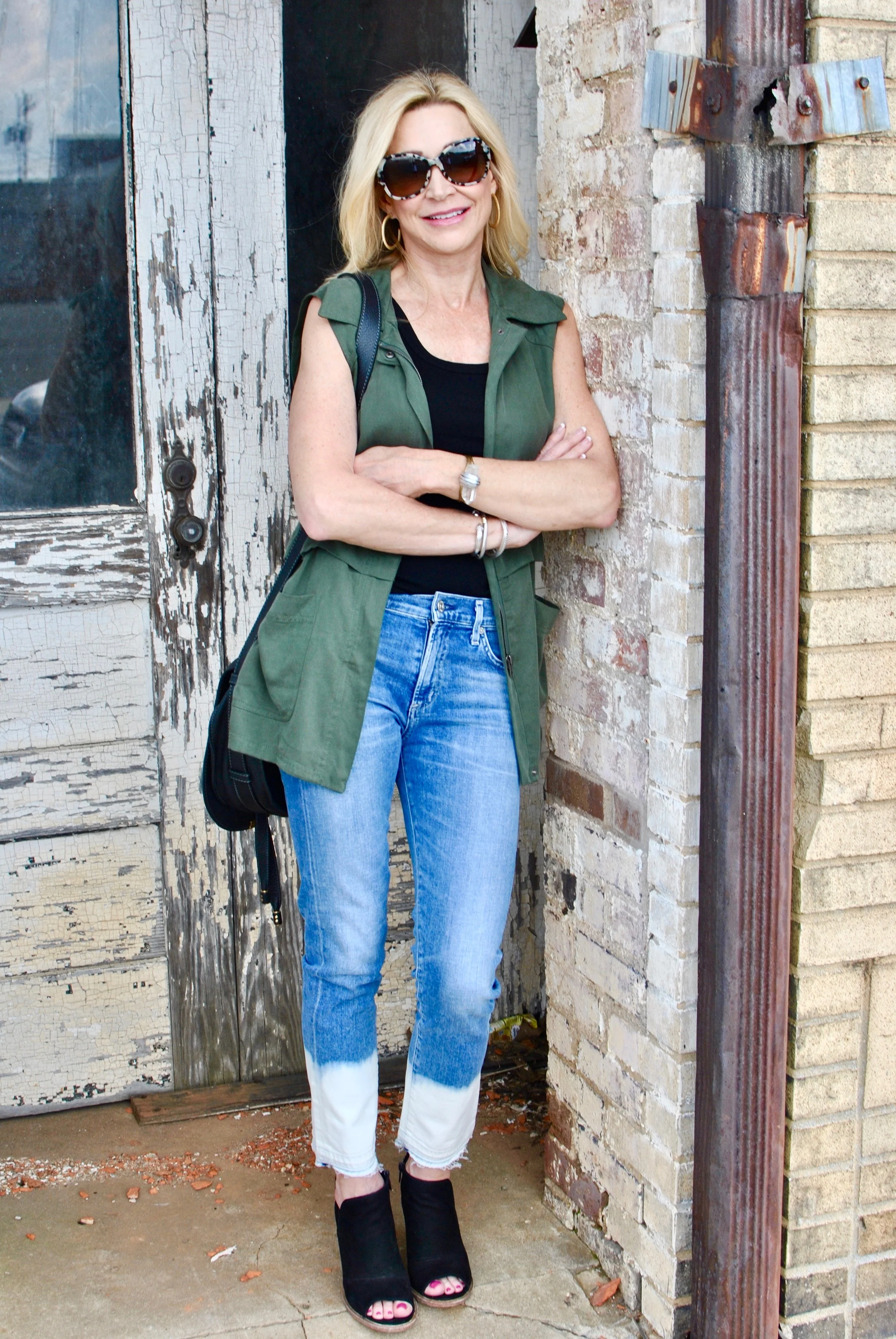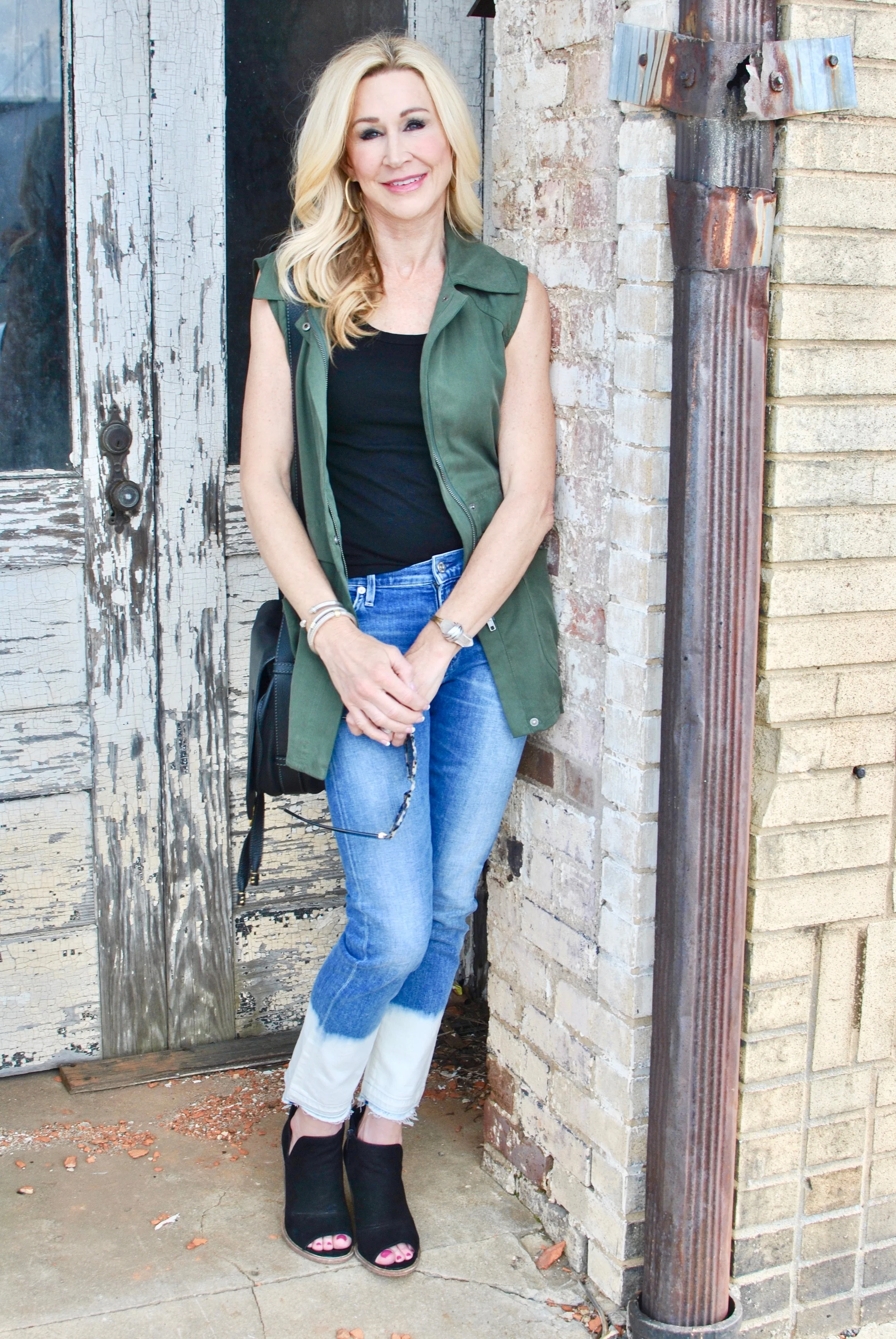 Either you love these jeans or you hate them, that's the reaction that I've gotten anyway! I think they are so different and that's what I love about them. They are very on trend right now as is the frayed hem. If you're looking for something out of the ordinary, these jeans are for you! I've paired them here with a basic sleeveless tee and an army green vest. This outfit would be great for early fall as well because of the neutral color pallet.