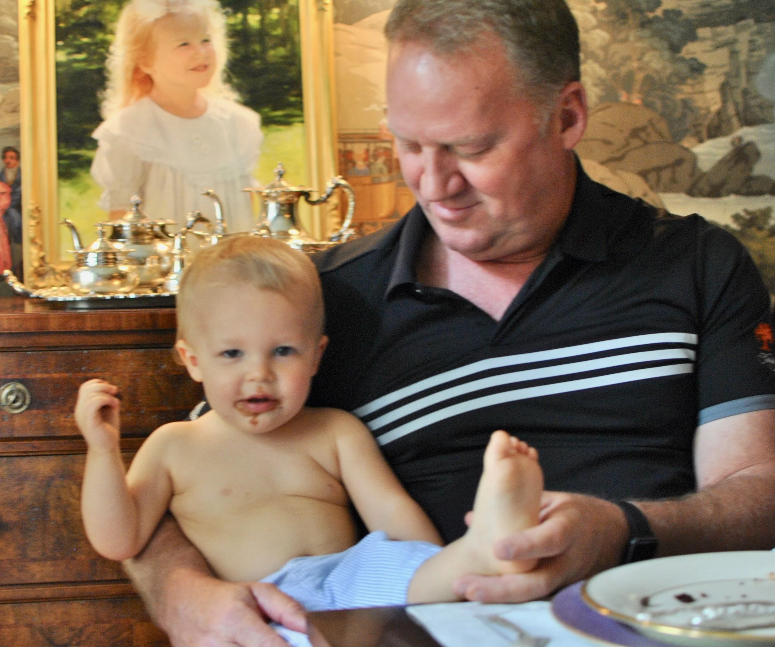 Hudson made quite a mess eating a chocolate cookie on his Uncle Gene's lap! We decided it was best to take his shirt off!