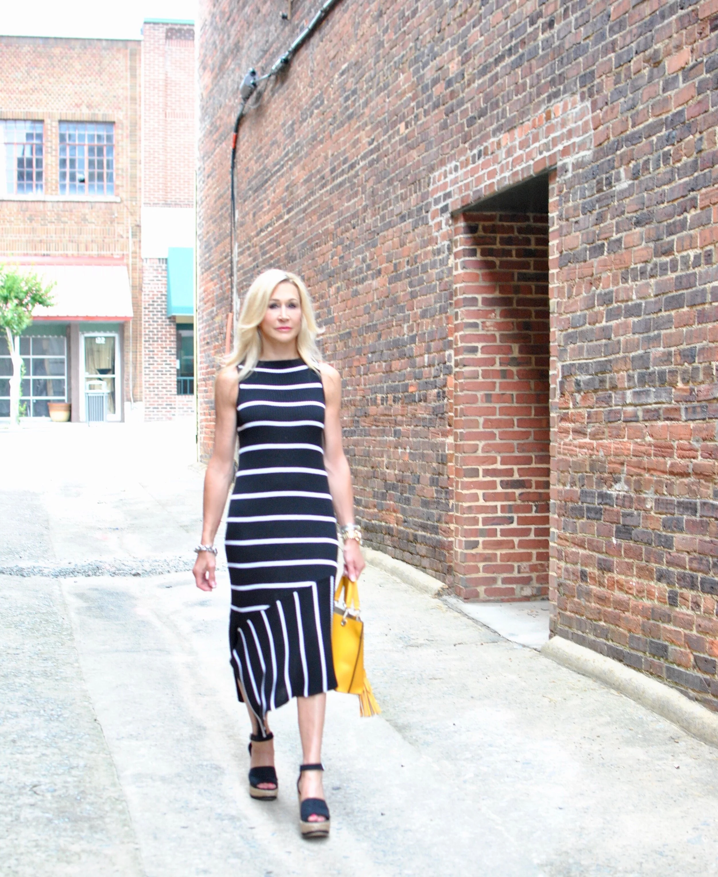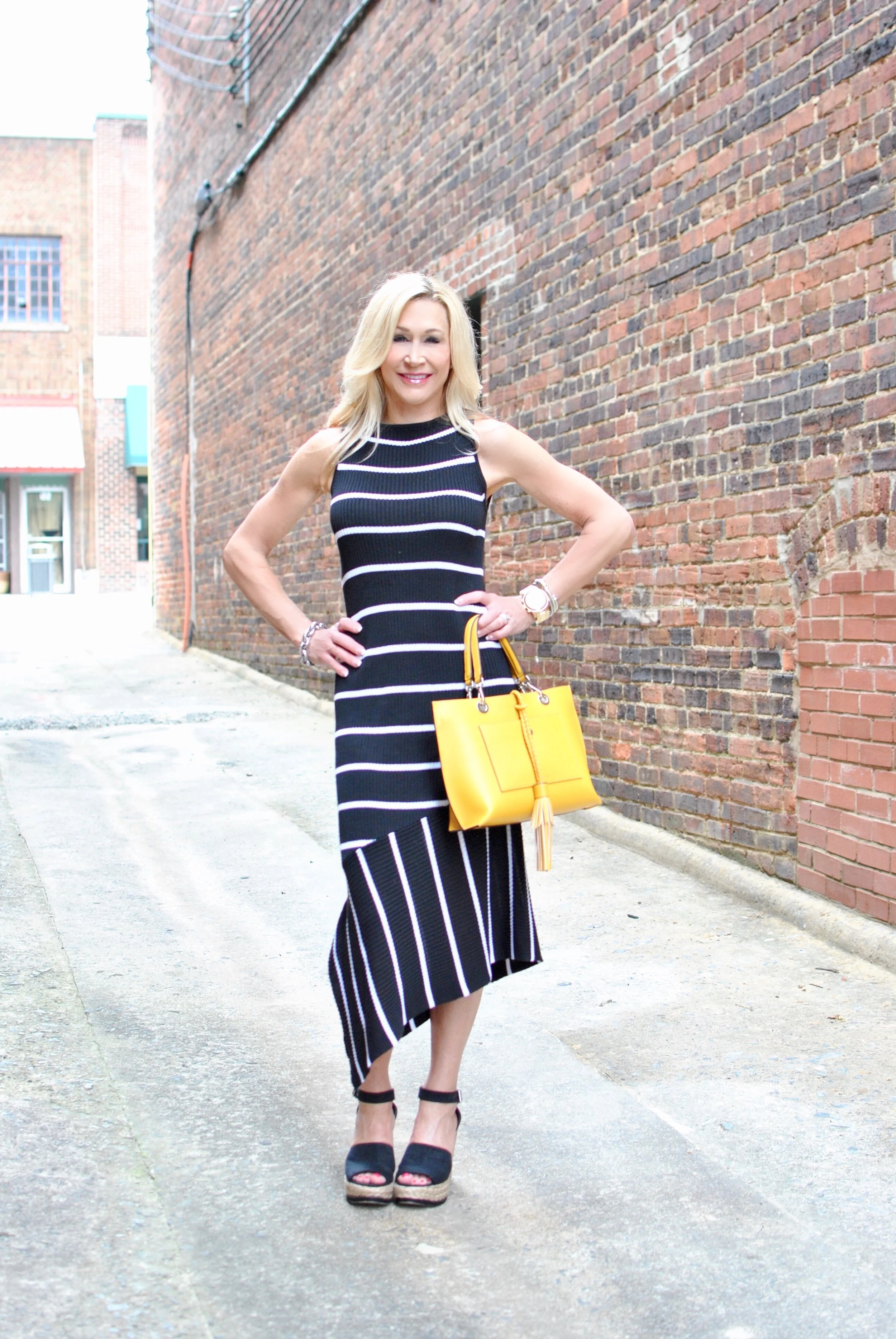 I love to wear stripes any time of the year, but they seem especially appropriate in the summer...maybe it's because they have a nautical feel. They are a staple for me and always feel relaxed and casual but classic at the same time. This dress from W by Worth is an easy go-to for just about any occasion and the flirty asymetrical hem makes me love it even more! I styled it with a bright yellow bag from Henri Bendel that I have been wearing nonstop! My shoes are by Stuart Weitzman and are great with jeans and everything else!
