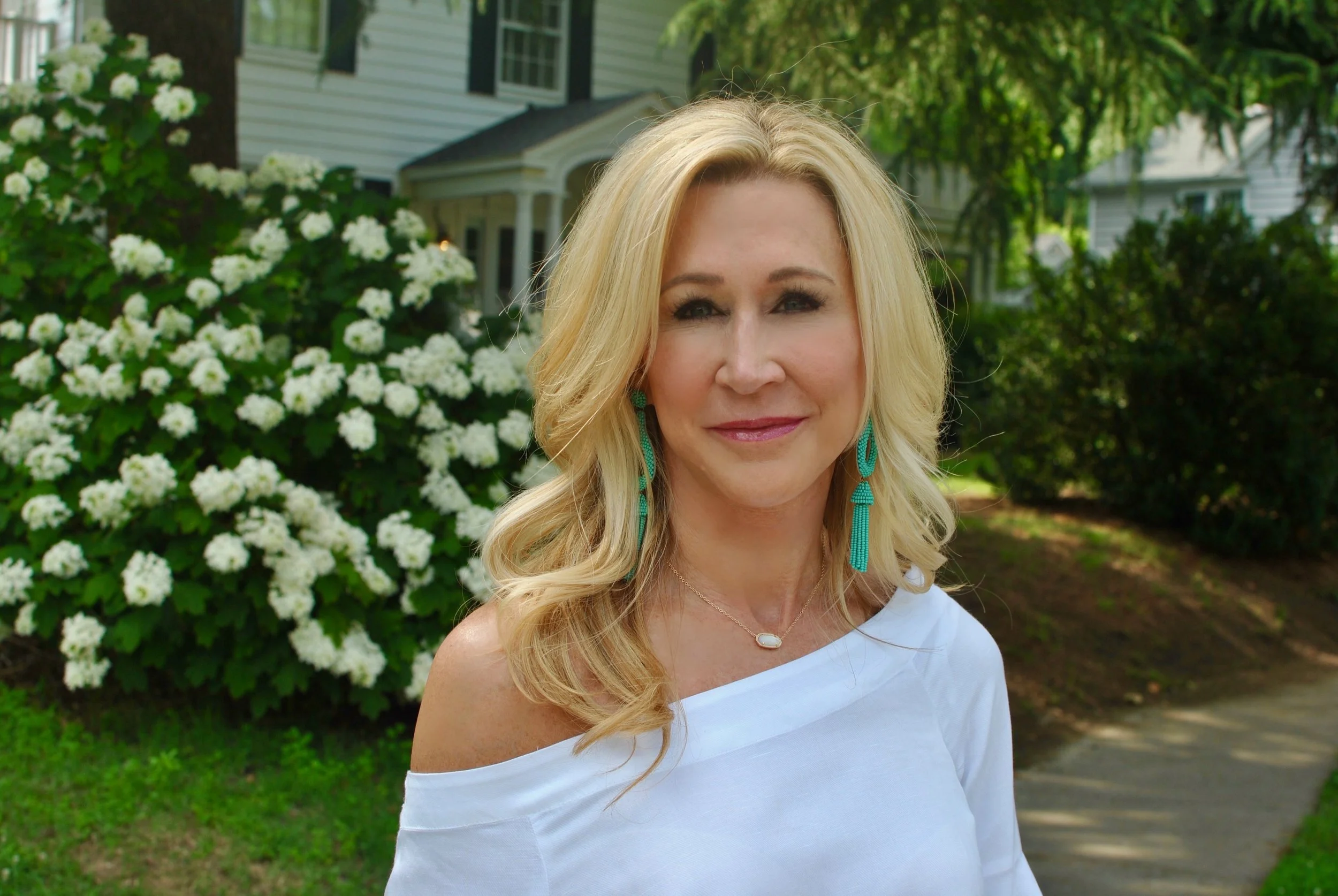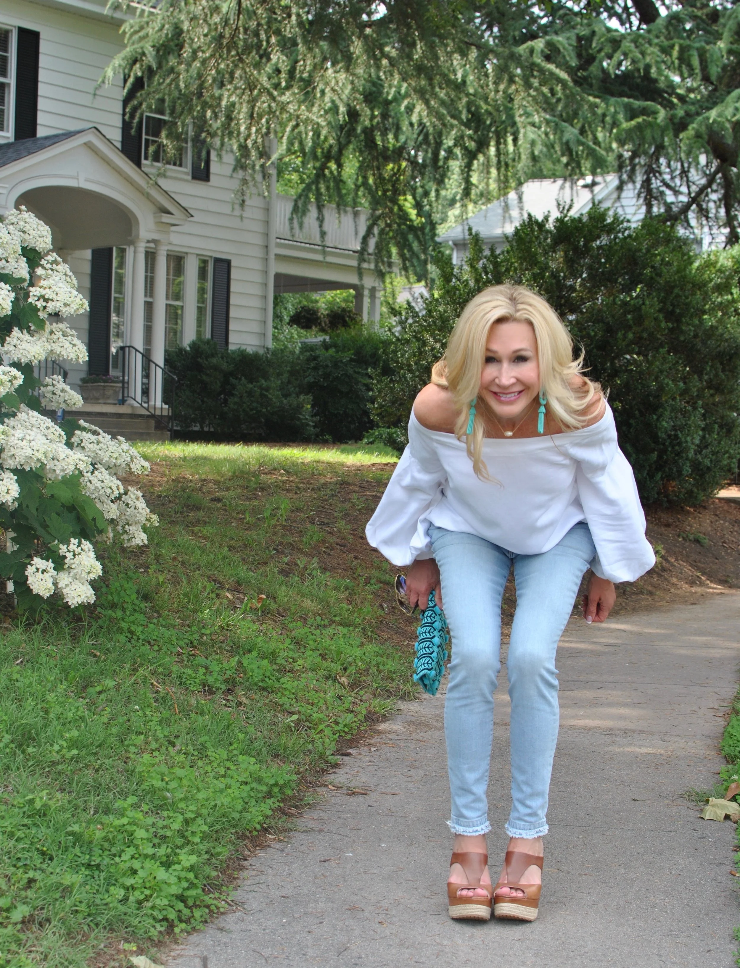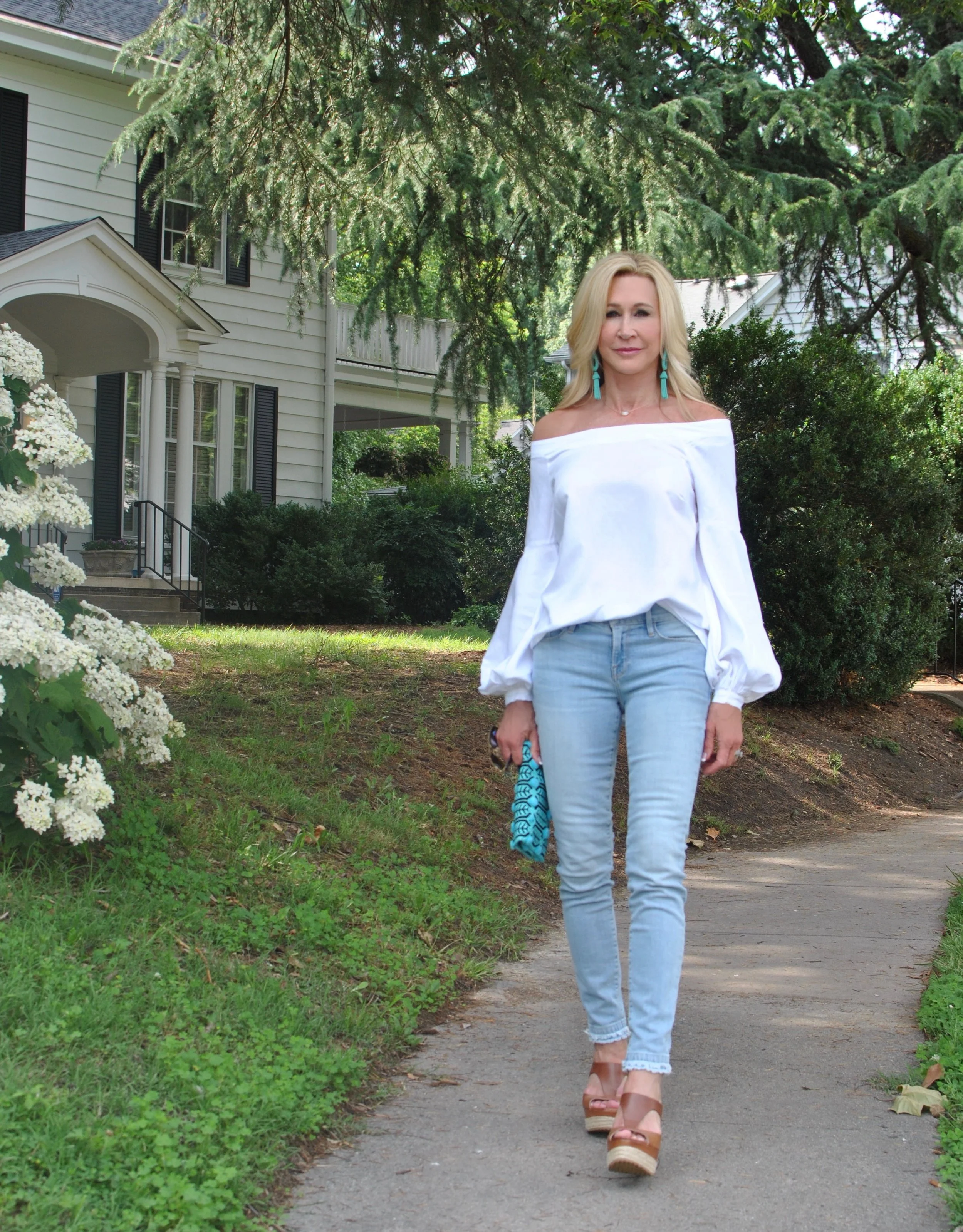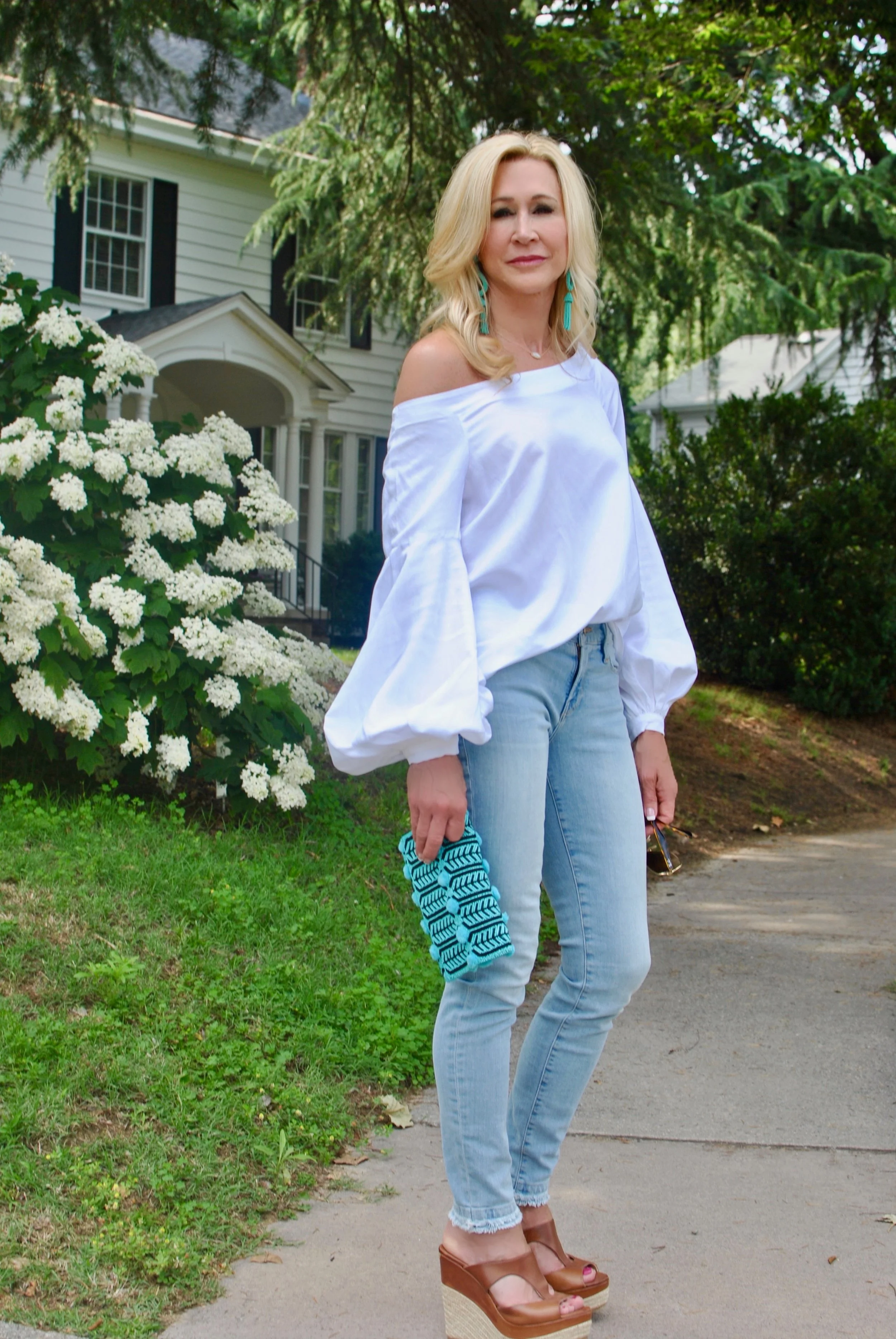 Jeans always feel right to me no matter the season, but in the summer, I love to wear lighter color jeans and they go beautifully with white and turquoise accessories! Oversized earrings are a huge trend right now and a great way to add a pop of color to an outfit. Embellished clutches are everywhere and can be found at every price point as can off-the-shoulder tops. This white top combines two trends...statement sleeves and off-the-shoulder.