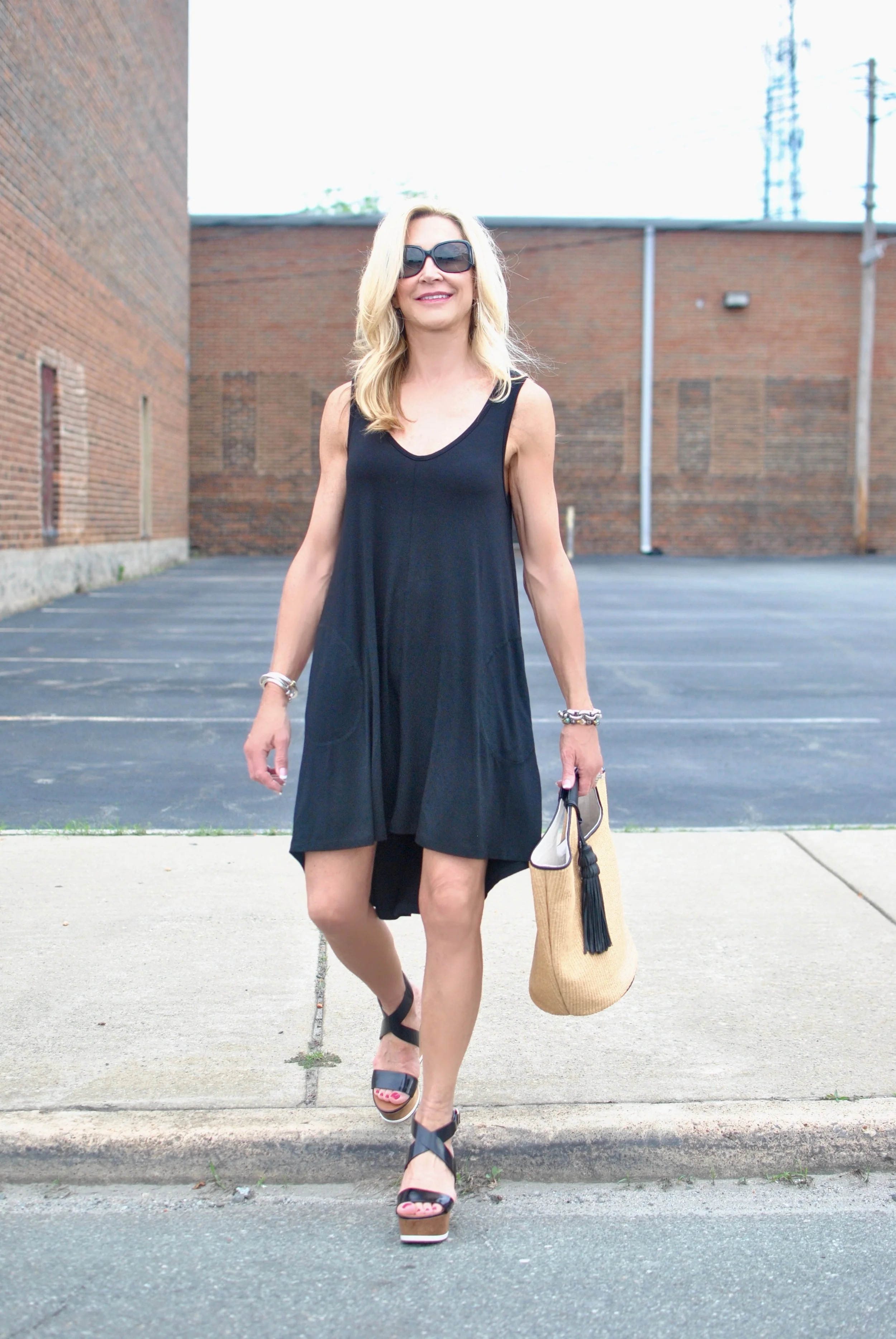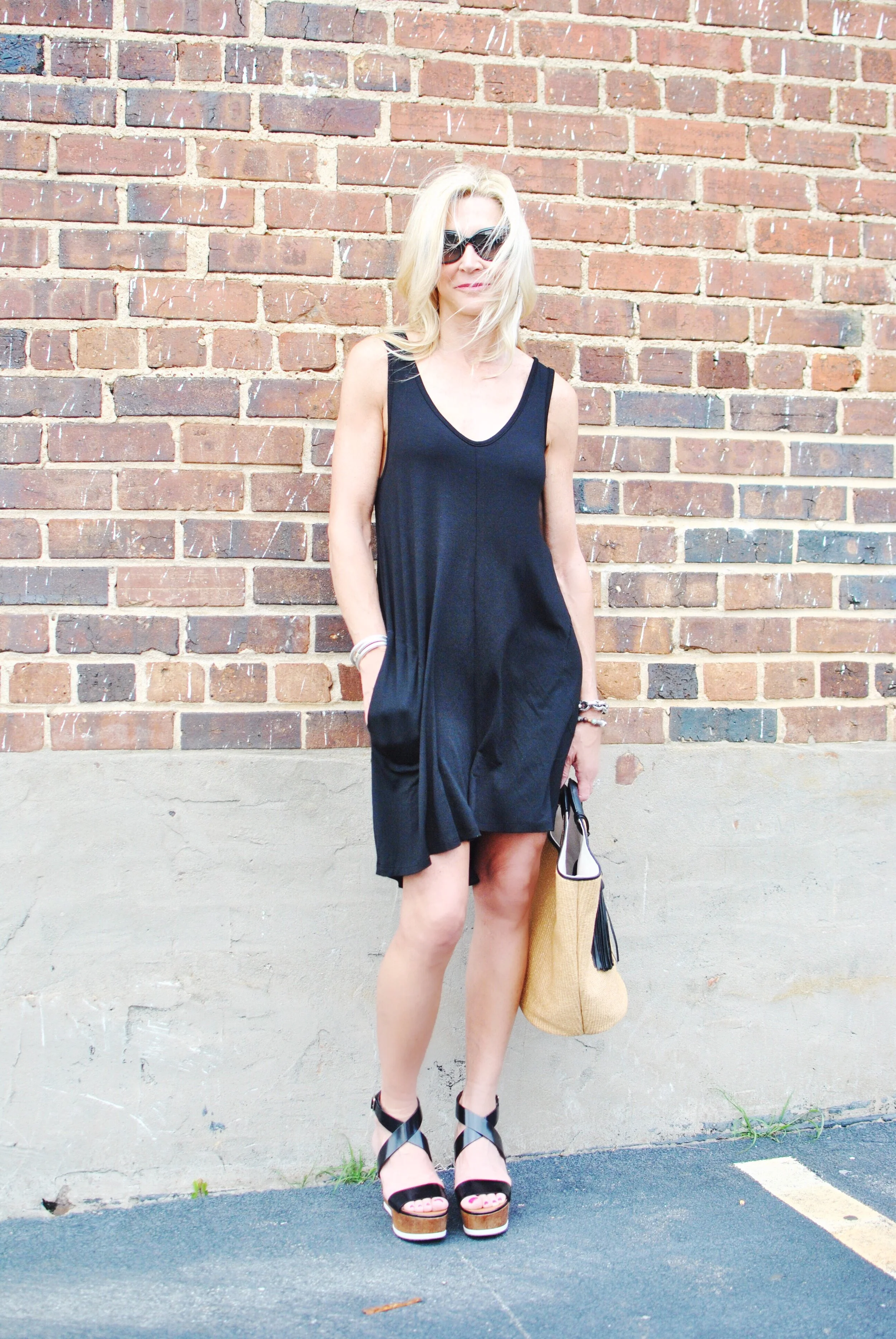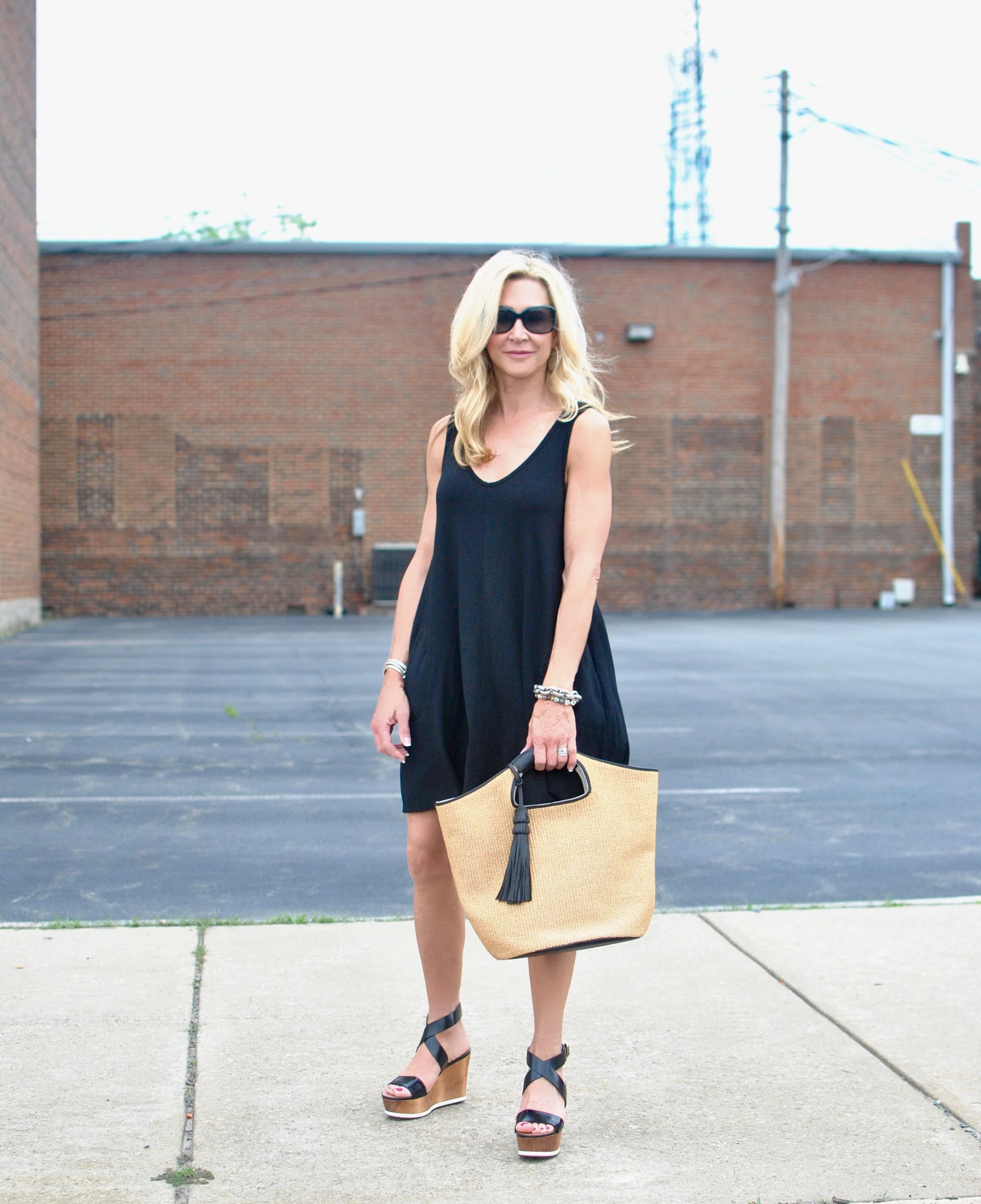 This little black dress is the most comfortable thing in my closet and I will be wearing it non-stop this summer. It would even be a great bathing suit cover up! I added a straw bag and platform shoes from last season, but flats would work as well. When it's so hot that you don't want anything to touch you, this is the dress to choose!