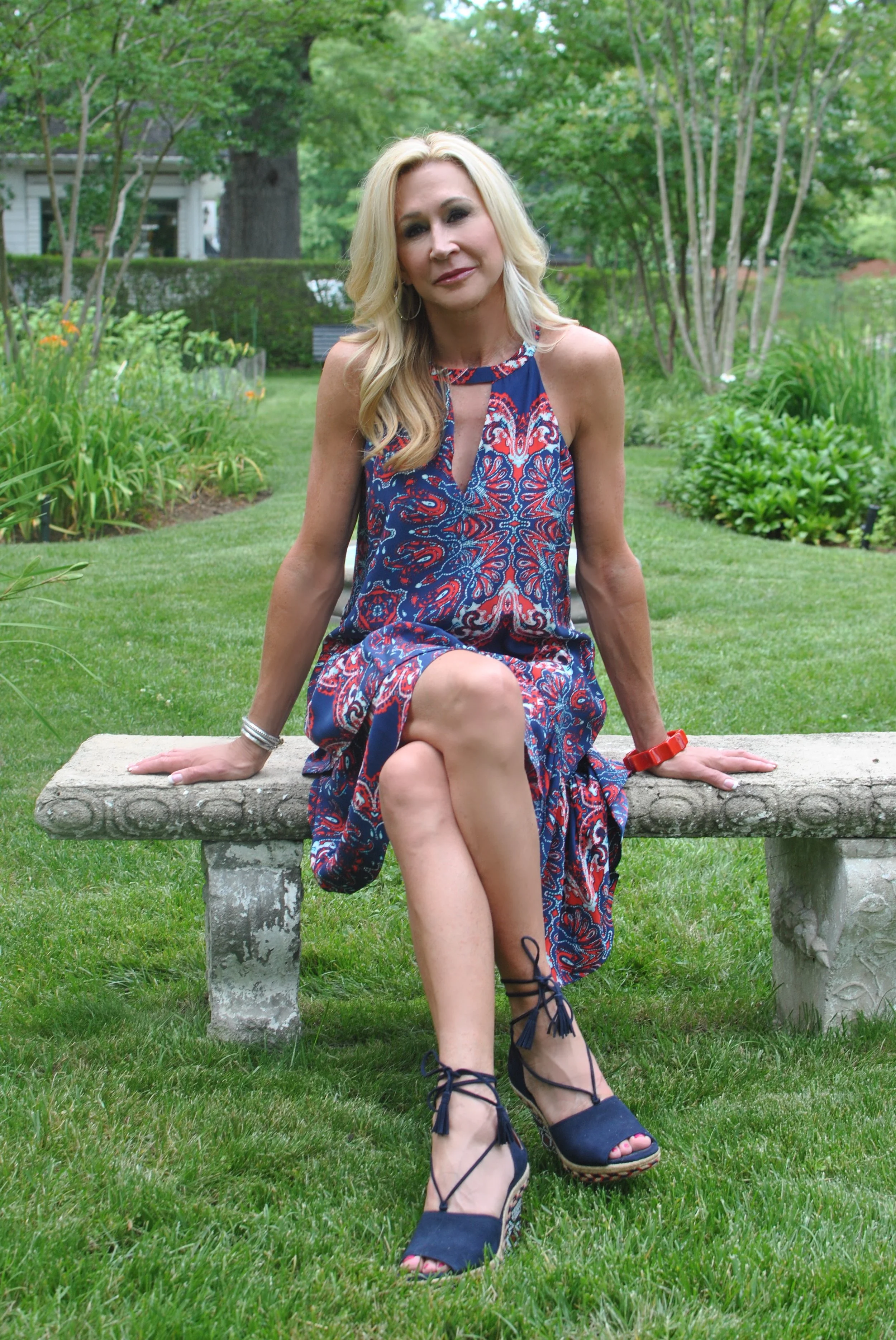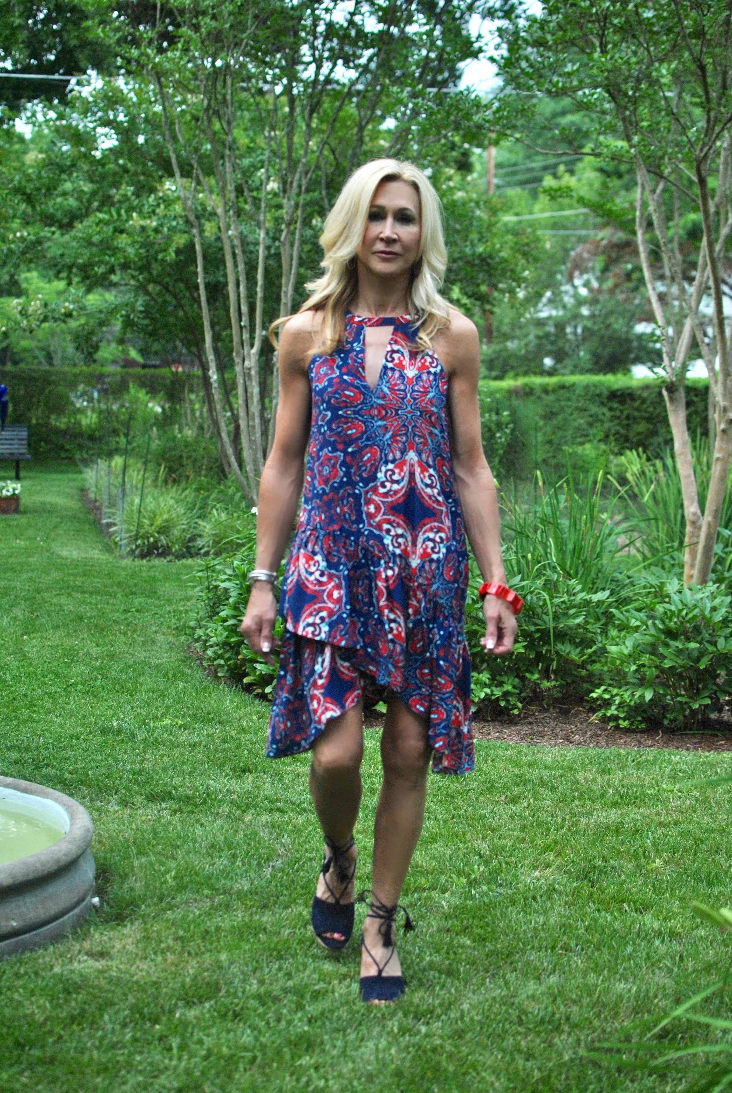 This patriotic dress from Parker is also from last season, but when I got my new Cabi shoes (yes they are making shoes now), I was thrilled to see that the colors were perfect with the dress. I love mixing prints and this combo could be better. My bracelet is a vintage bakelite that I found in an antique store last year.