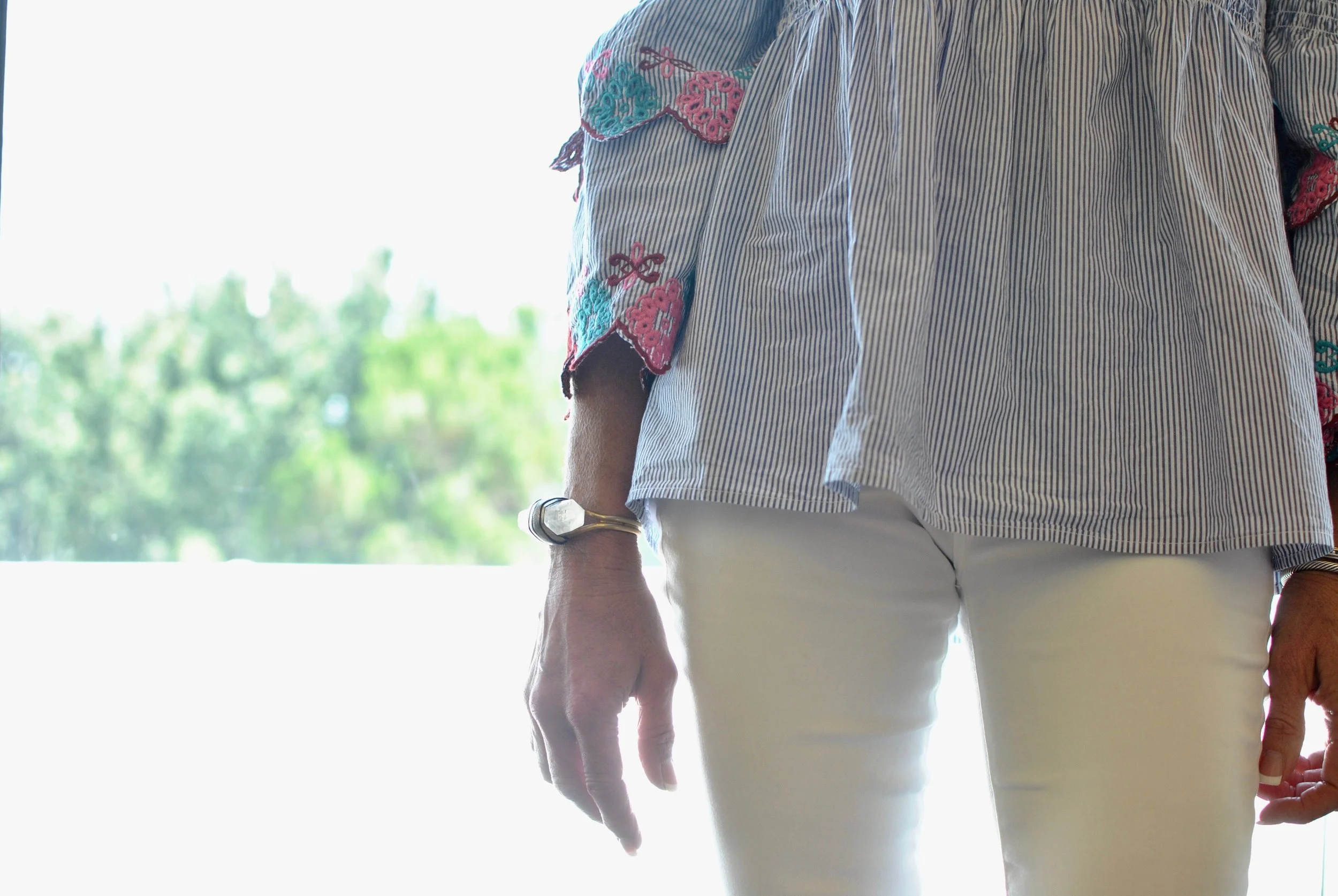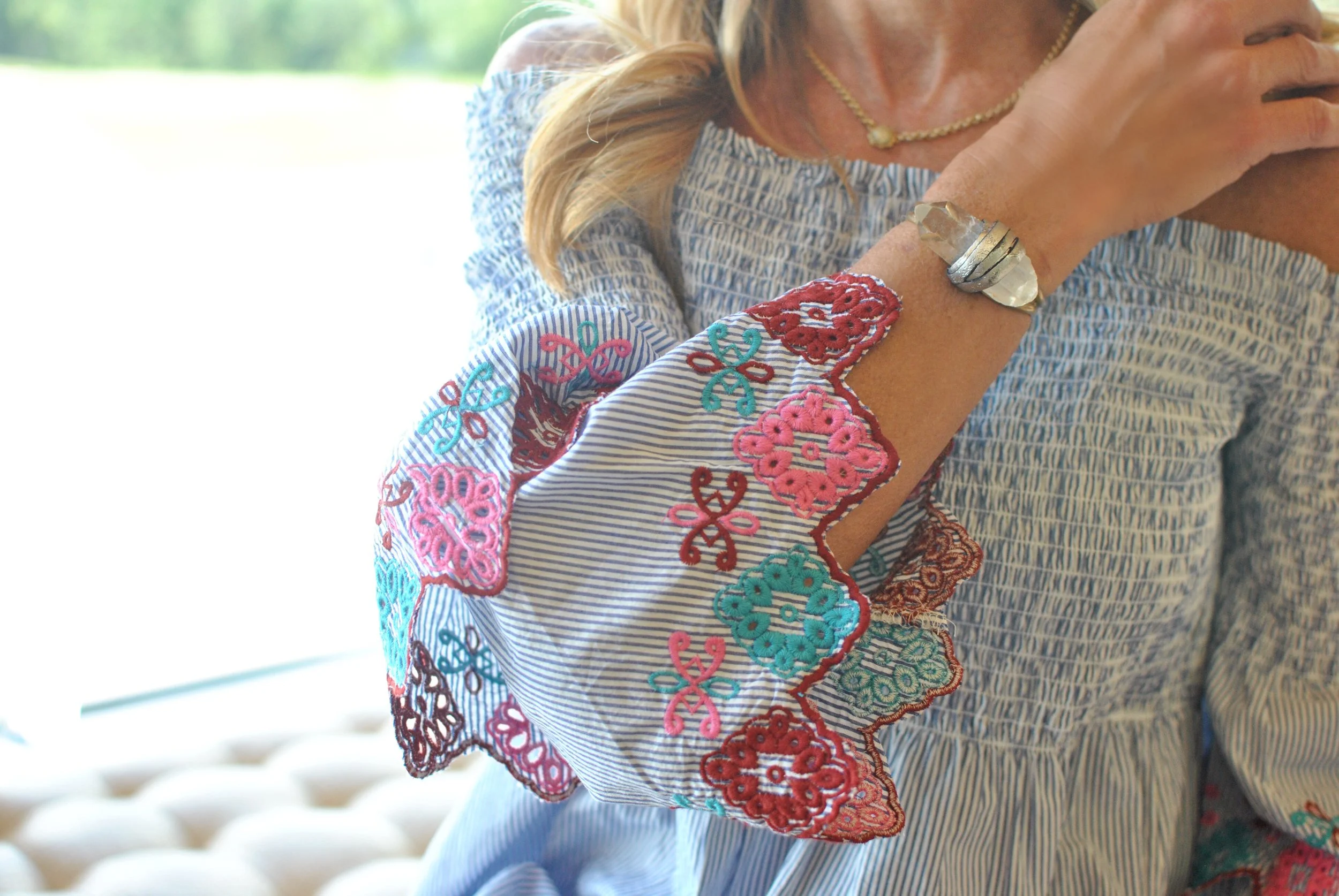 Hi Everyone! I wanted to share this great off the shoulder top that I wore while in Orlando today. Hotels are always way too cold for me and I froze the whole time I was gone. It was too cold inside and very hot outside, so not much happy medium! This top was actually the warmest thing that I brought, but still not quite enough for the freezing temperatures inside! Anyway, I met a cute girl who was a photographer and she shot the pictures for me. The fit of this top is really great! It stayed put, unlike some off the shoulder tops and I love the embroidery detail on the sleeves. I put a picture on Instagram and got so many questions about the top and my bracelet that I wanted to do a post about them.