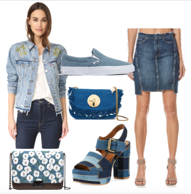 Levi's Denim Jacket, See by Chloe Bag (similar), Van's Denim Shoes, Paige Denim Skirt, See by Chloe Denim Platform Sandal, Loeffler Randal Floral Denim Bag