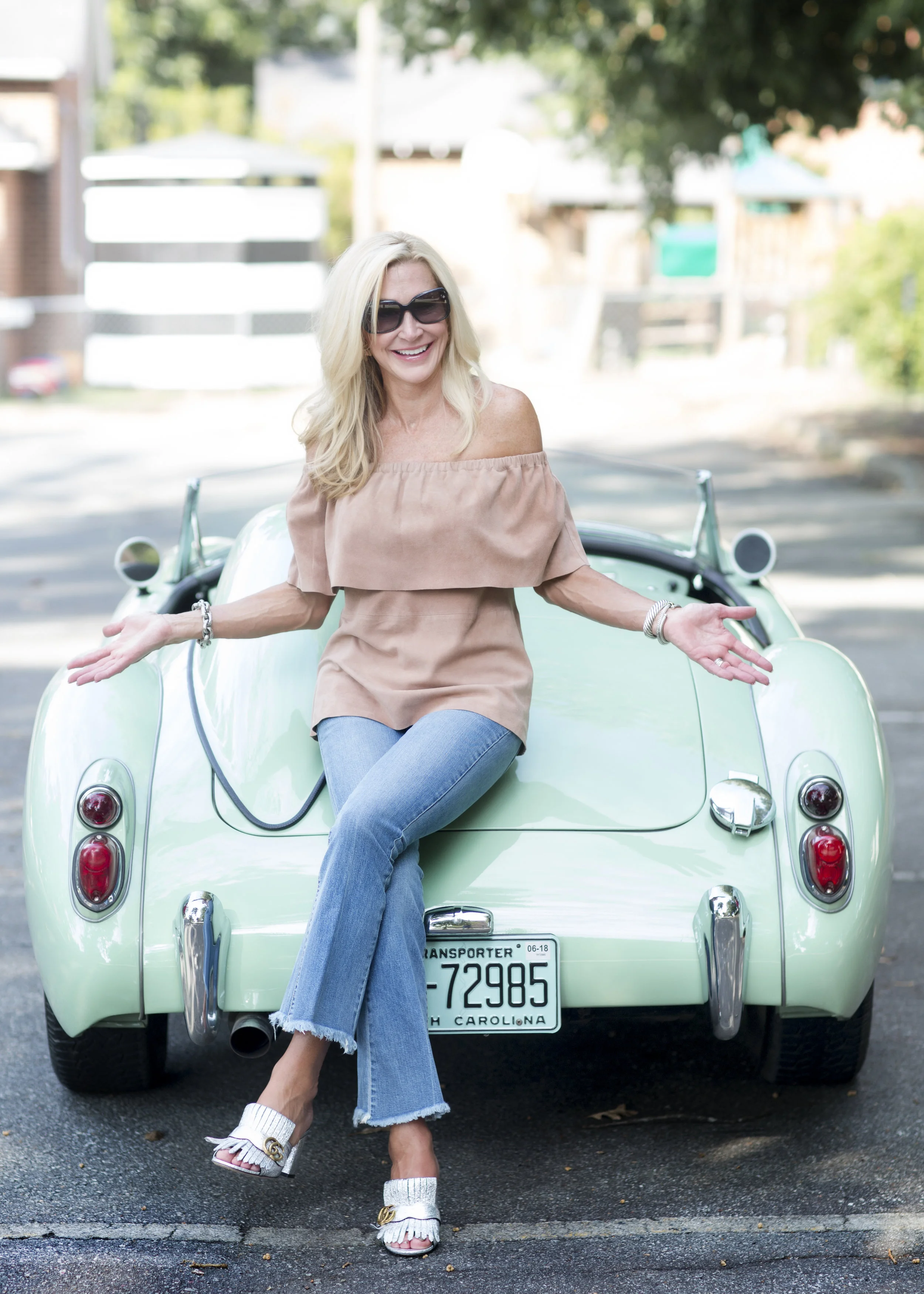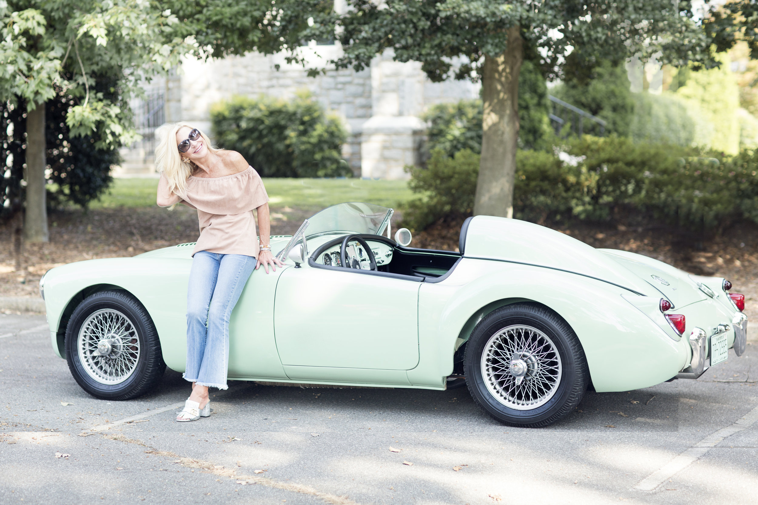 Sometimes you start off the day thinking it will be an ordinary day, and then it turns into a really extraordinary day! I was having coffee with my friend and photographer, Sara-Anne and we were discussing some upcoming photographs and I got the idea to borrow a cute car to compliment some fall fashion pictures. I called someone who I thought could help and it wasn't long before I was dressed and sitting in one of the cutest cars ever! This car is a 1960 MG that has been completely redone. Not only did I get to take these pictures in the car, but I got to drive it when we were finished. I learned to drive with a stick shift car and I guess it's just like riding a bike because it all came back to me when I started to drive.