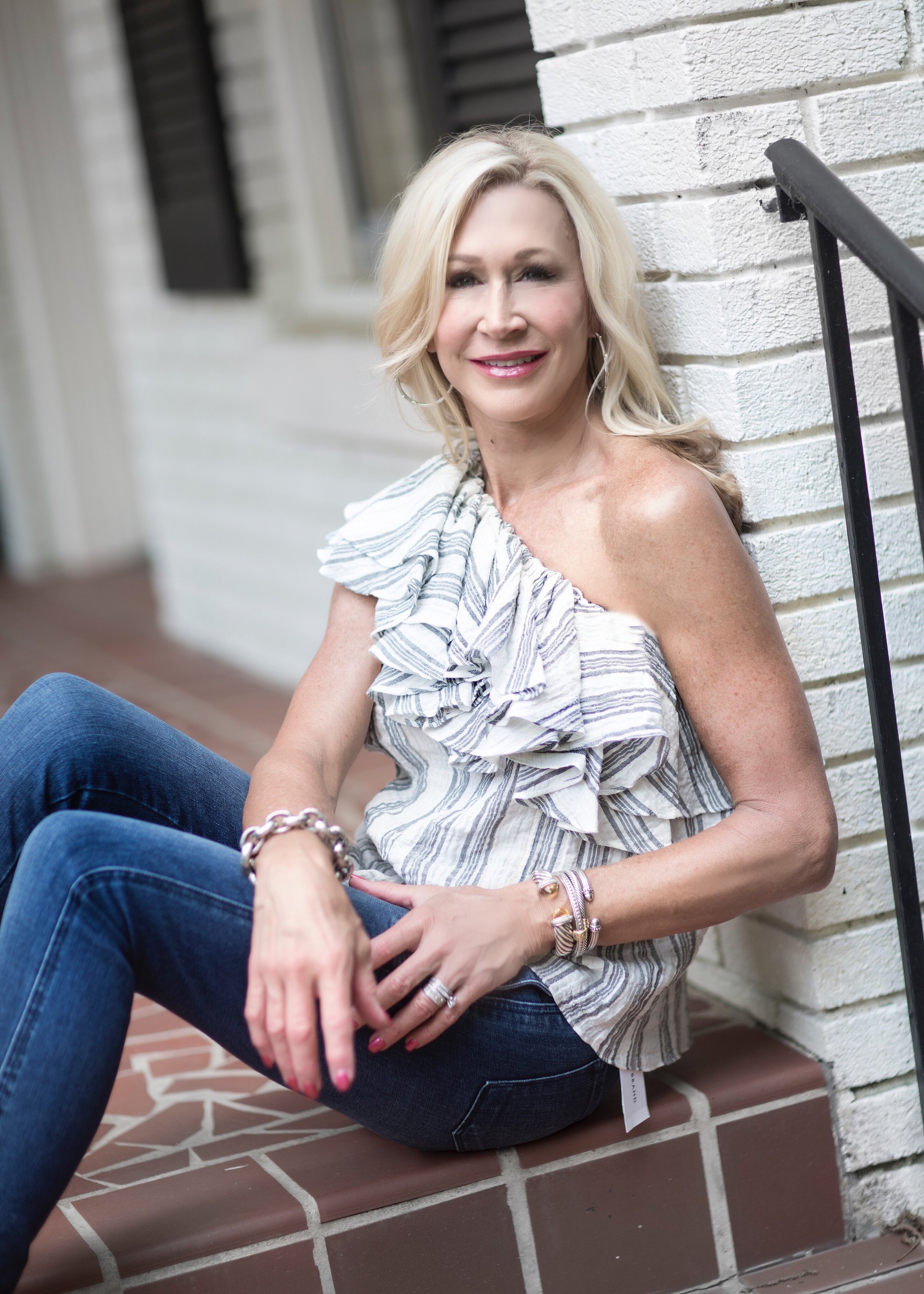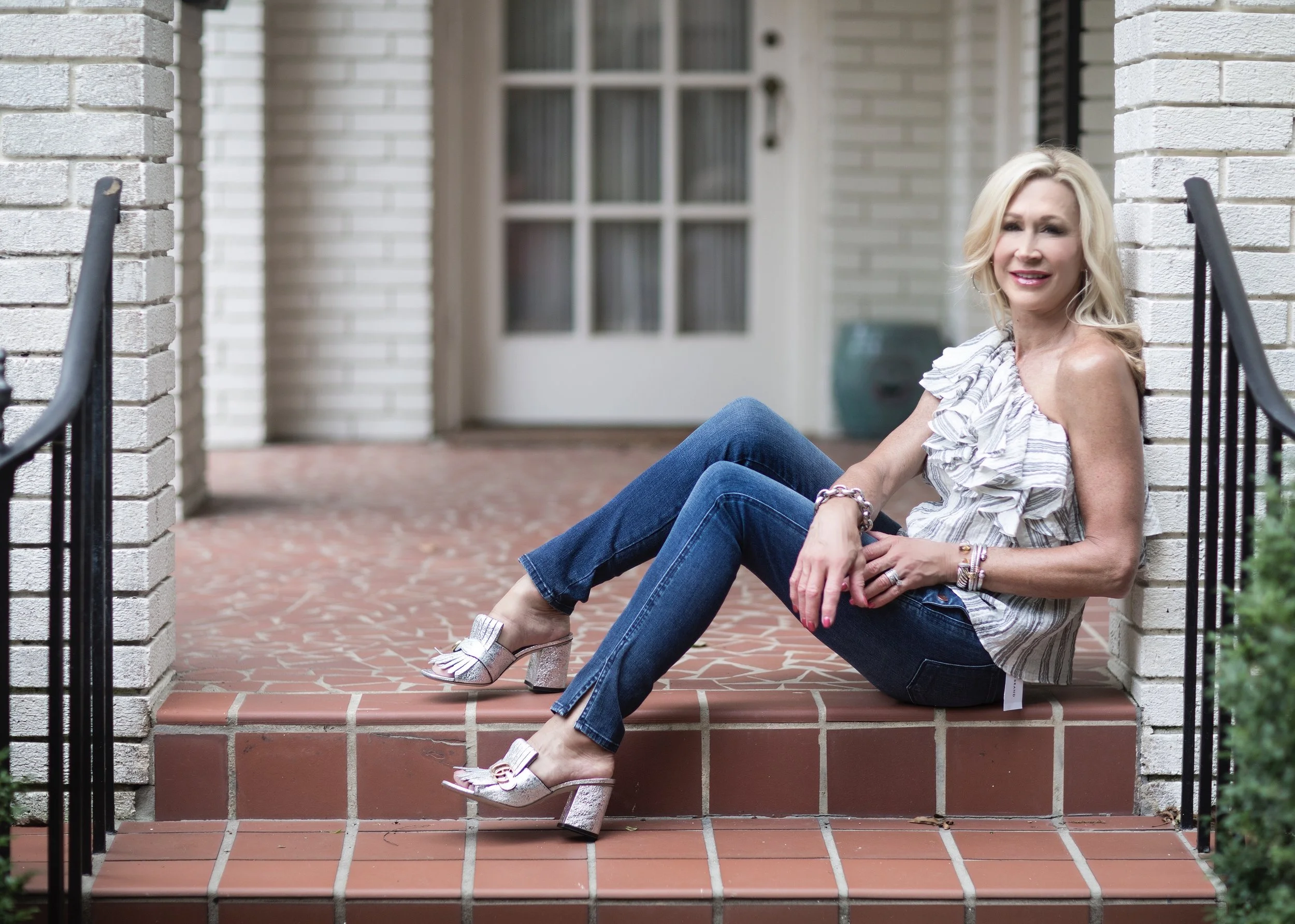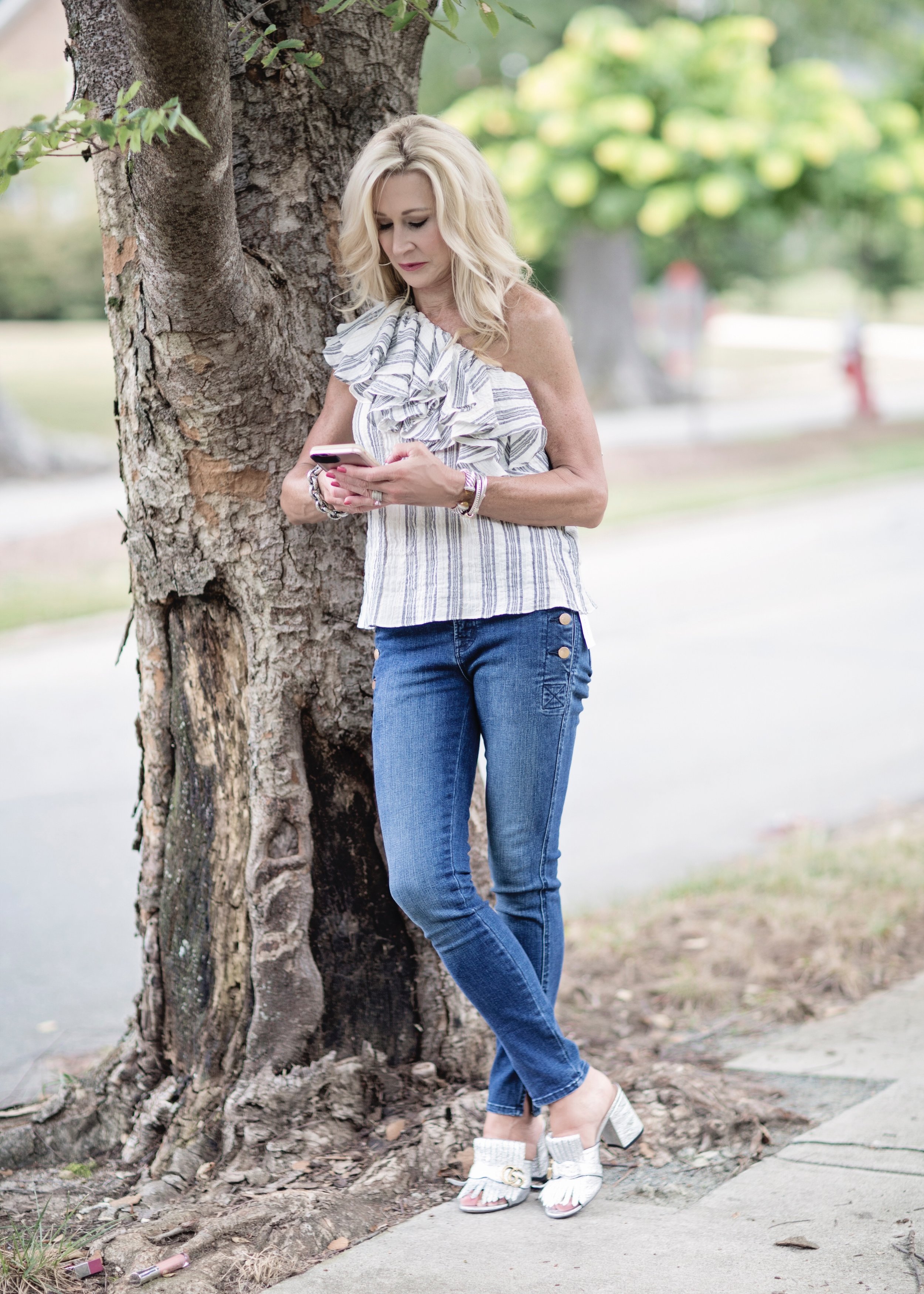 I stopped into Rebecca & Co. in Greensboro, NC a few days ago and they had so many great things to choose from (with more coming in every day) that I had a hard time making up my mind! The outfit featured today was a no brainer and will be great for so transitioning into fall. I will always love denim and as I've been saying, right now there are more options than ever before. There truly is a style for everyone! These cute jeans have an interesting "sailor like" button detail in the front and I love the off-one-shoulder top paired with them! It's a transitional outfit that can be worn while the temperatures are still warm. The shoes...what can I say, they are fabulous and go with absolutely everything! They are "Dorothy shoes" in silver! Keep scrolling to shop these items and more!