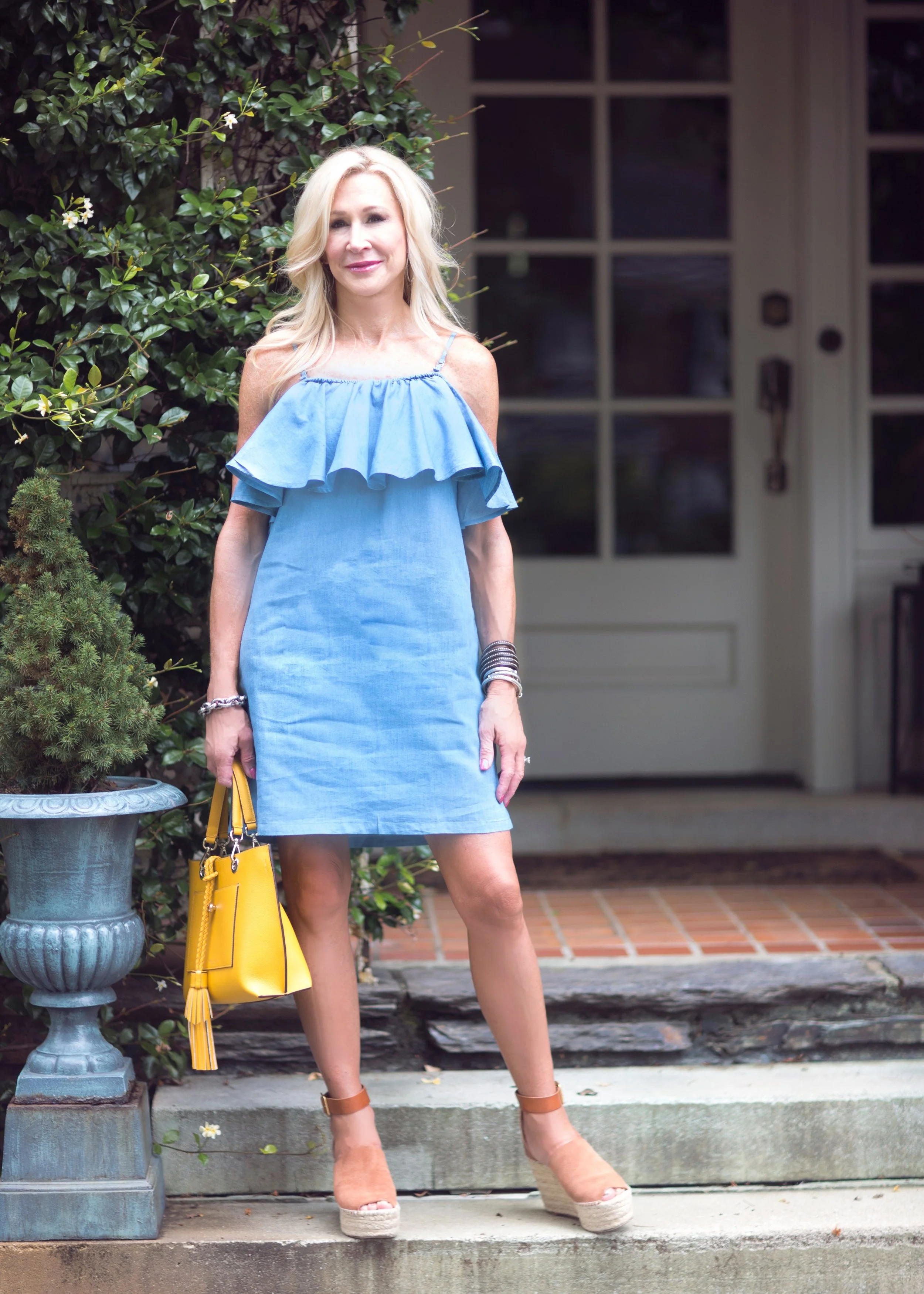 Good morning everyone! Even though I've talking about transitional fashion lately, summer isn't over quite yet! The other day, I pulled out this lightweight denim dress that I got while we were on vacation at Bald Head Island and while it is a summer dress, it could go into fall with the addition of booties and possibly a different bag. I love the ruffle and the pockets (you probably can't see those) and it's a great dress for running around town and getting things done. I felt like I looked cute but was still comfortable. I've been trying hard lately to put a little more effort into my daily outfits! Sadly, the dress is no longer available, but I found some other great ones that you can shop if you keep scrolling...along with shoes and bags.