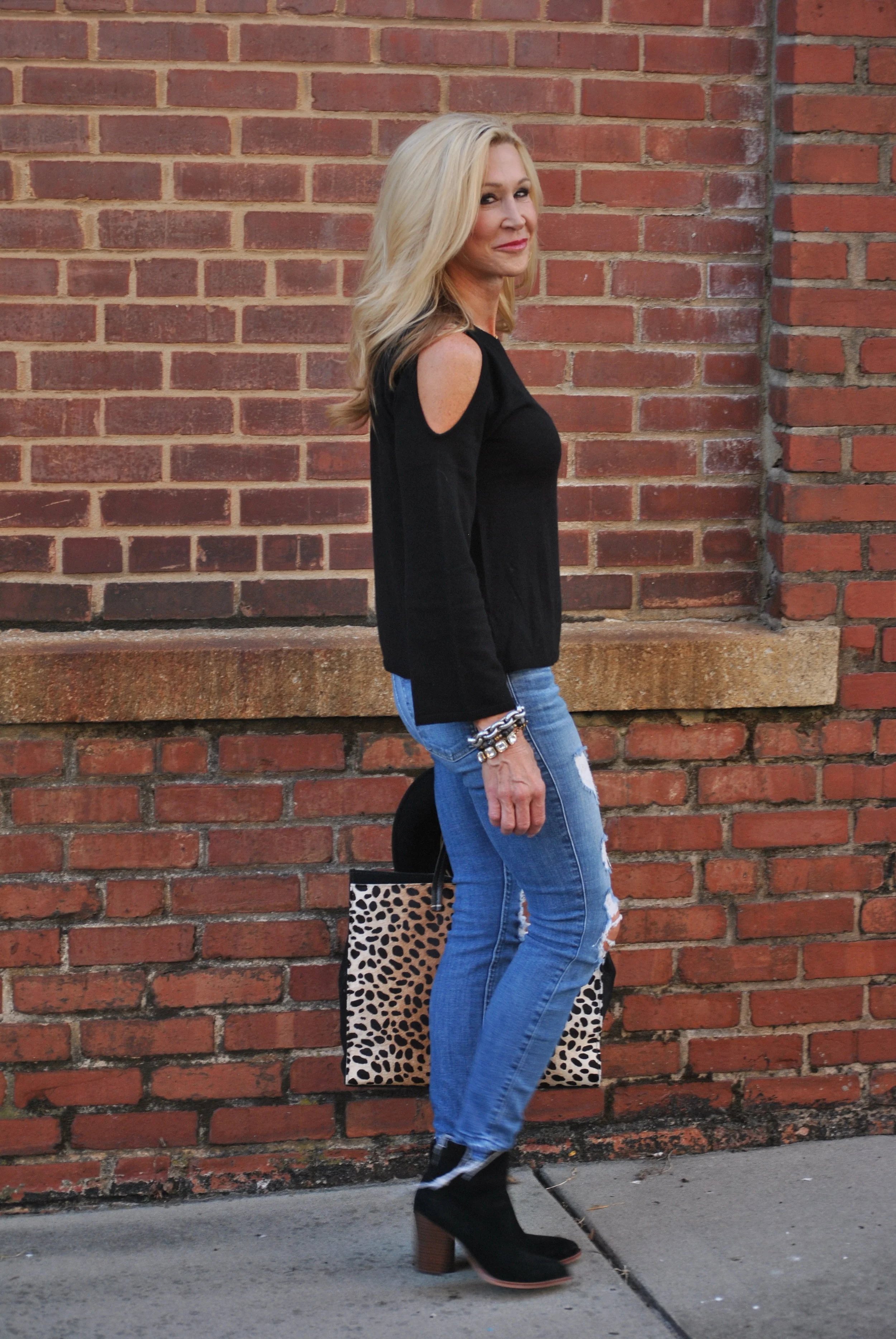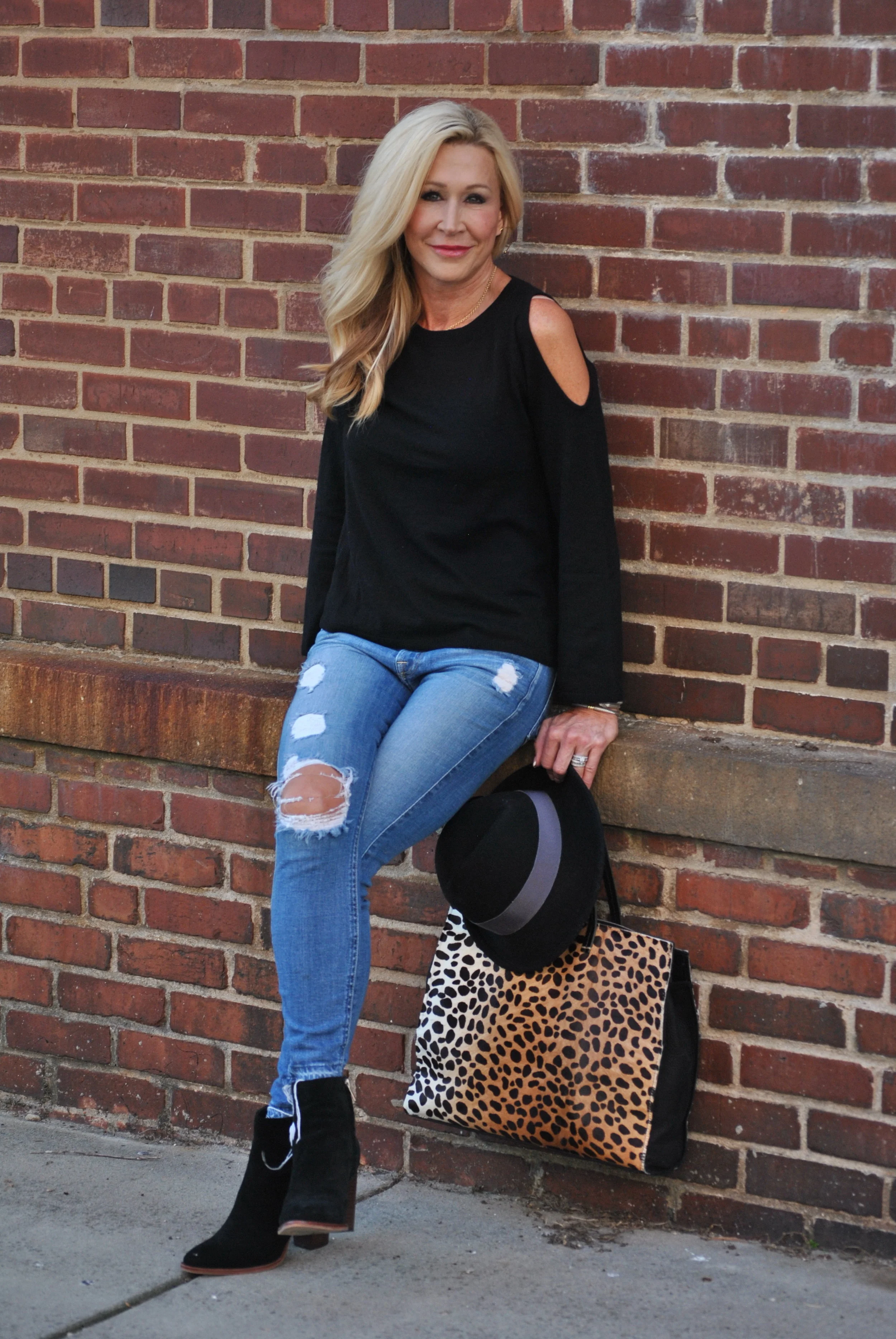 I'm wearing a Rag and Bone hat (similar here), Gap cold shoulder sweater, my favorite distressed 7 For All Mankind Jeans (I'm also obsessed with these), Sam Edelman booties from last season and a bag (kind of similar here) that I've had for years from Henri Bendel. My earrings are from Stella & Dot.