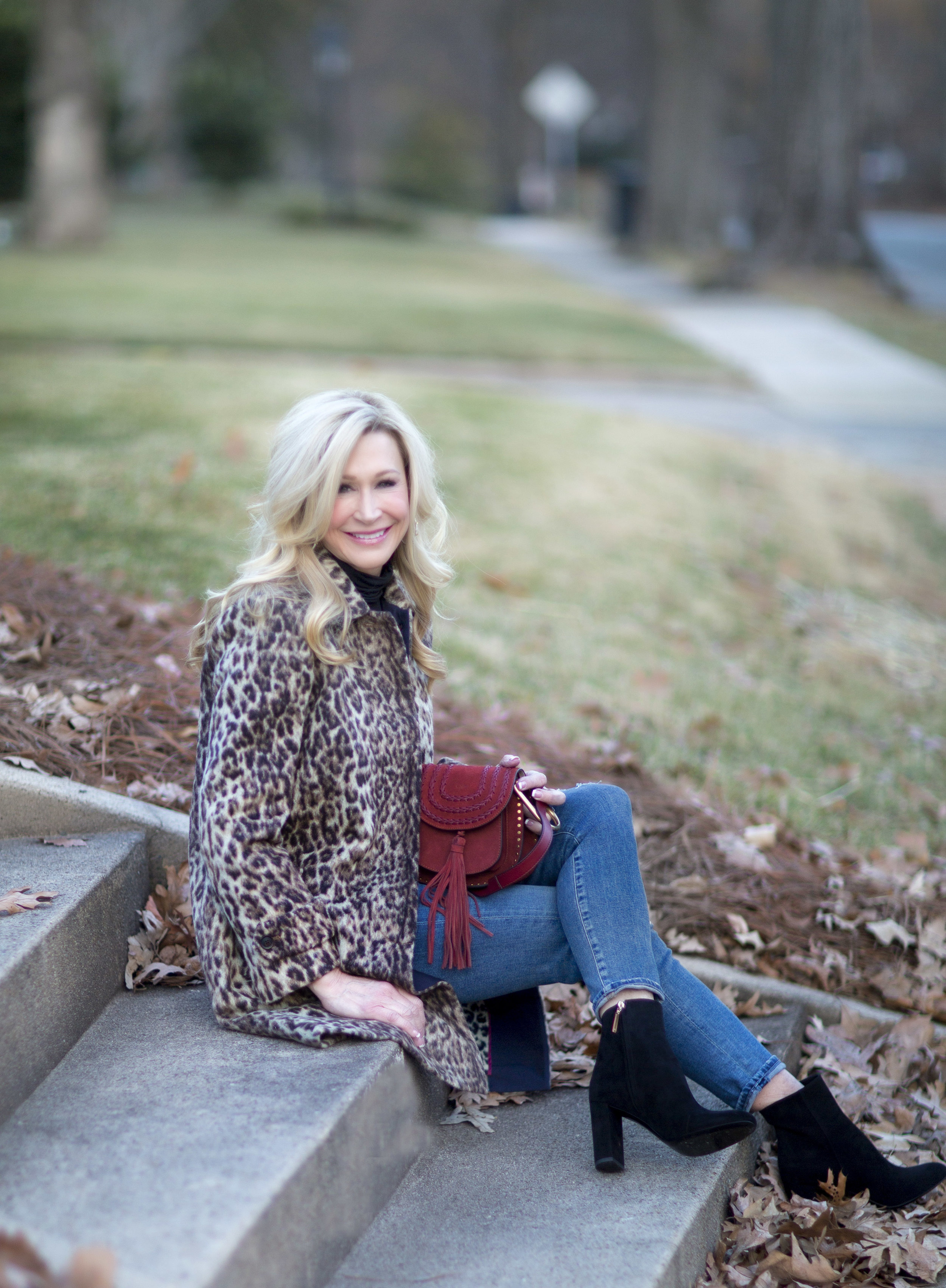 The day these pictures were taken, the temperatures were slightly warmer and we took the opportunity to get outside while the weather allowed. If it had been too much colder, I probably would have worn over-the-knee boots (40% off) with my leopard coat so my ankles wouldn't be exposed. This coat would also be beautiful with a cream color turtleneck, although black is such a classic look (love this one and this one which is on sale).