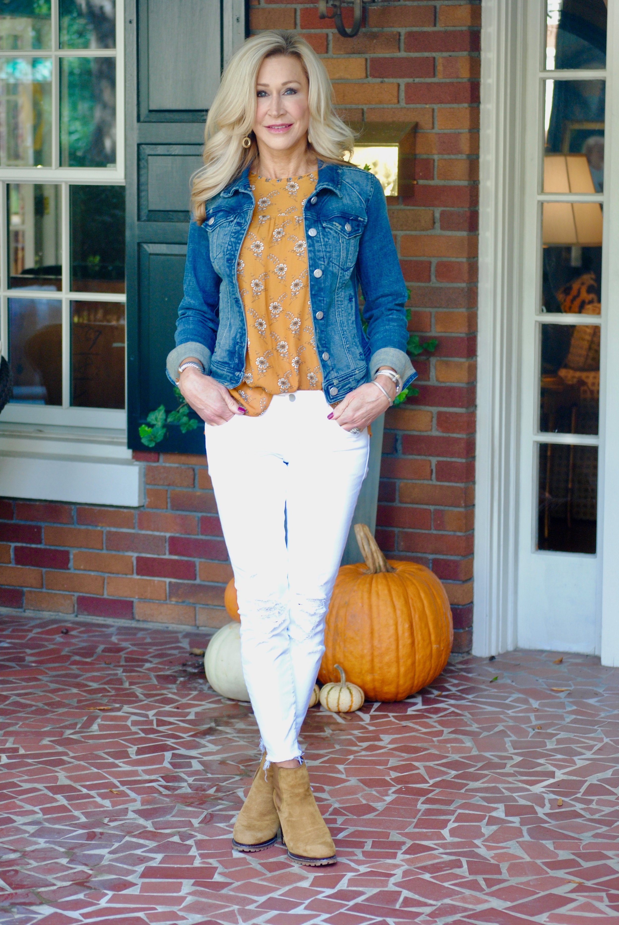 Add a little interest to your denim jacket with a printed blouse and white jeans.