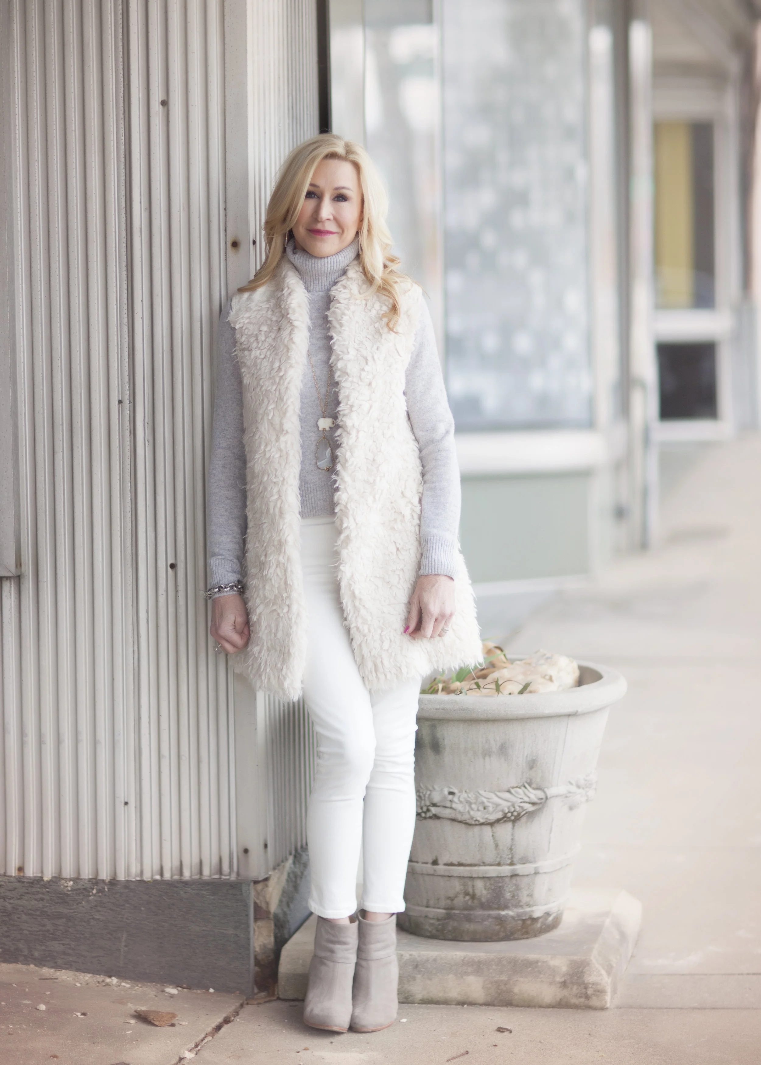 Faux Fur Vest + White Jeans + Turtleneck Sweater + Grey Booties