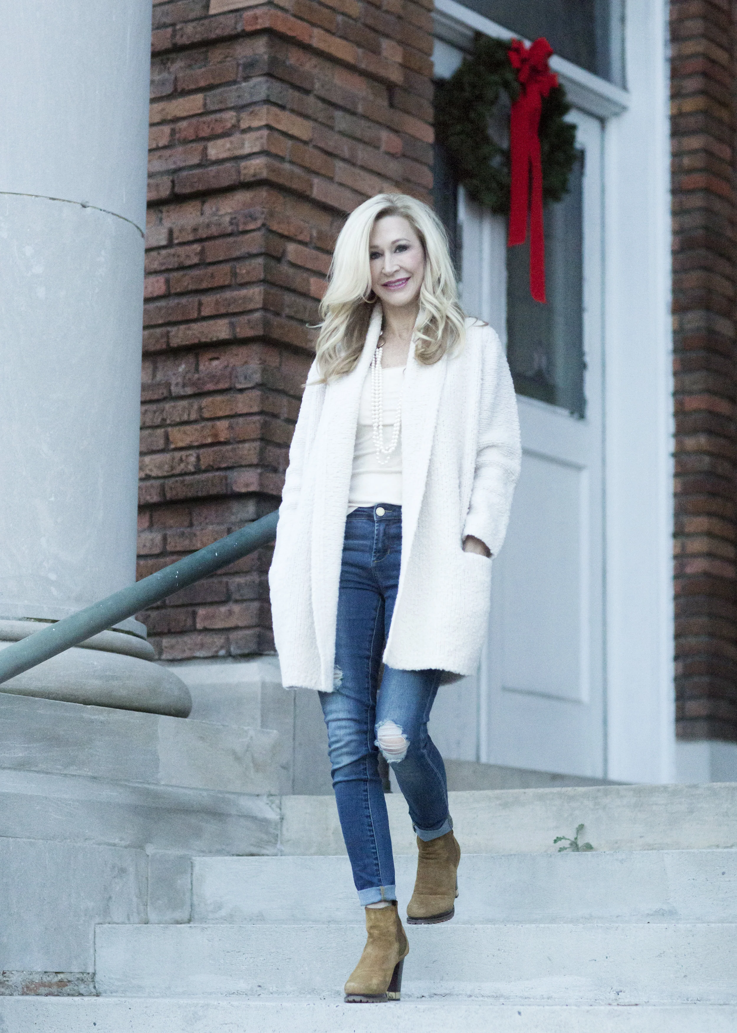 Long Cardigan + Black Distressed Jeans + Hiking Booties + Statement Bag