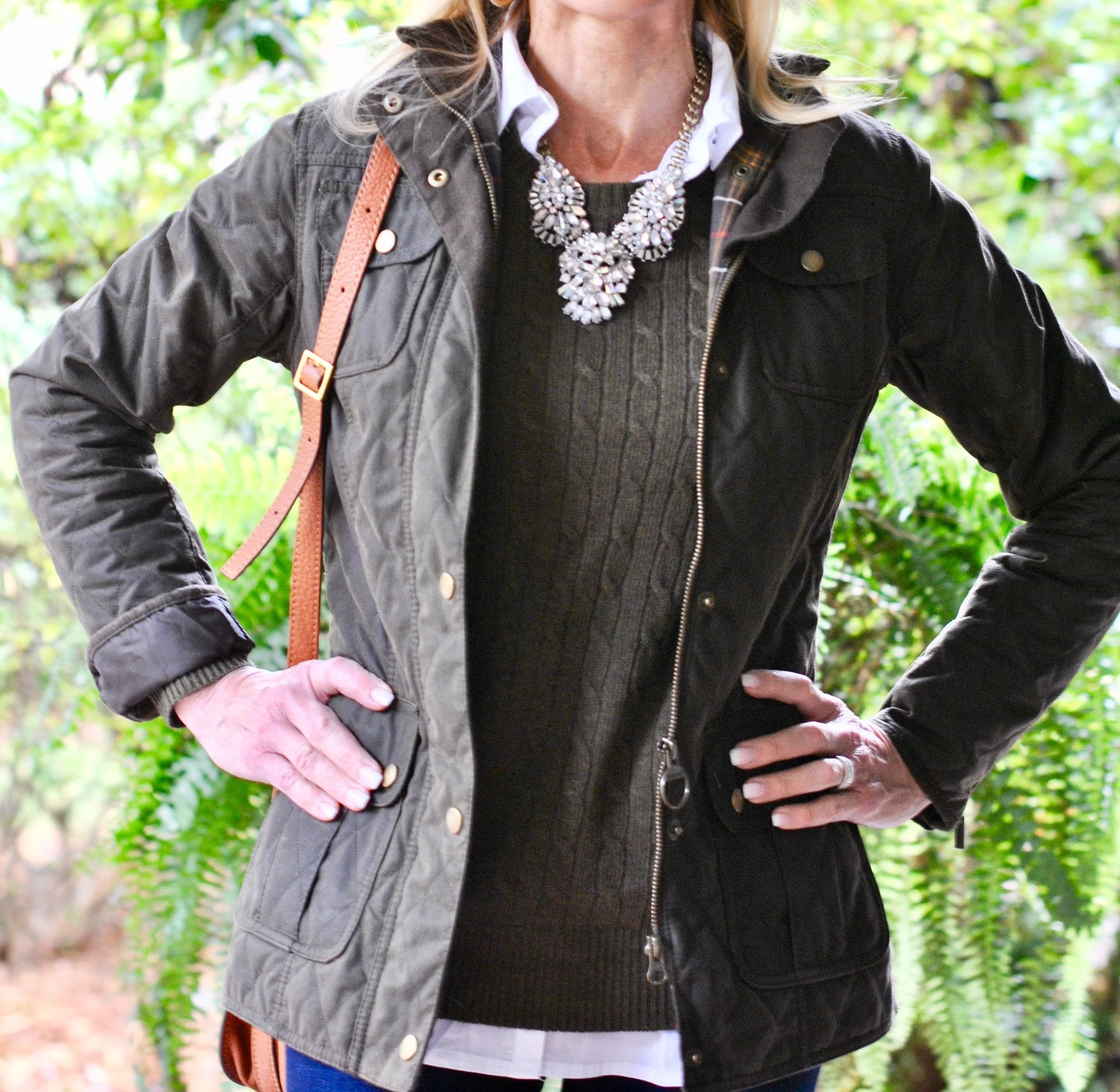 Crew Neck Sweater + White Blouse + Utility Jacket + Statement Necklace