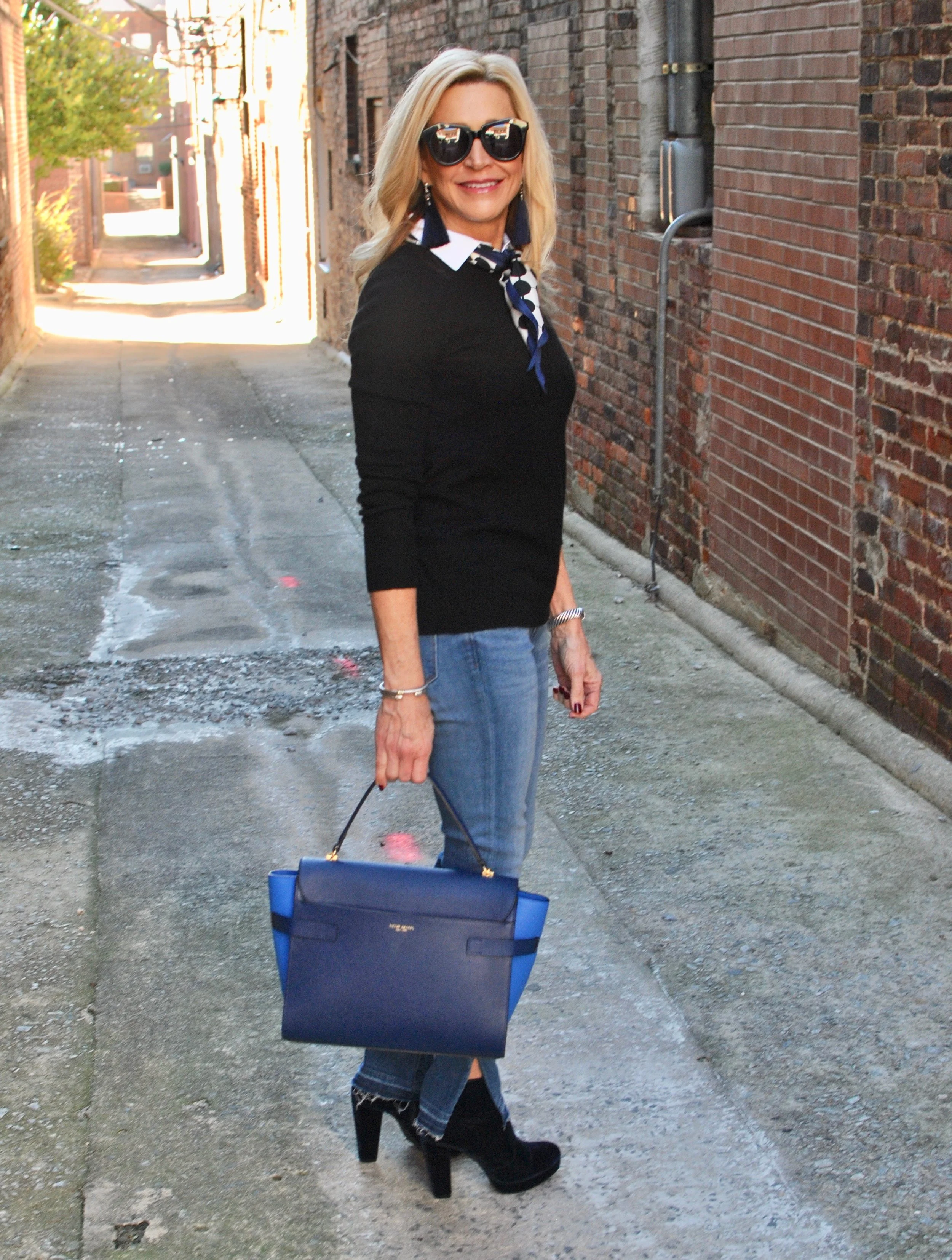 Black Sweater + Split Hem Jeans + Block Color Tote + Printed Scarf