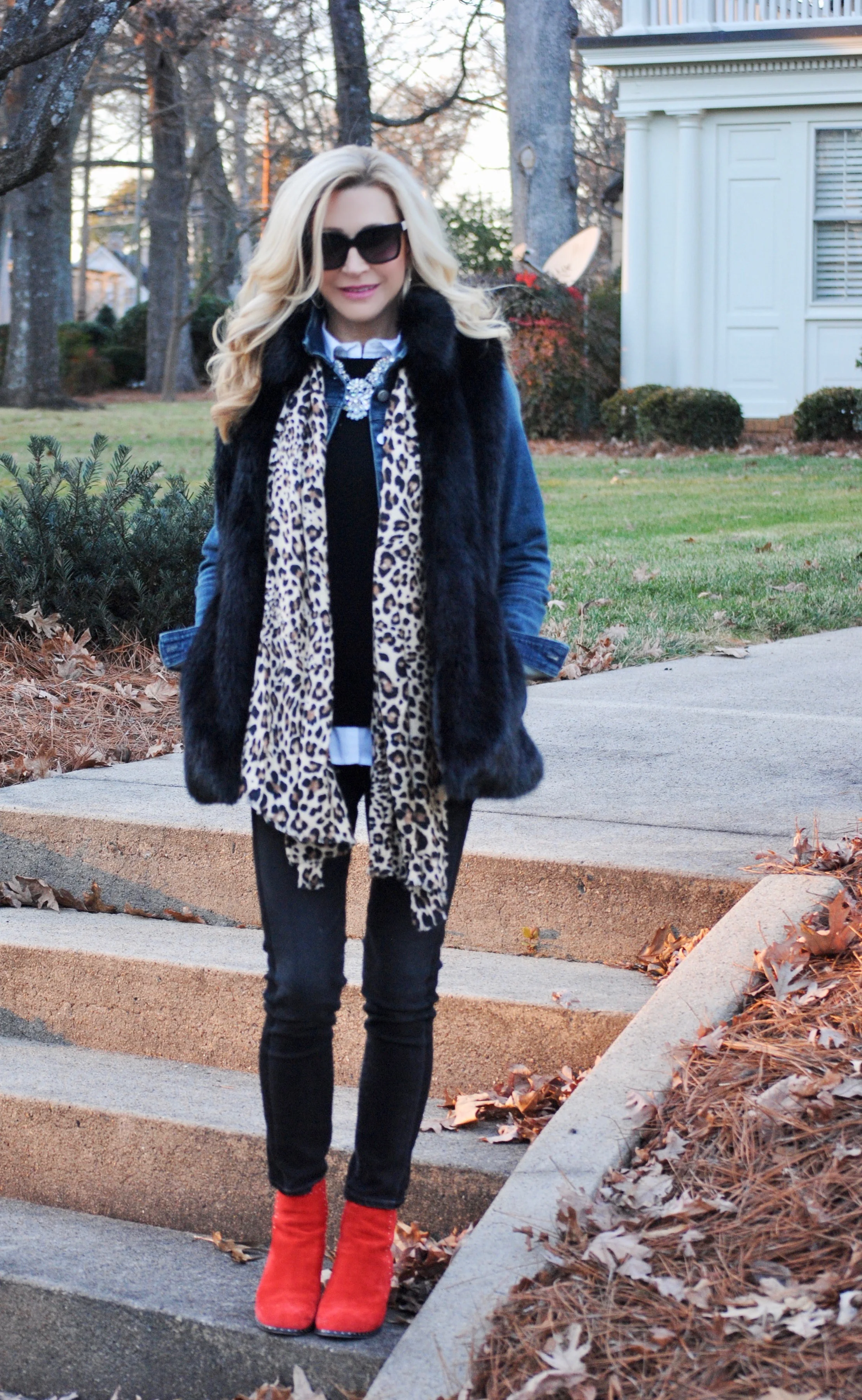White Blouse + Crew Neck Cashmere Sweater + Denim Jacket + Faux Fur Vest + Red Booties