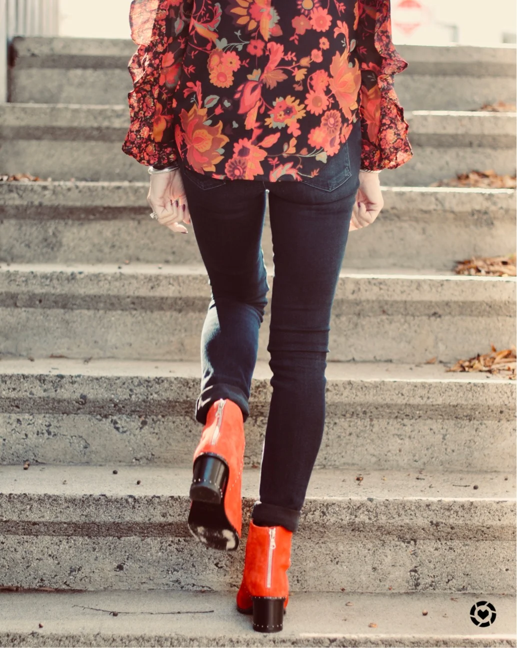 A floral blouse is always great, but add a pair of red booties and you've got a great outfit!