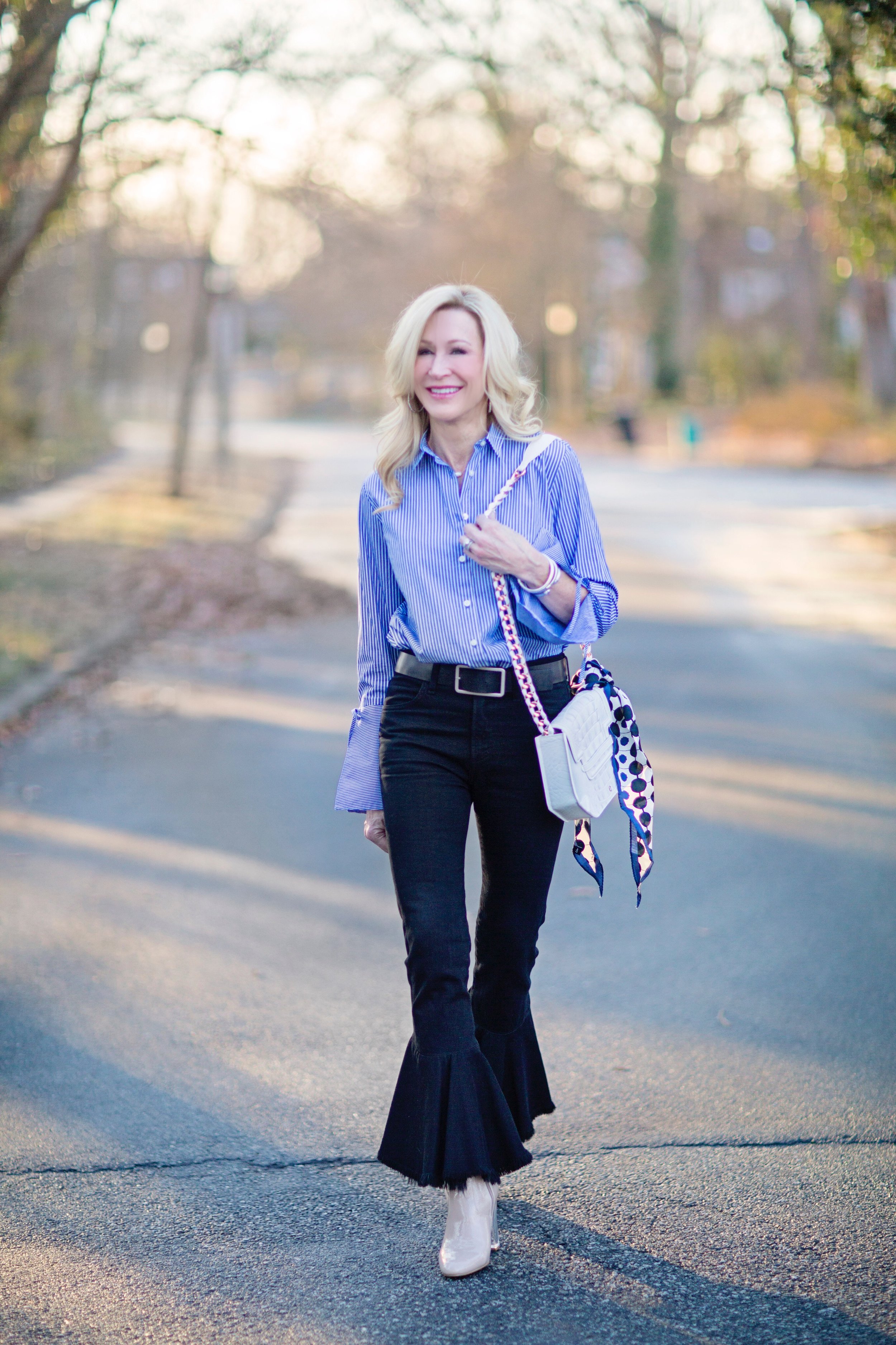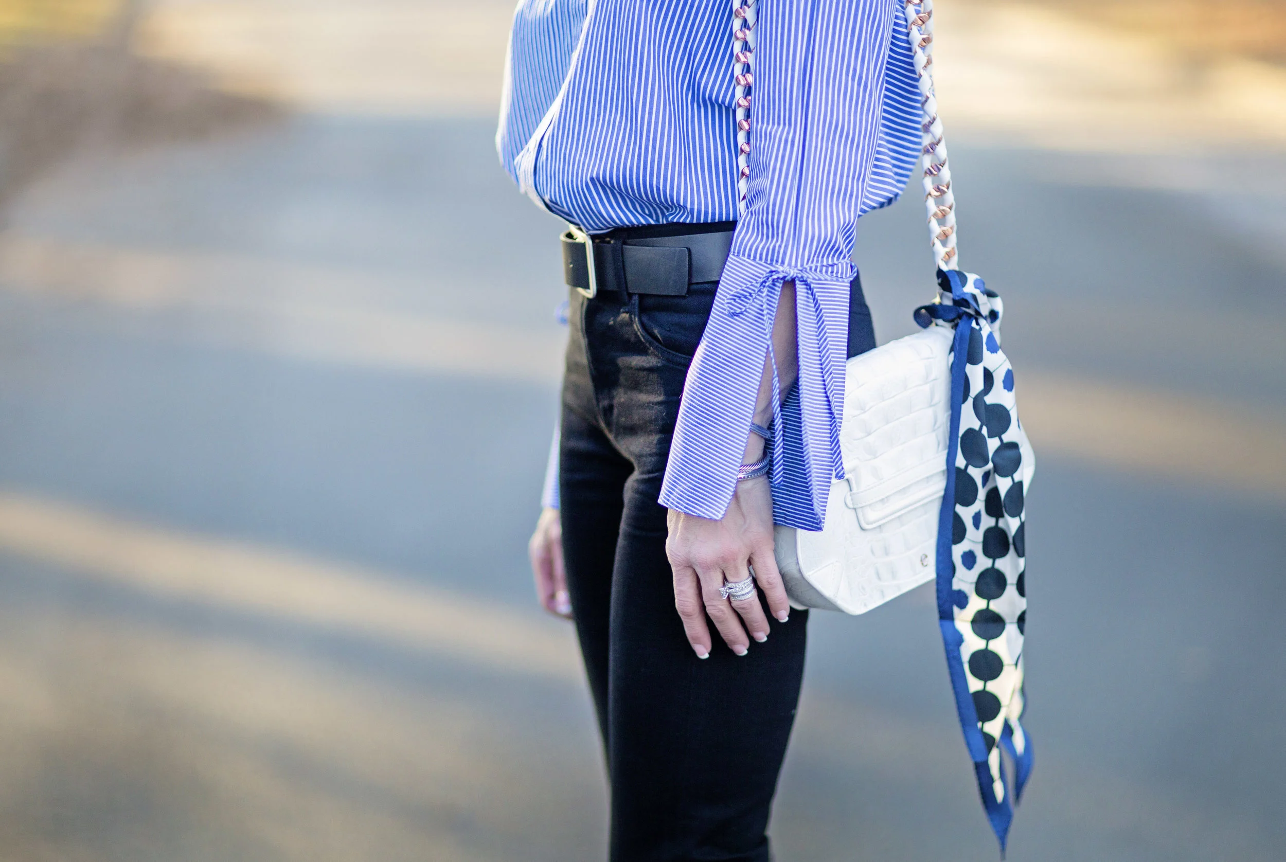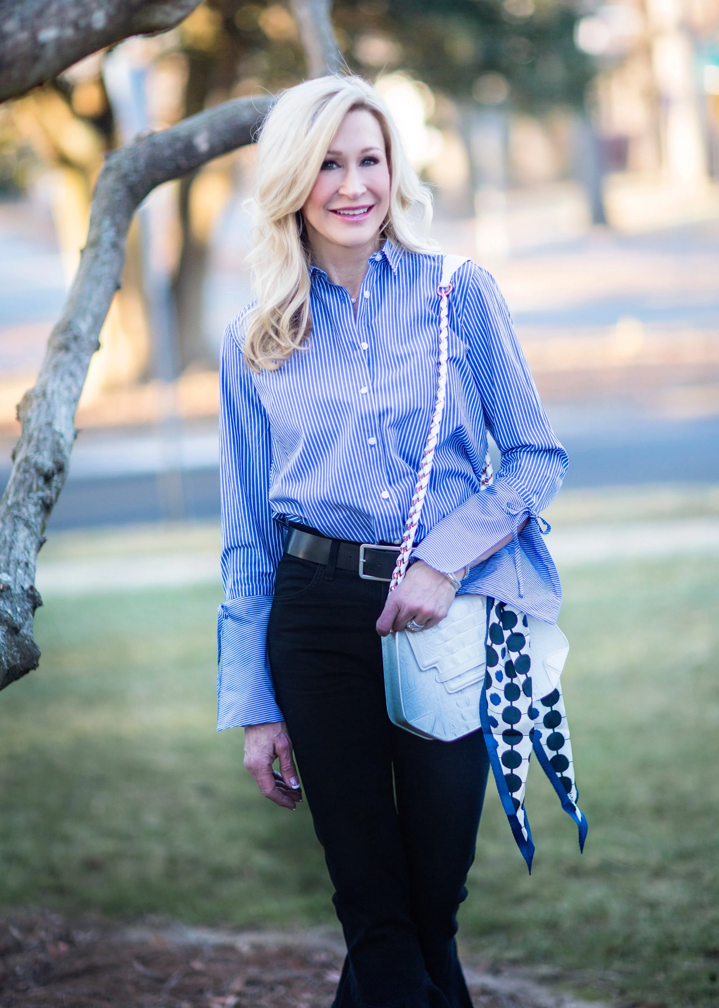 On this warm day, I wore a classic blouse with adorable statement sleeves from Loft, dark wash Citizens of Humanity jeans (on sale here), Steve Madden booties and a white bag by Ella Rabener tied with a scarf. These jeans have been favorites of mine and are so much fun to wear because they are not your typical pair of jeans. This outfit is a great example of mixing high and low. I've mixed a luxury bag with a blouse that was under $50 (and is now half price). My booties are only $80, but the jeans were somewhat of an investment. This style of jeans isn't going anywhere and will still be trending for spring, so you will see them again here! Loft is having a fabulous sale right now and I'm linking some of my favorite pieces below. This is a great chance to stock up on some things for next year as well as get a few great things for now!