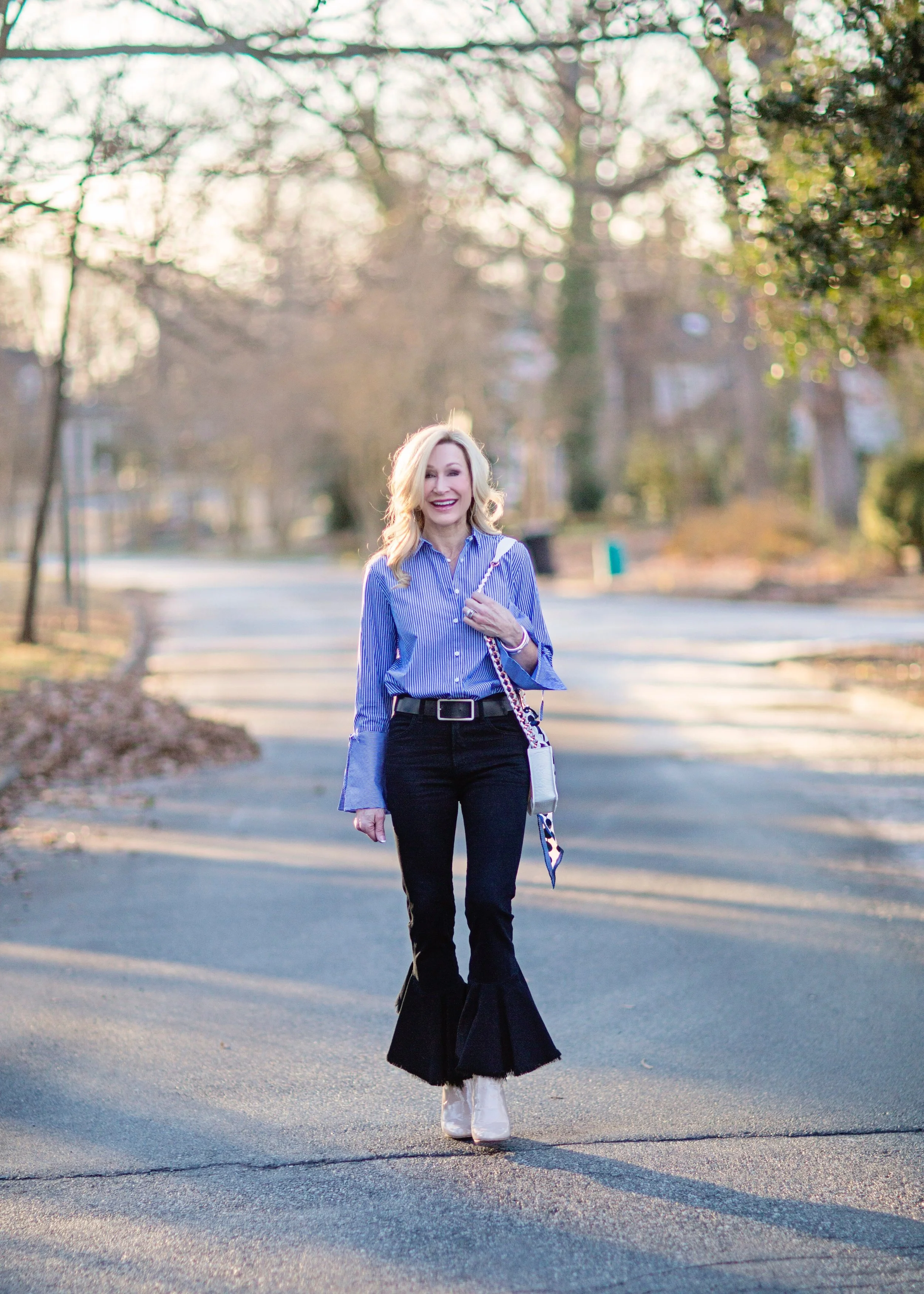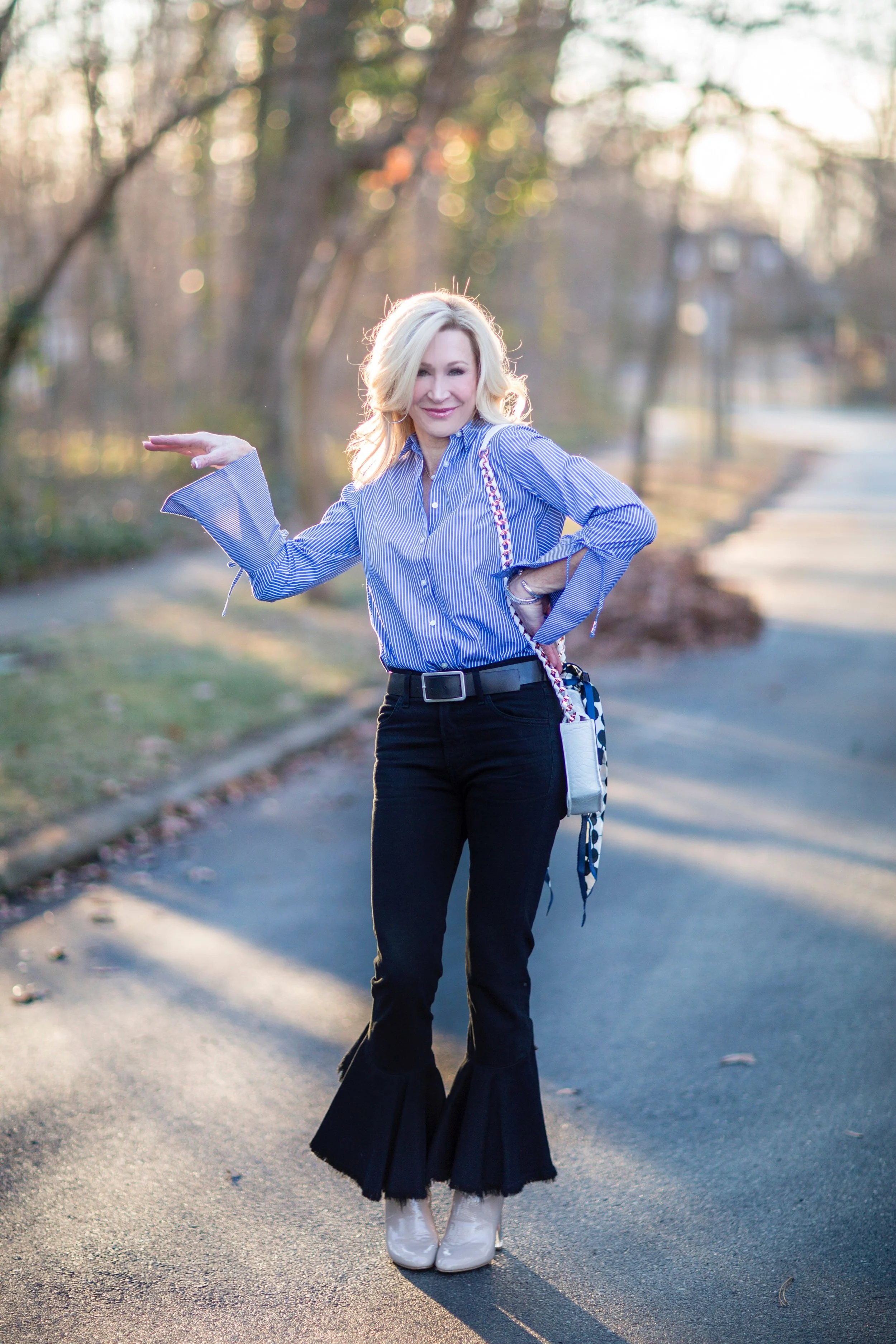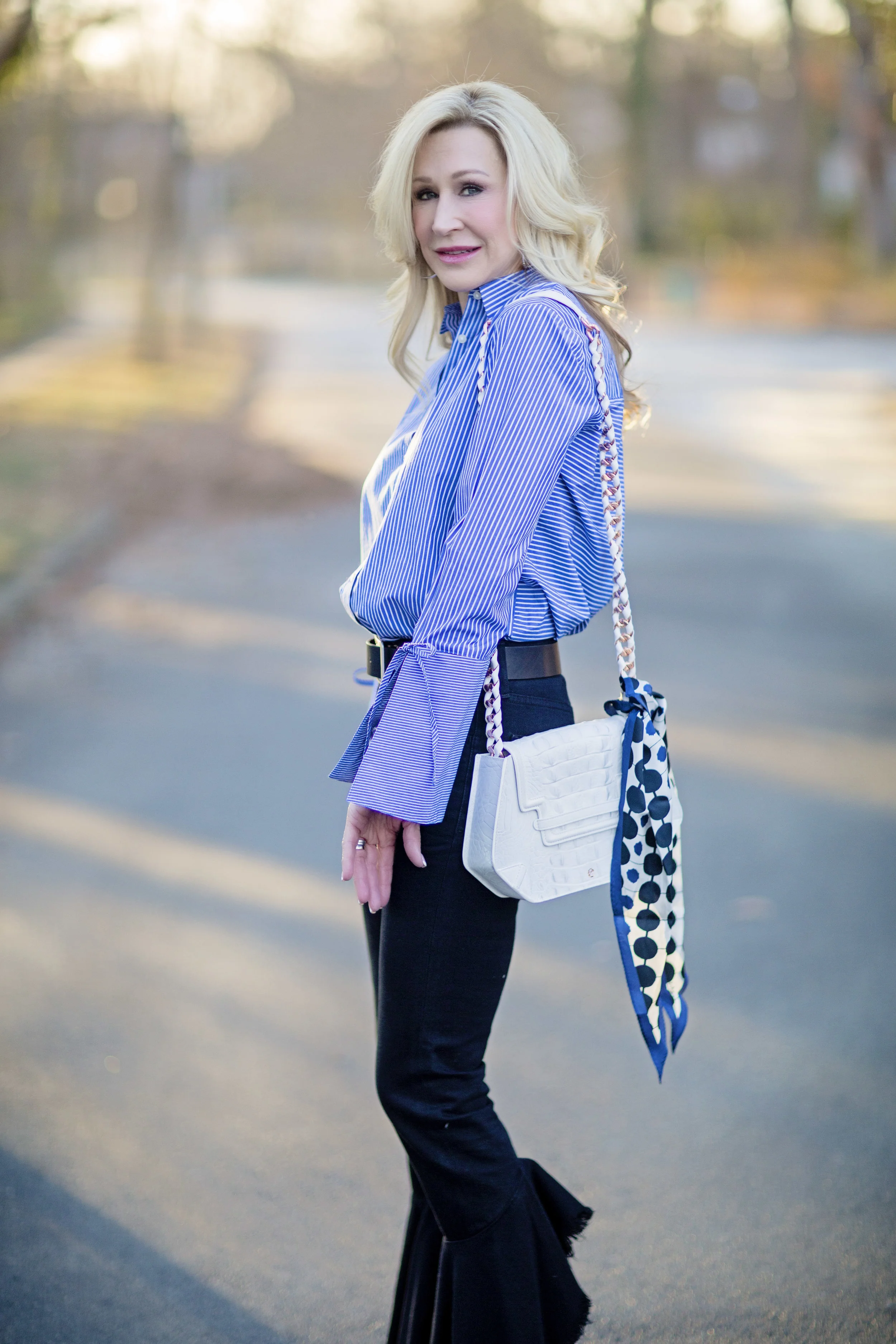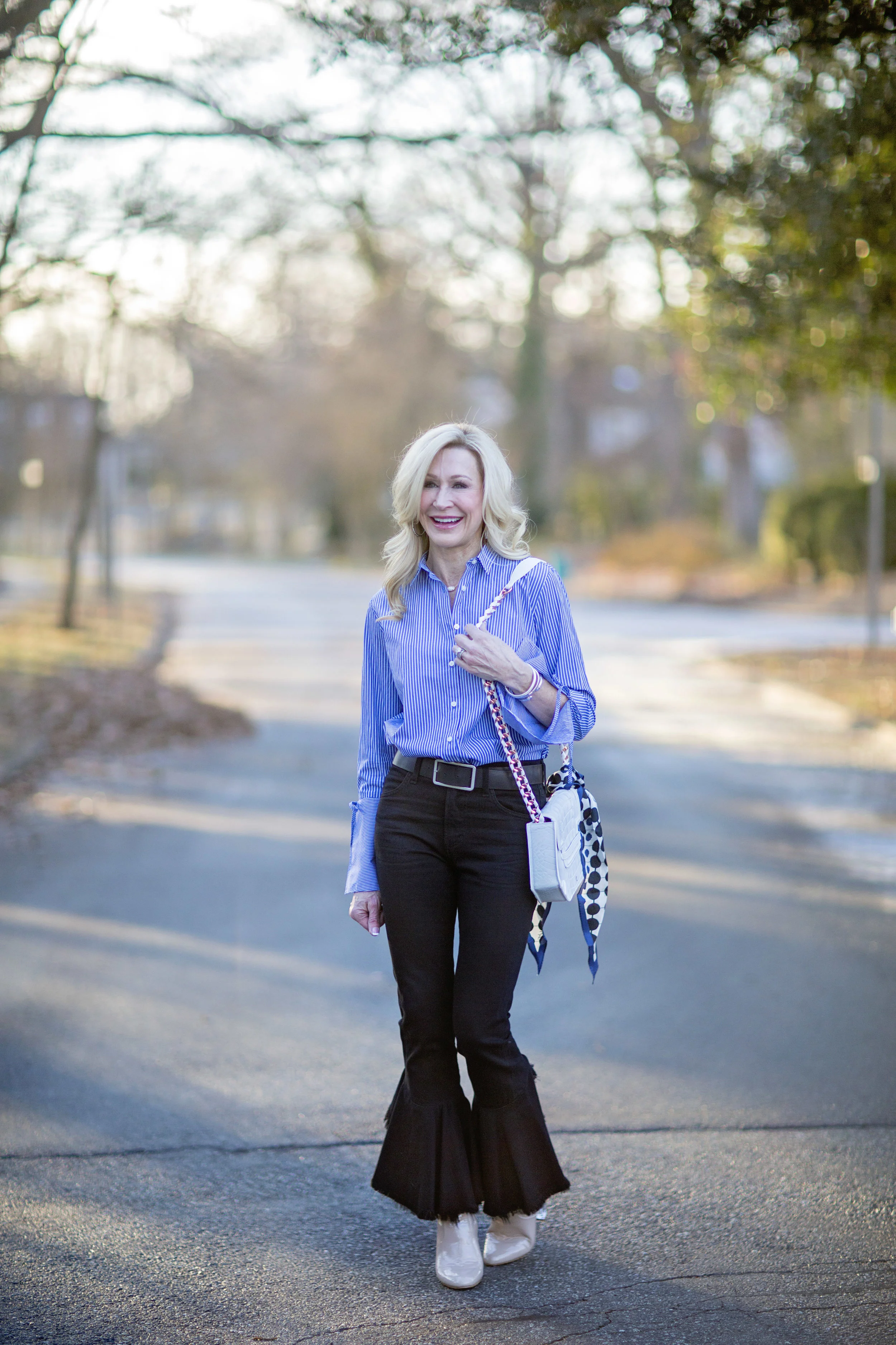 On this warm day, I wore a classic blouse with adorable statement sleeves from Loft, dark wash Citizens of Humanity jeans (on sale here), Steve Madden booties and a white bag by Ella Rabener tied with a scarf. These jeans have been favorites of mine and are so much fun to wear because they are not your typical pair of jeans. This outfit is a great example of mixing high and low. I've mixed a luxury bag with a blouse that was under $50 (and is now half price). My booties are only $80, but the jeans were somewhat of an investment. This style of jeans isn't going anywhere and will still be trending for spring, so you will see them again here! Loft is having a fabulous sale right now and I'm linking some of my favorite pieces below. This is a great chance to stock up on some things for next year as well as get a few great things for now!